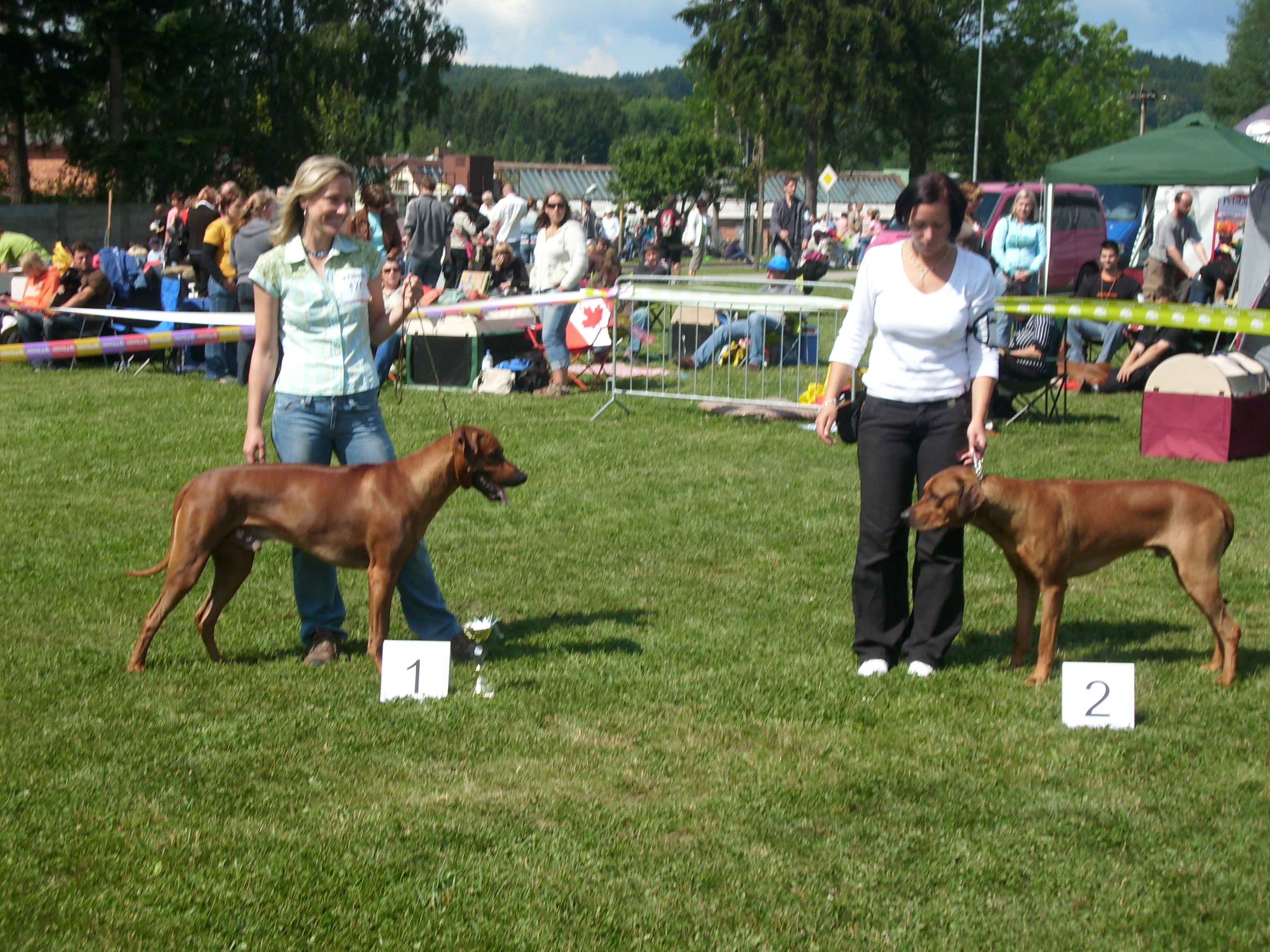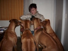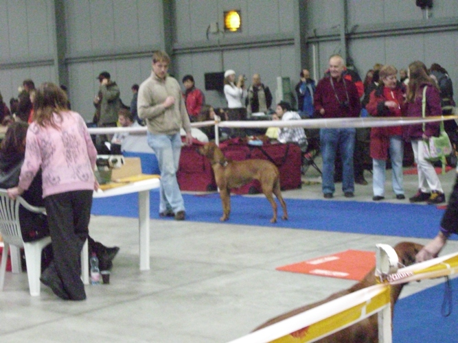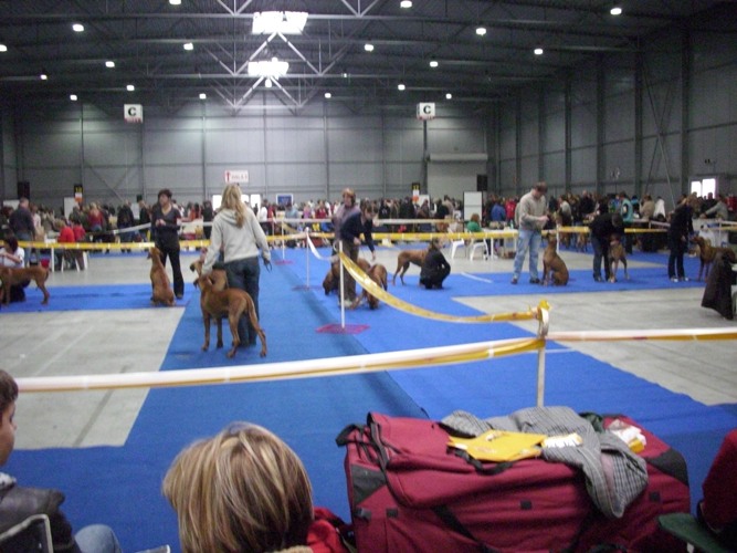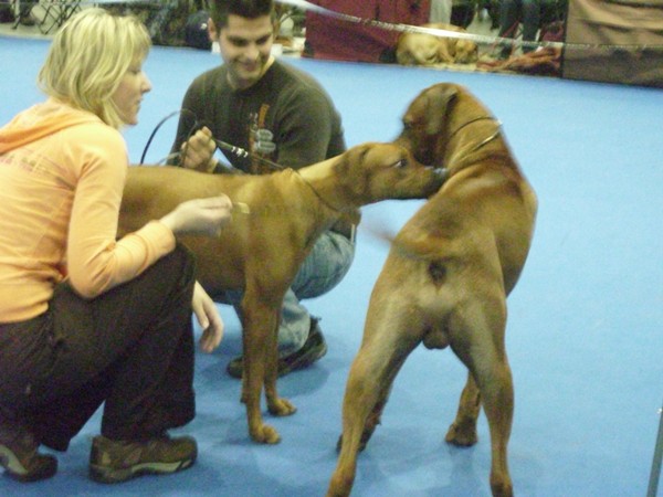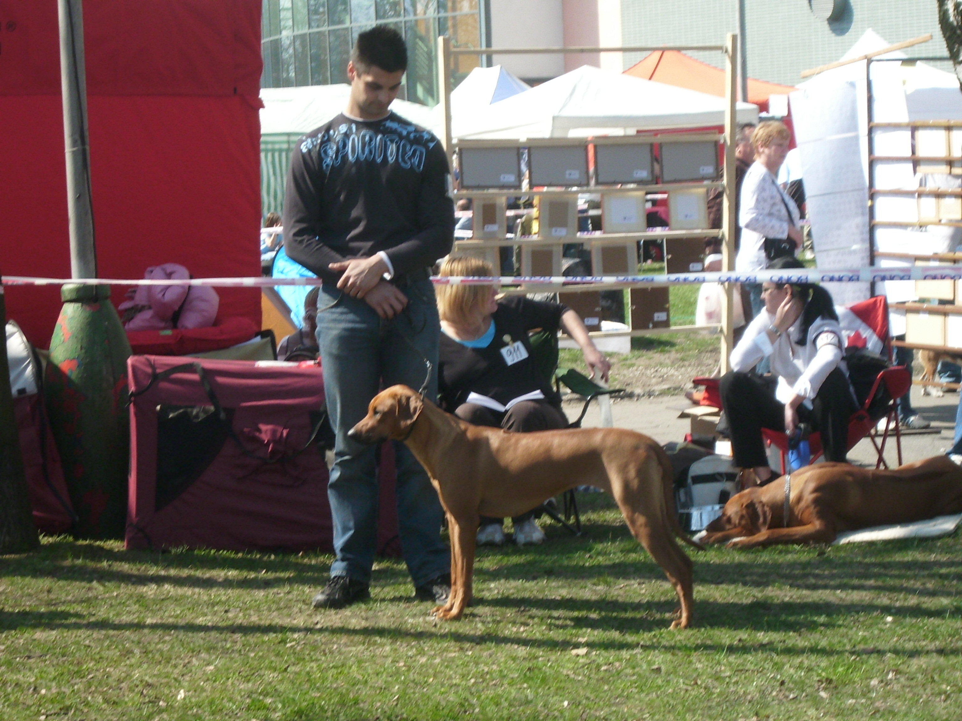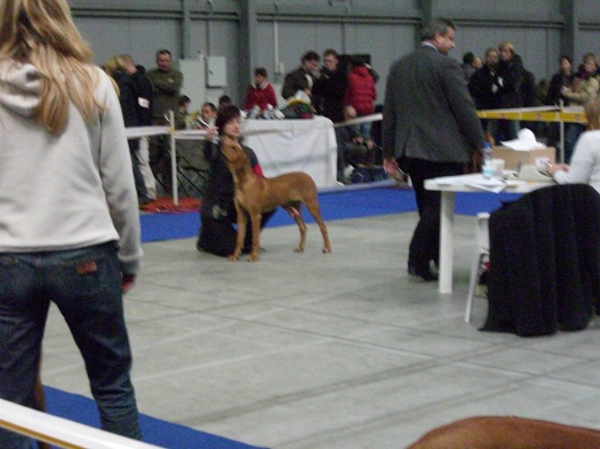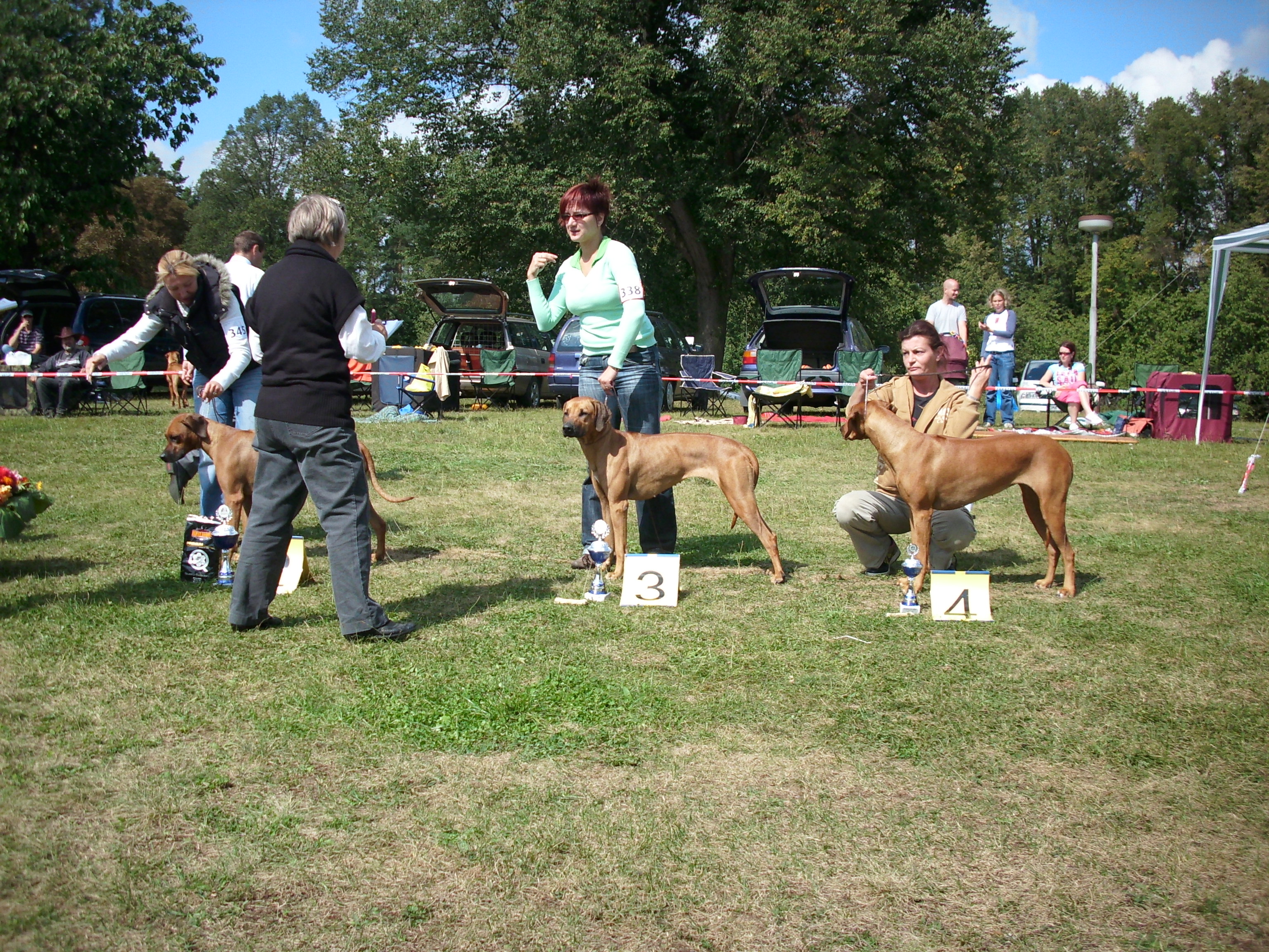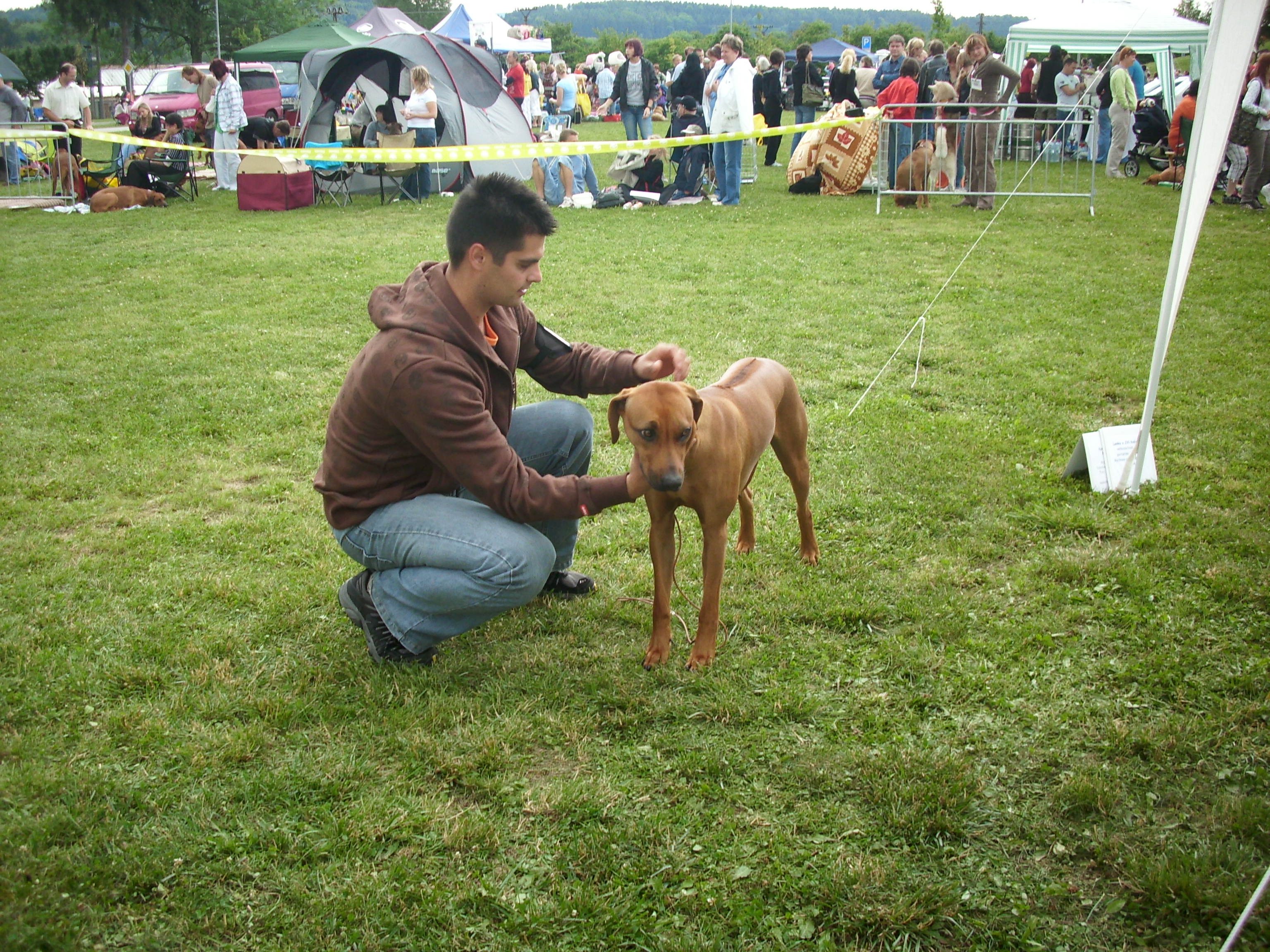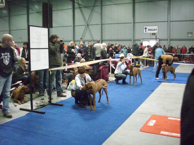 A pak nastala chvíle, které jsme se obávali. Damík a Aguša museli do kruhu ve stejný čas. Protože Agu je už profík, šel s ní do kruhu Lukáš s jedinou instrukcí - nesmíš jí to zkazit. Oba to zvládli se ctí a výsledkem bylo V3. Anetka s Honzou také zabojovali se známkou VD. Anetka teď hůř jedla a na postavě to bylo trochu znát. Myslím, že když se zadaří a přibere určitě se V budou jen sypat. A zatím Alenka předváděla Damíka, který s přehledem při účasti 12pejsků získal VN1. Výstava neměla chybu. Jen ty naše fotky z haly jako obvykle za moc nestojí, ale Vašek udělal spoustu fotek, na kterých najdete i nás a spoustu jiných krásných ridgebacků.