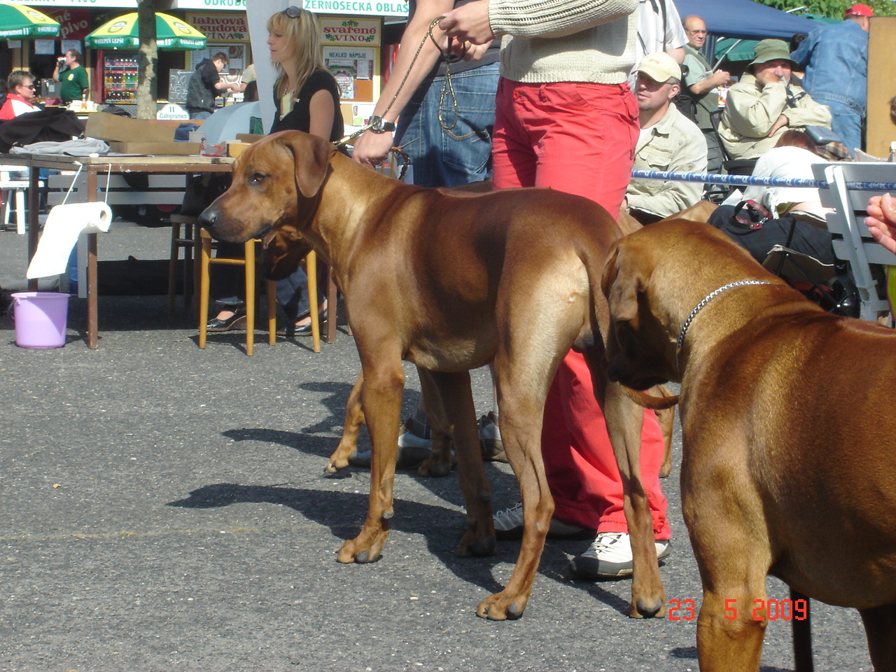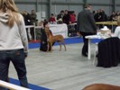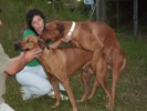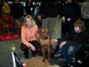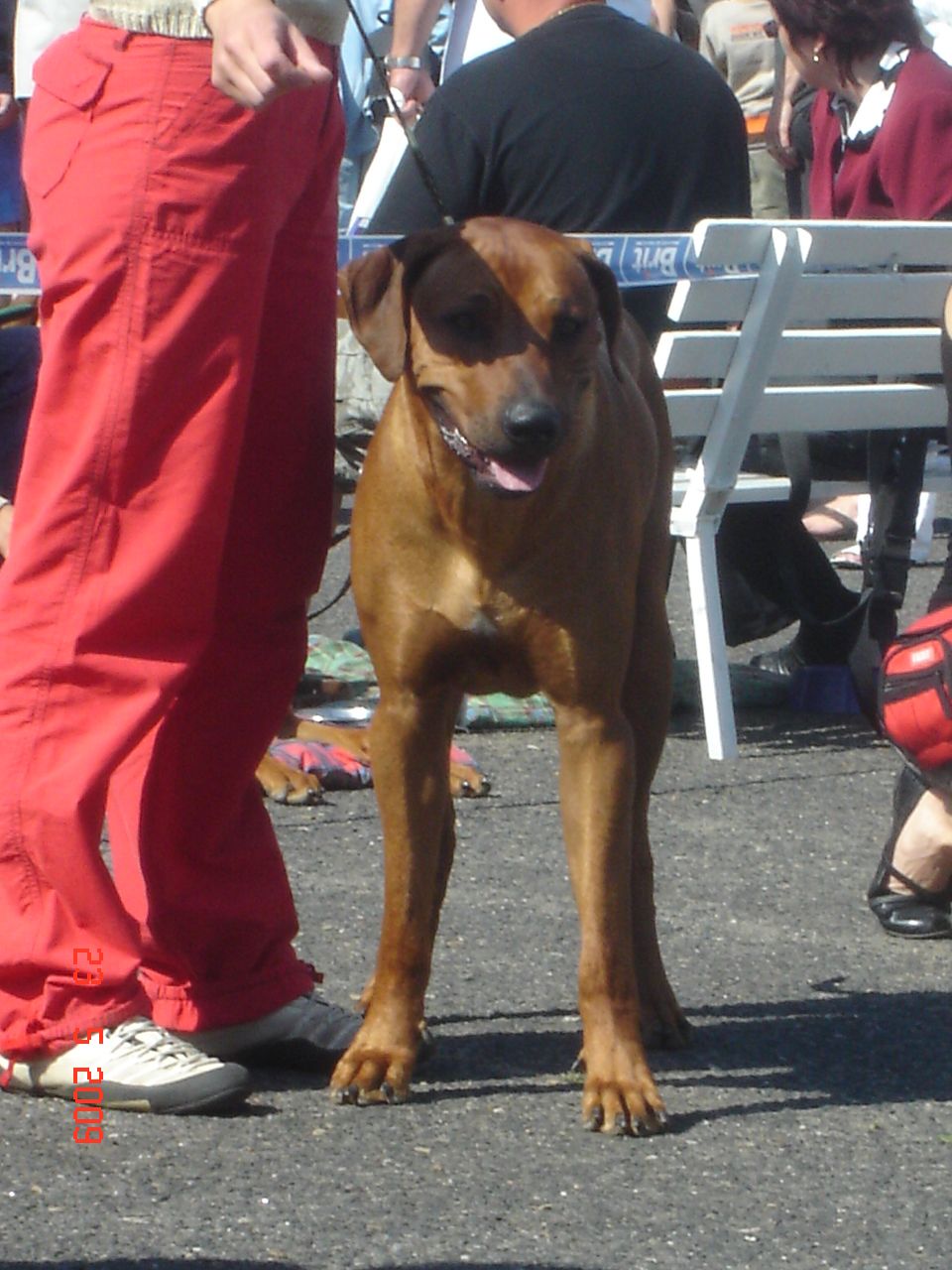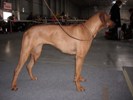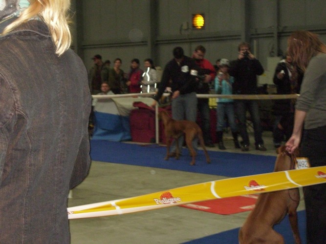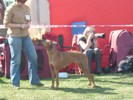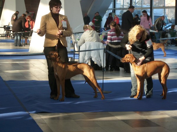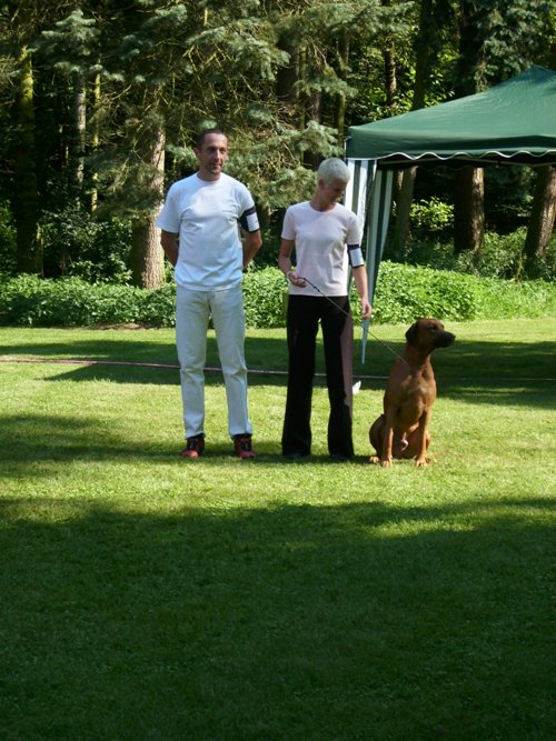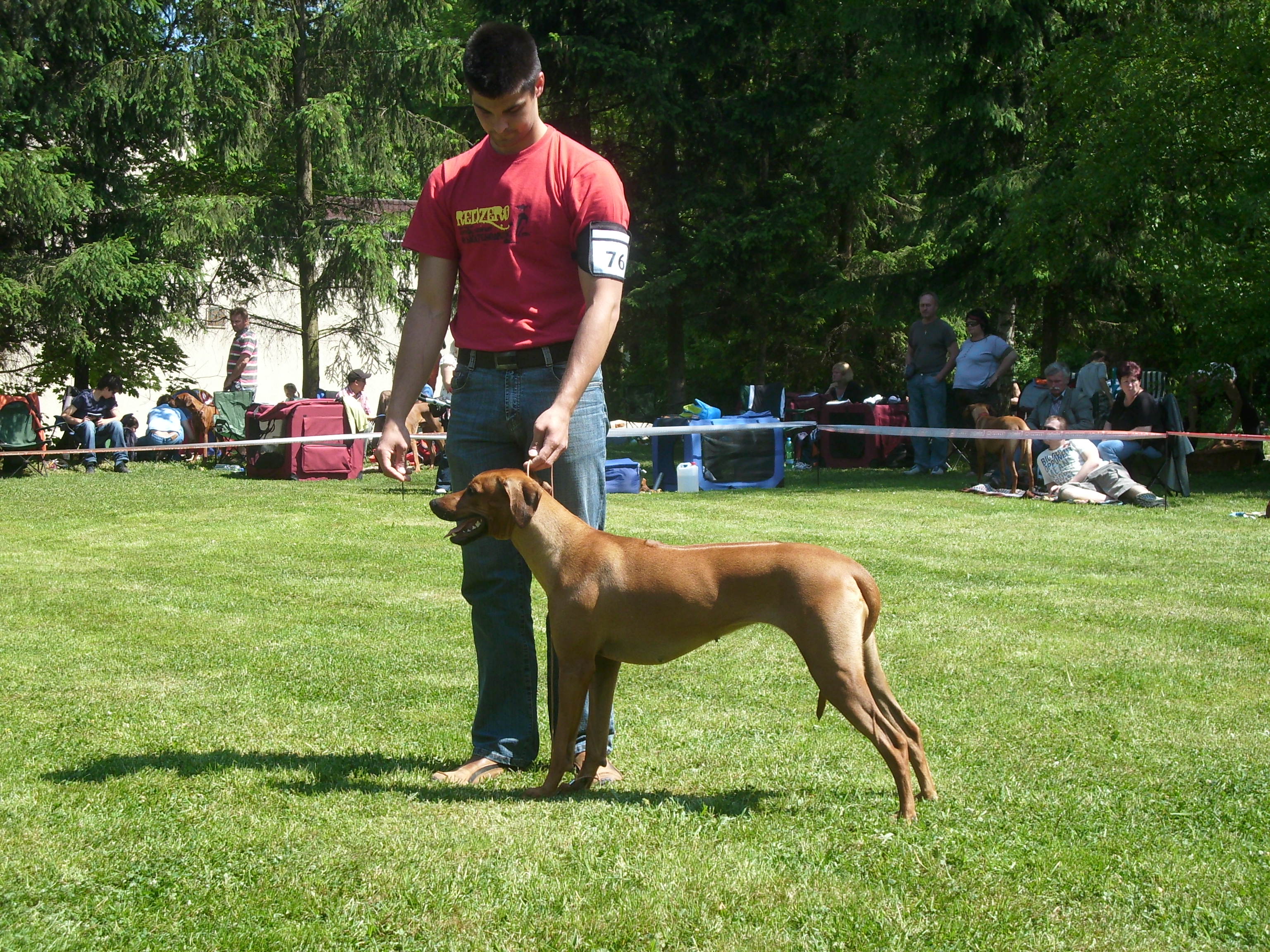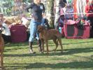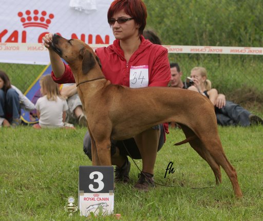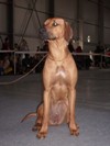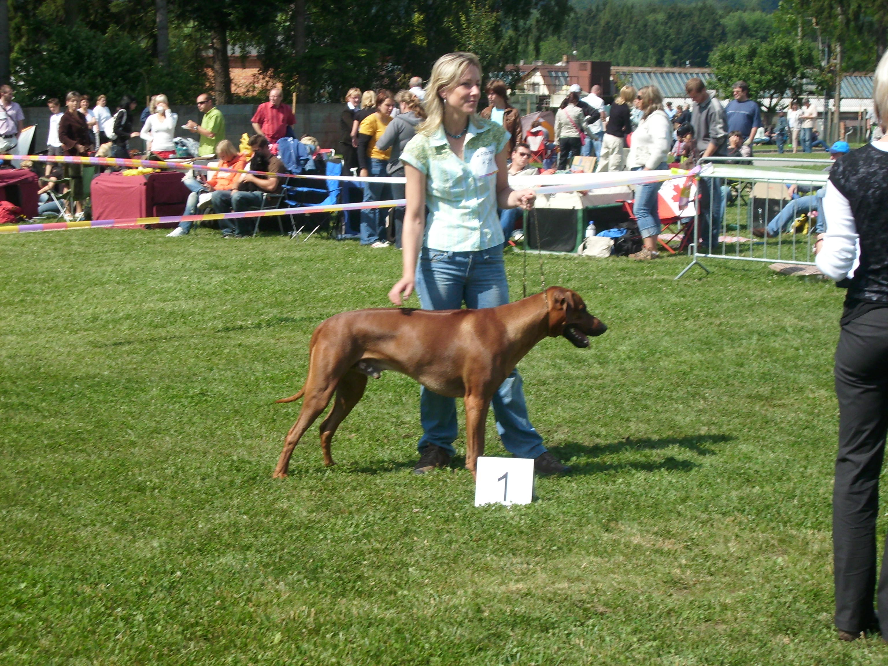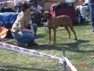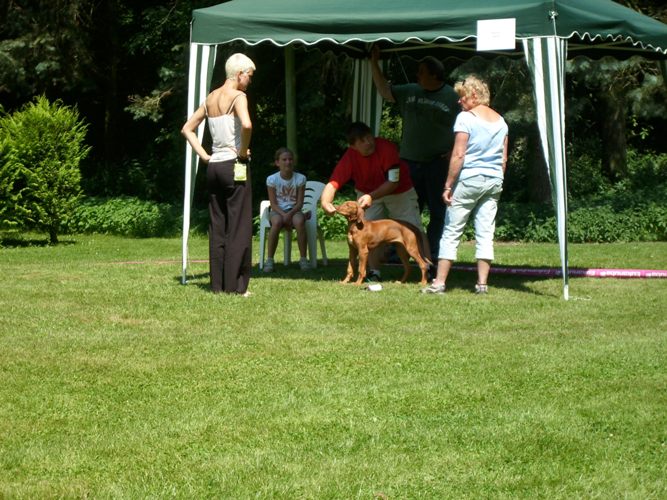 A pak nastala chvíle, které jsme se obávali. Damík a Aguša museli do kruhu ve stejný čas. Protože Agu je už profík, šel s ní do kruhu Lukáš s jedinou instrukcí - nesmíš jí to zkazit. Oba to zvládli se ctí a výsledkem bylo V3. Anetka s Honzou také zabojovali se známkou VD. Anetka teď hůř jedla a na postavě to bylo trochu znát. Myslím, že když se zadaří a přibere určitě se V budou jen sypat. A zatím Alenka předváděla Damíka, který s přehledem při účasti 12pejsků získal VN1. Výstava neměla chybu. Jen ty naše fotky z haly jako obvykle za moc nestojí, ale Vašek udělal spoustu fotek, na kterých najdete i nás a spoustu jiných krásných ridgebacků.