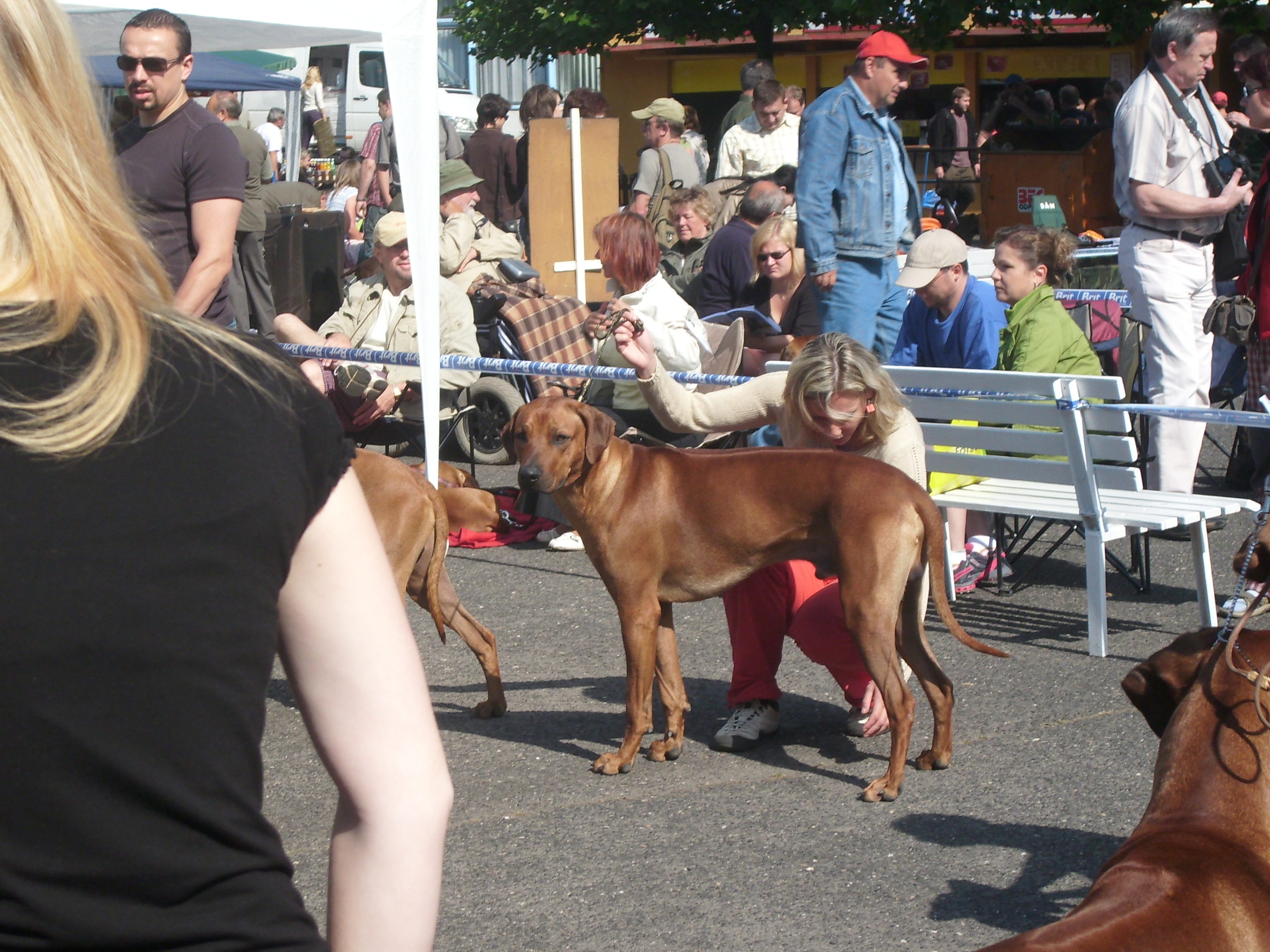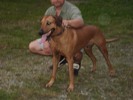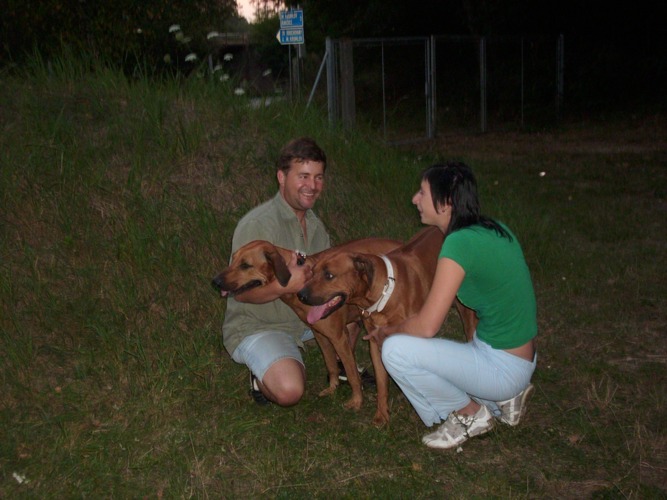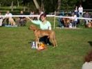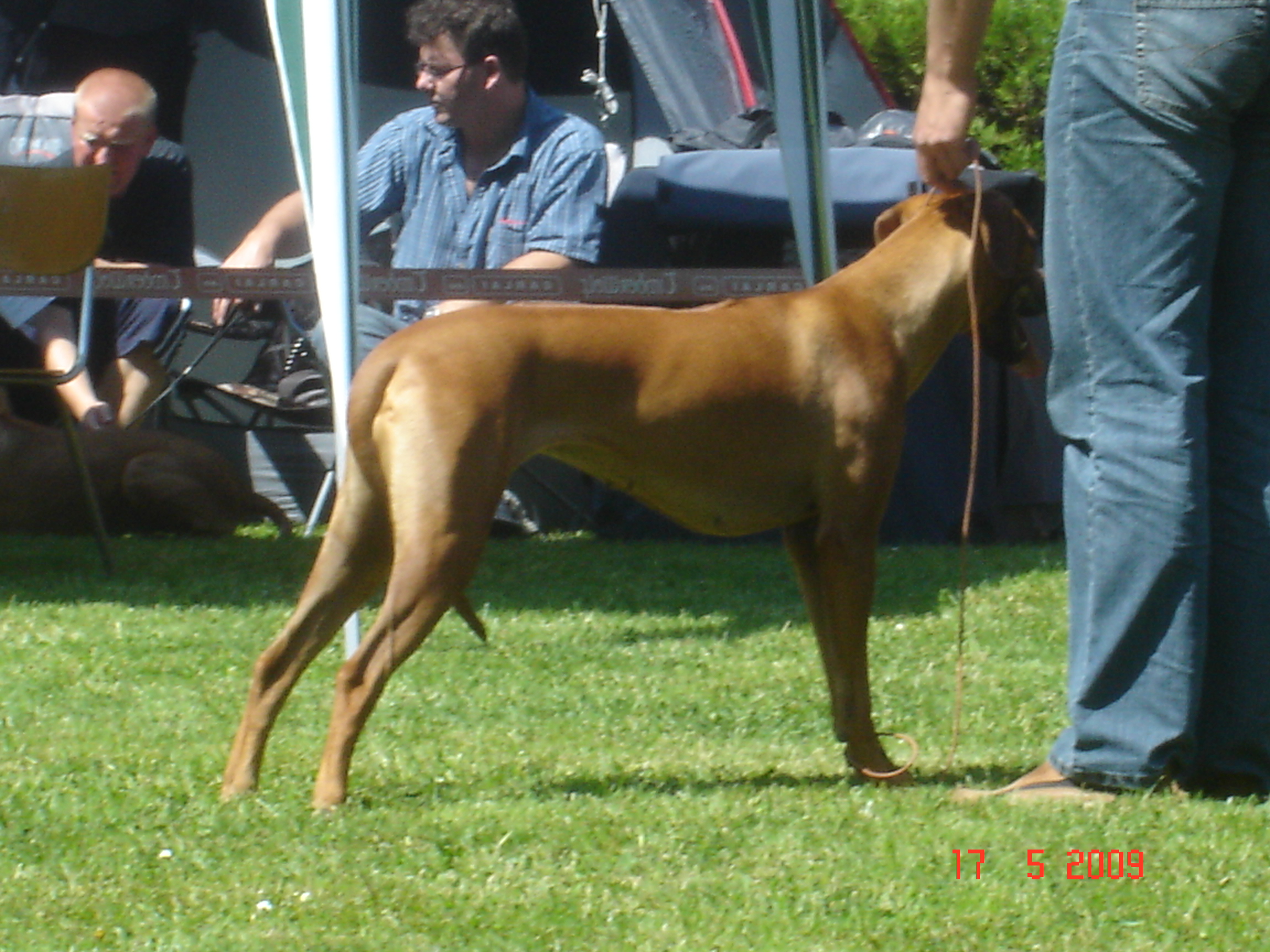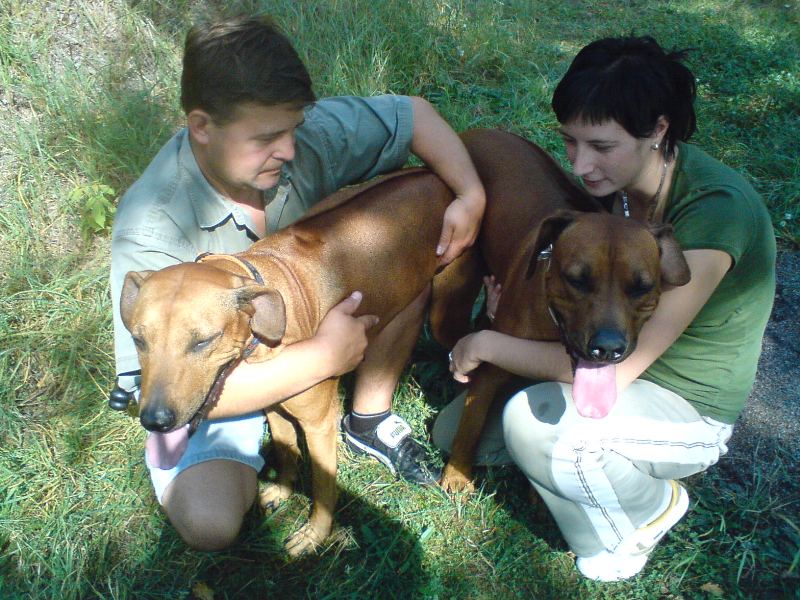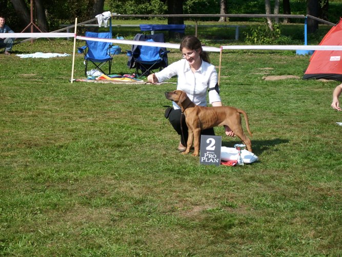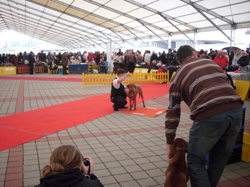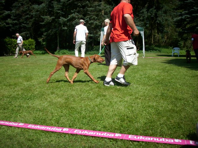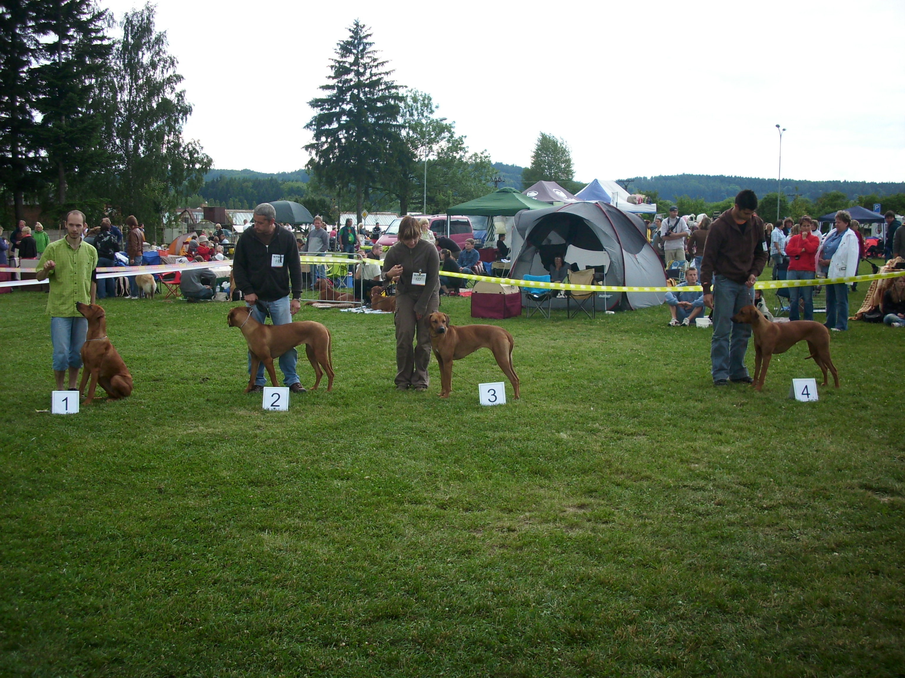 A pak nastala chvíle, které jsme se obávali. Damík a Aguša museli do kruhu ve stejný čas. Protože Agu je už profík, šel s ní do kruhu Lukáš s jedinou instrukcí - nesmíš jí to zkazit. Oba to zvládli se ctí a výsledkem bylo V3. Anetka s Honzou také zabojovali se známkou VD. Anetka teď hůř jedla a na postavě to bylo trochu znát. Myslím, že když se zadaří a přibere určitě se V budou jen sypat. A zatím Alenka předváděla Damíka, který s přehledem při účasti 12pejsků získal VN1. Výstava neměla chybu. Jen ty naše fotky z haly jako obvykle za moc nestojí, ale Vašek udělal spoustu fotek, na kterých najdete i nás a spoustu jiných krásných ridgebacků.