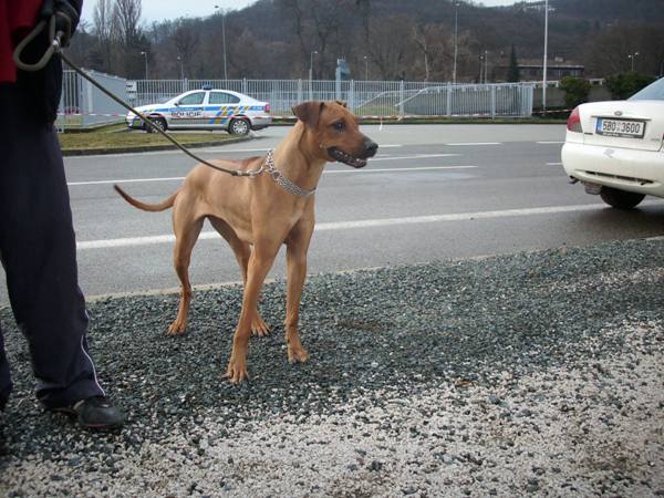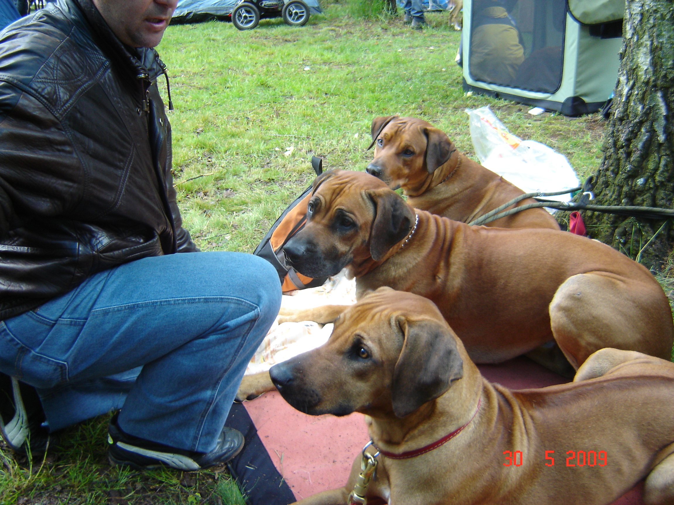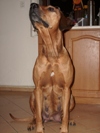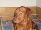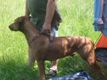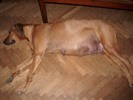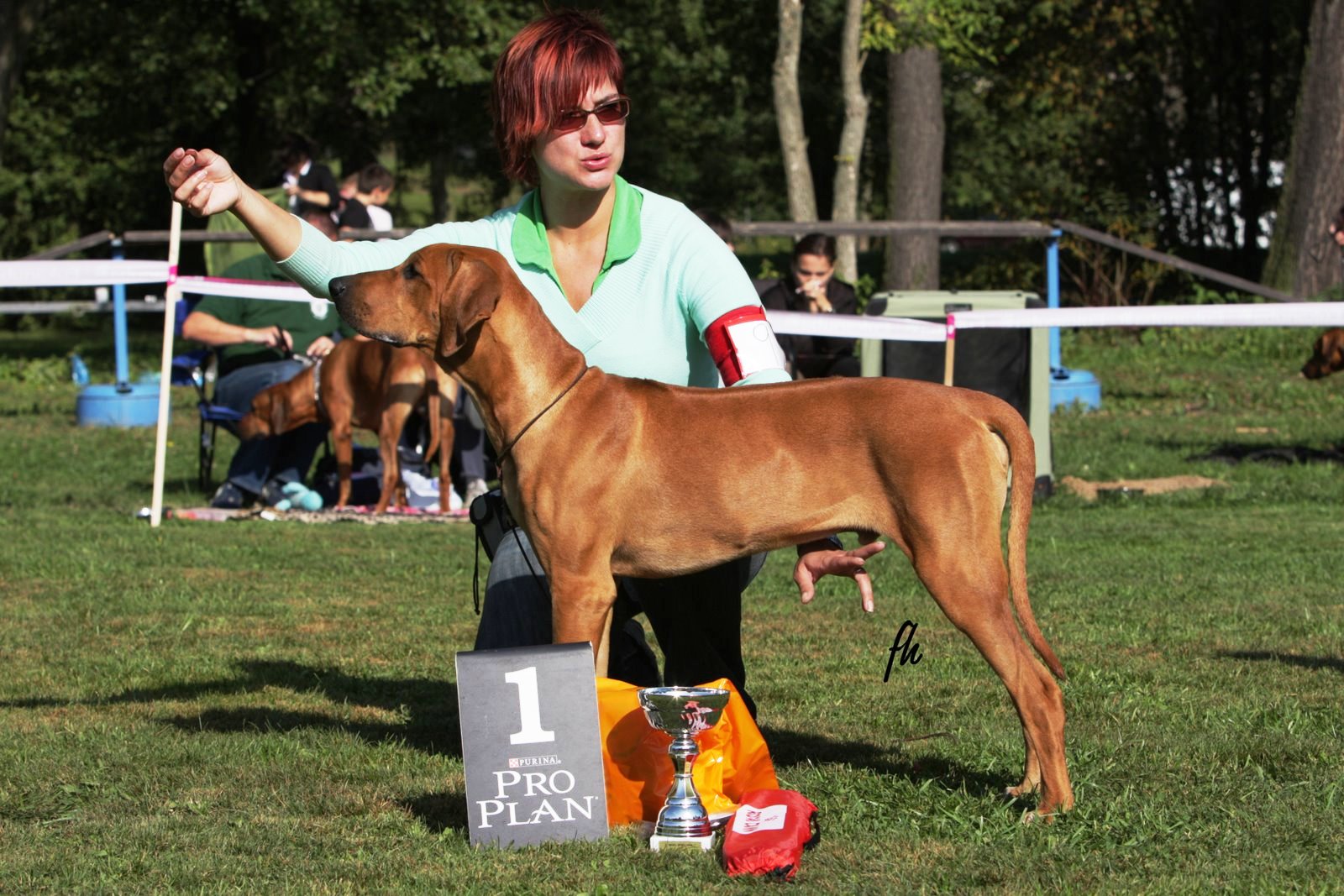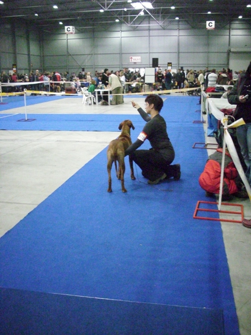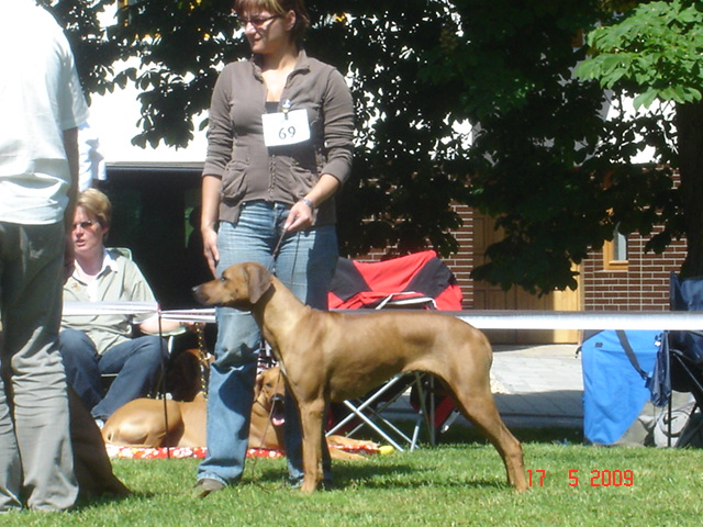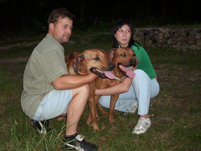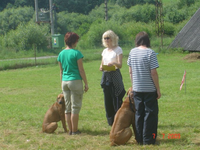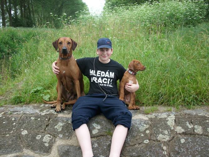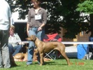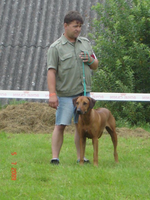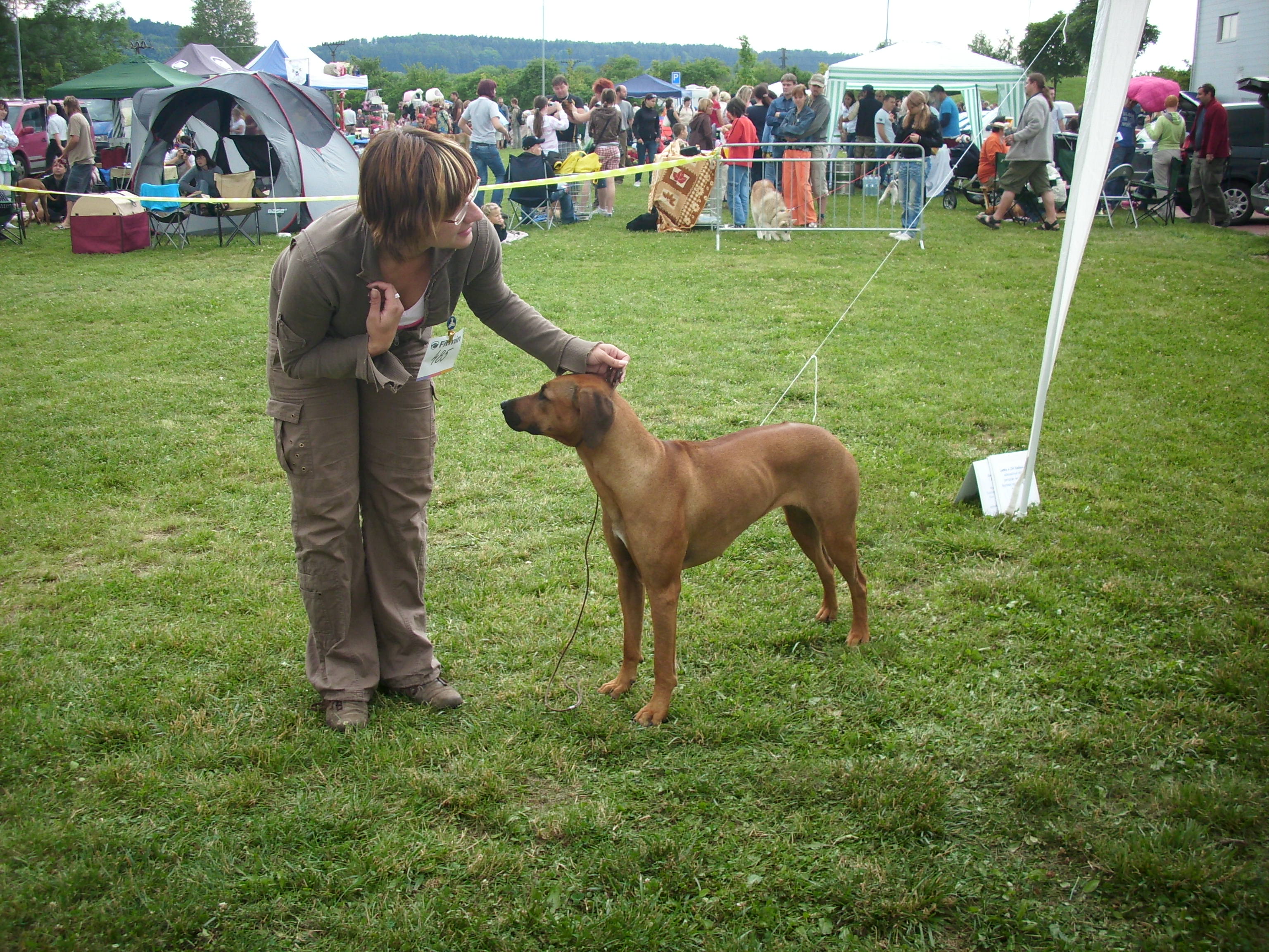 A pak nastala chvíle, které jsme se obávali. Damík a Aguša museli do kruhu ve stejný čas. Protože Agu je už profík, šel s ní do kruhu Lukáš s jedinou instrukcí - nesmíš jí to zkazit. Oba to zvládli se ctí a výsledkem bylo V3. Anetka s Honzou také zabojovali se známkou VD. Anetka teď hůř jedla a na postavě to bylo trochu znát. Myslím, že když se zadaří a přibere určitě se V budou jen sypat. A zatím Alenka předváděla Damíka, který s přehledem při účasti 12pejsků získal VN1. Výstava neměla chybu. Jen ty naše fotky z haly jako obvykle za moc nestojí, ale Vašek udělal spoustu fotek, na kterých najdete i nás a spoustu jiných krásných ridgebacků.