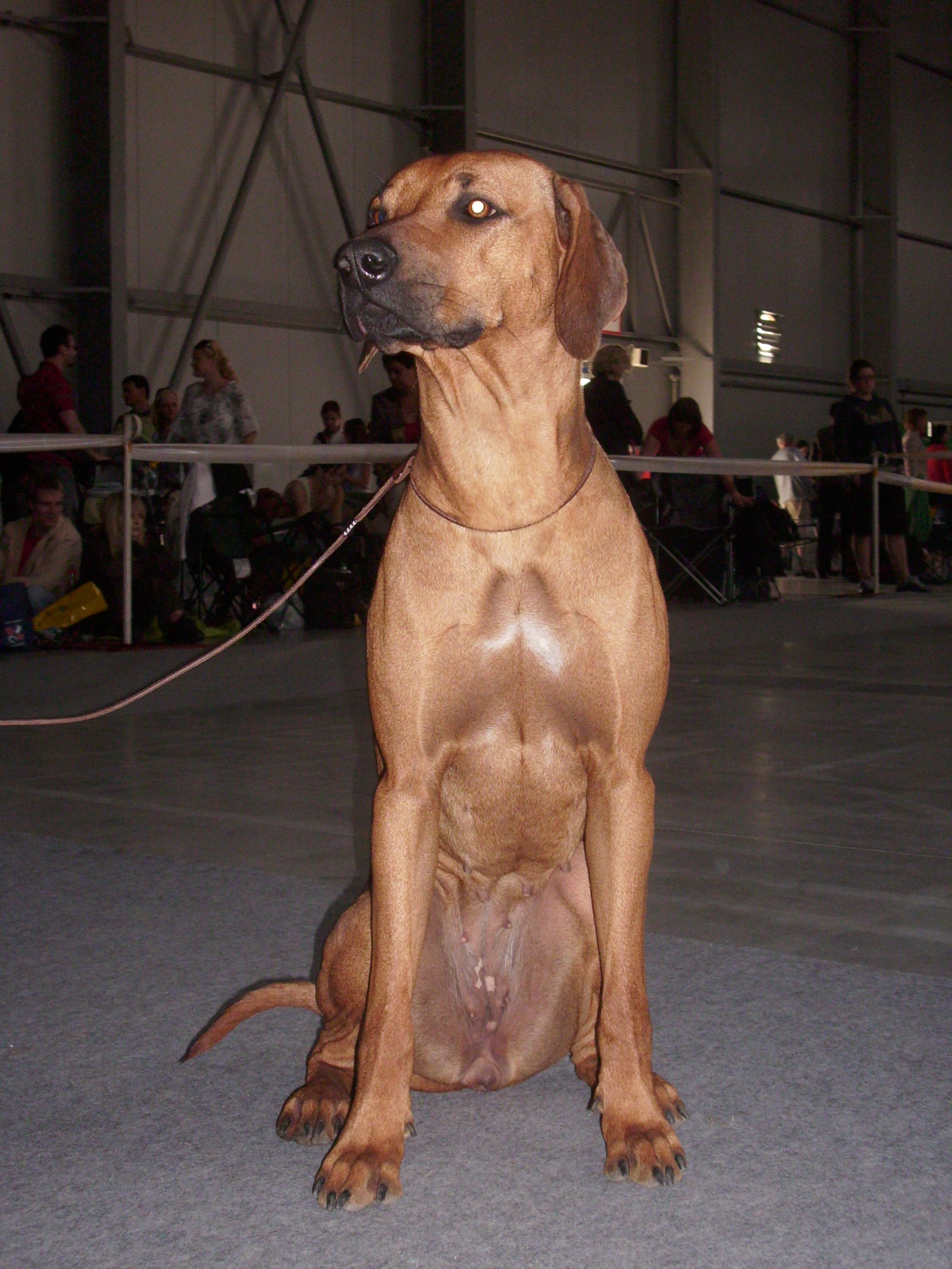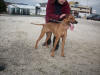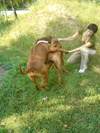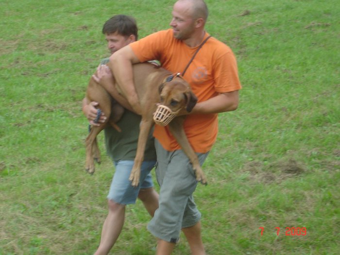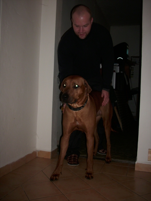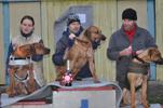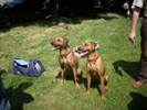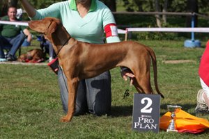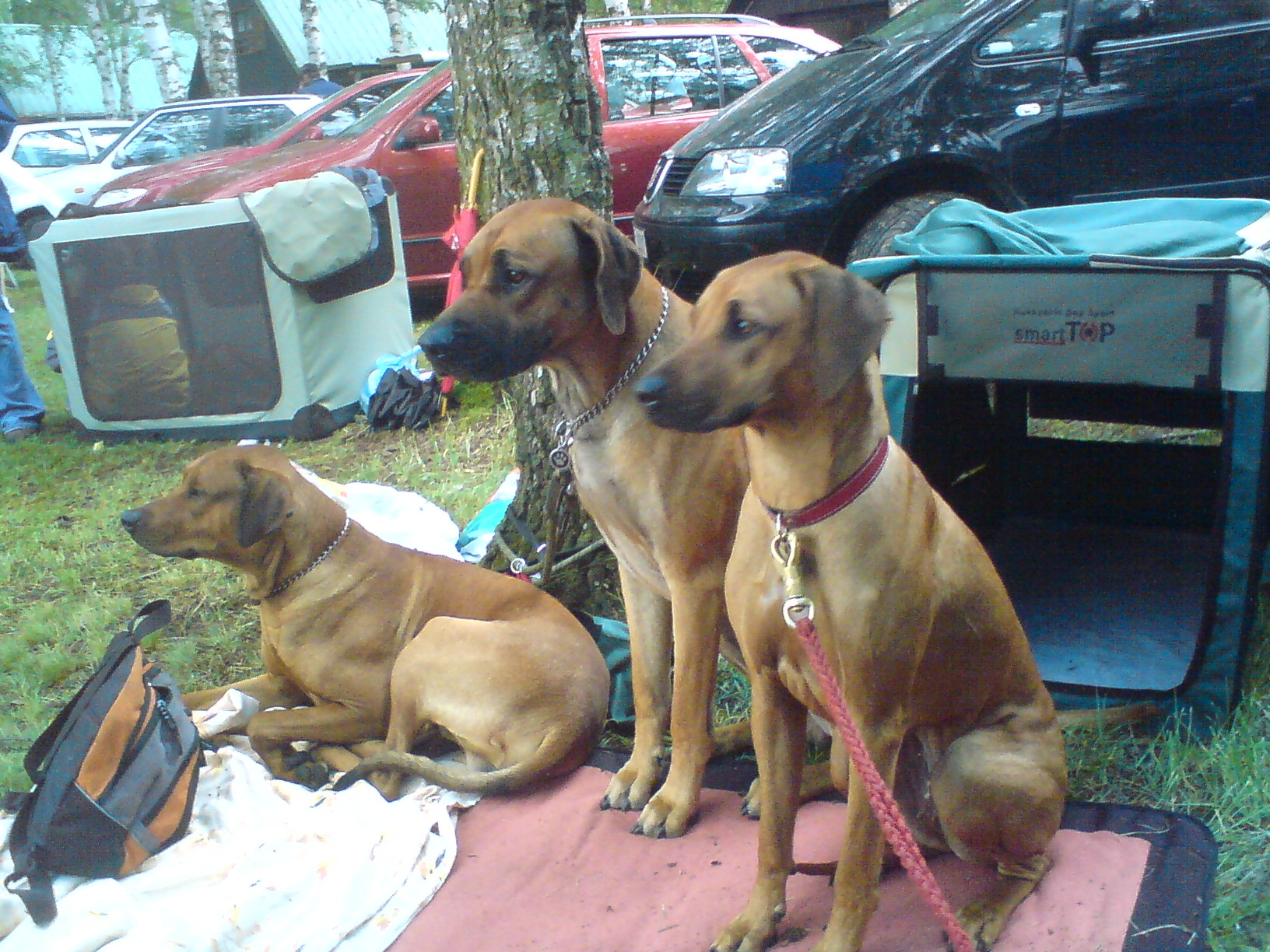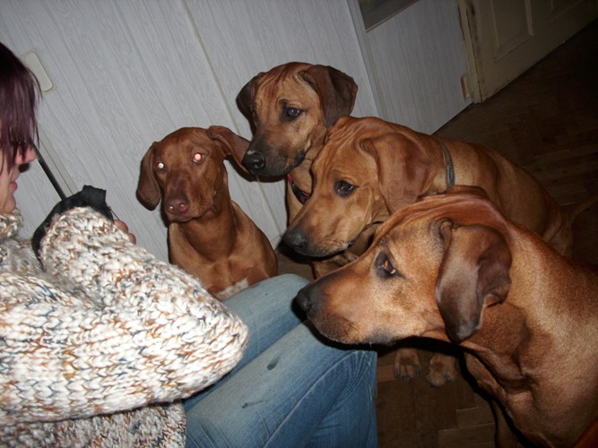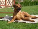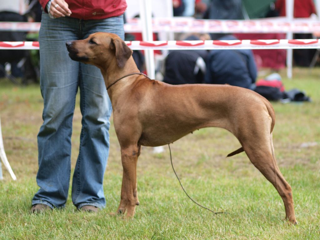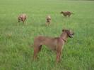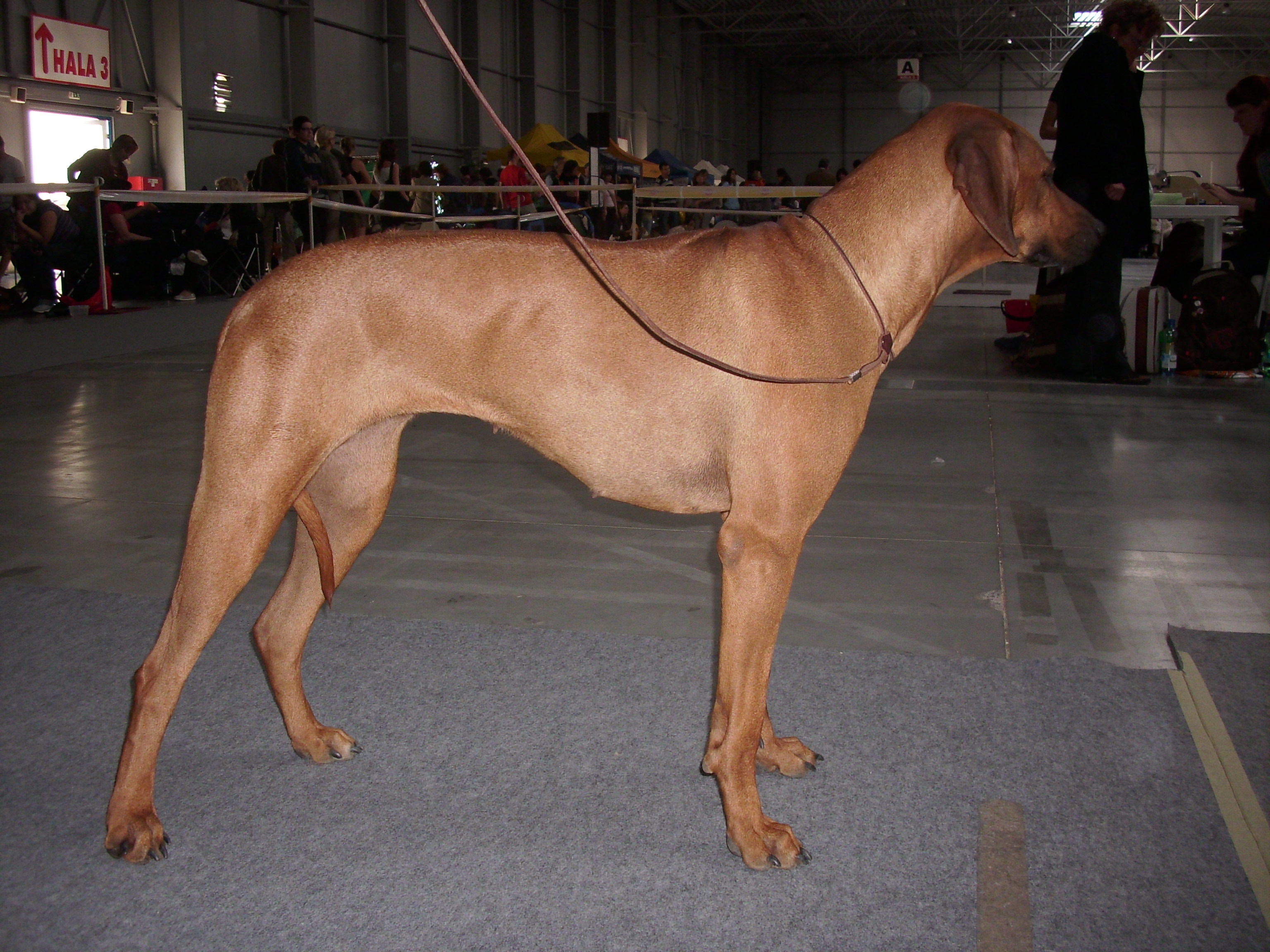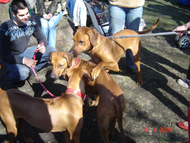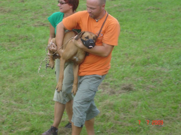 A pak nastala chvíle, které jsme se obávali. Damík a Aguša museli do kruhu ve stejný čas. Protože Agu je už profík, šel s ní do kruhu Lukáš s jedinou instrukcí - nesmíš jí to zkazit. Oba to zvládli se ctí a výsledkem bylo V3. Anetka s Honzou také zabojovali se známkou VD. Anetka teď hůř jedla a na postavě to bylo trochu znát. Myslím, že když se zadaří a přibere určitě se V budou jen sypat. A zatím Alenka předváděla Damíka, který s přehledem při účasti 12pejsků získal VN1. Výstava neměla chybu. Jen ty naše fotky z haly jako obvykle za moc nestojí, ale Vašek udělal spoustu fotek, na kterých najdete i nás a spoustu jiných krásných ridgebacků.