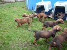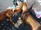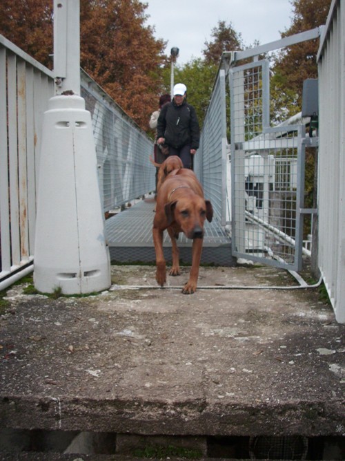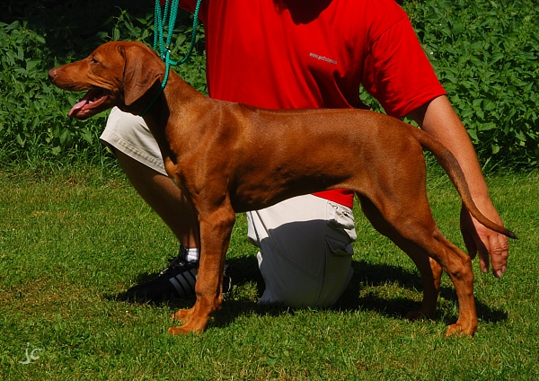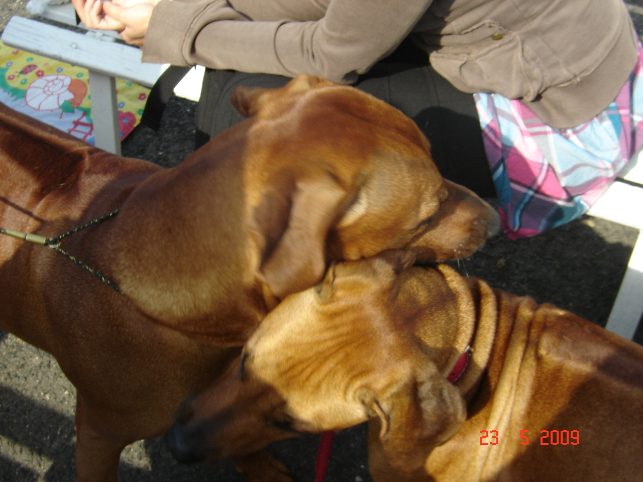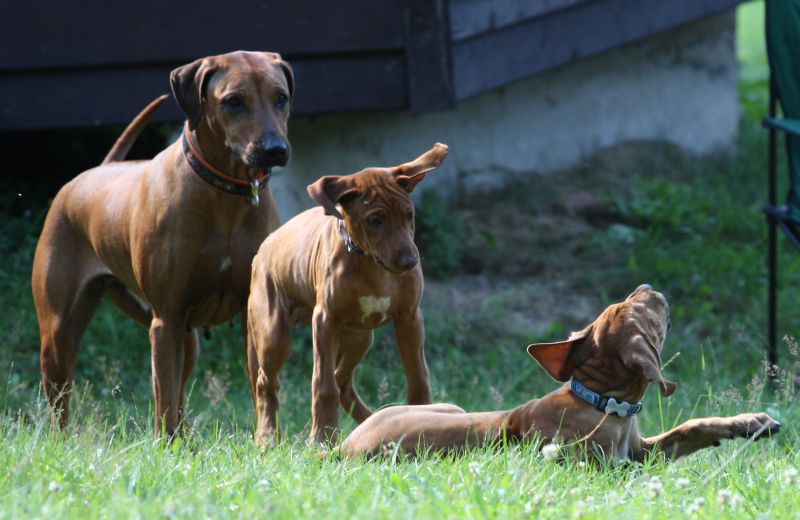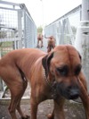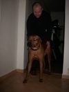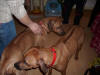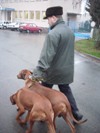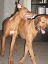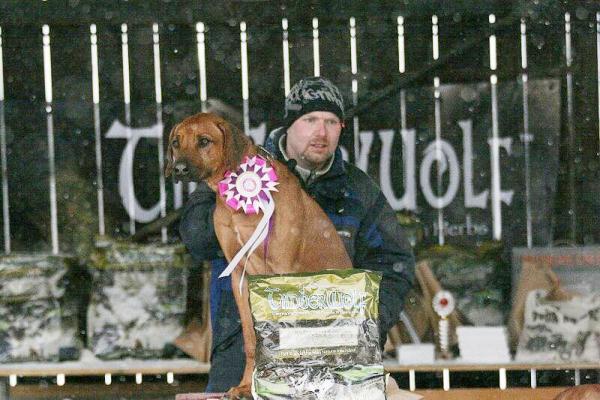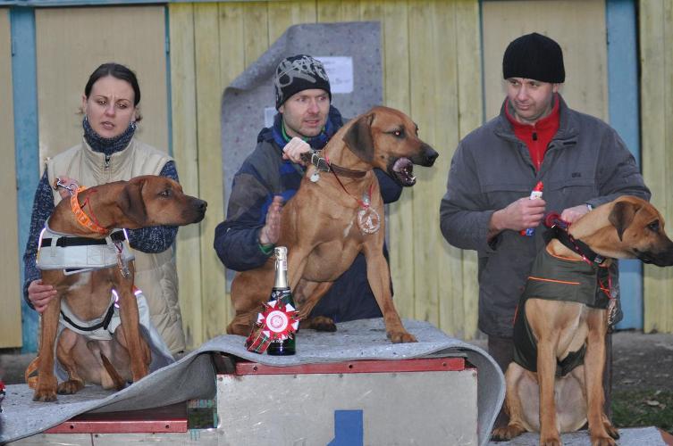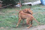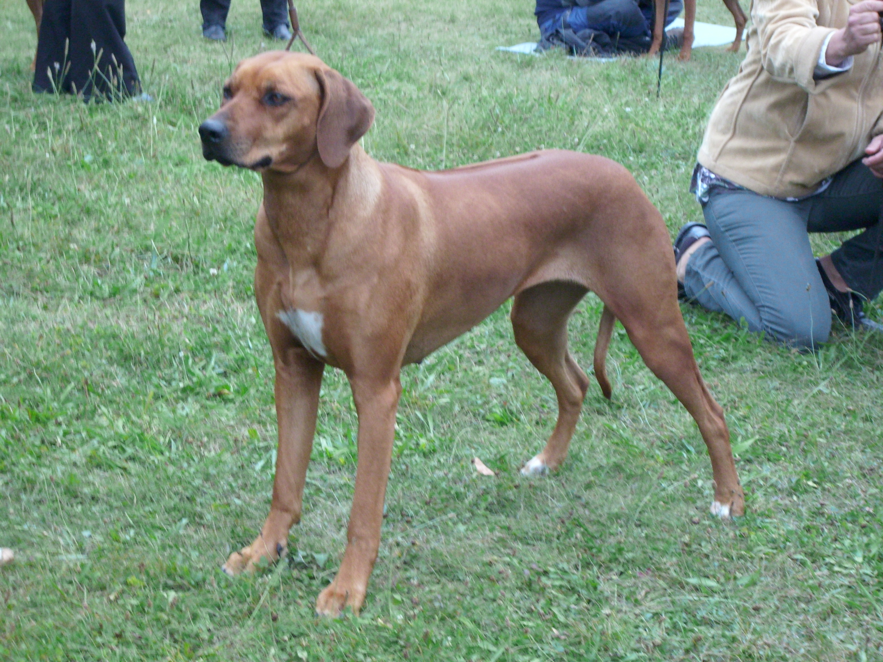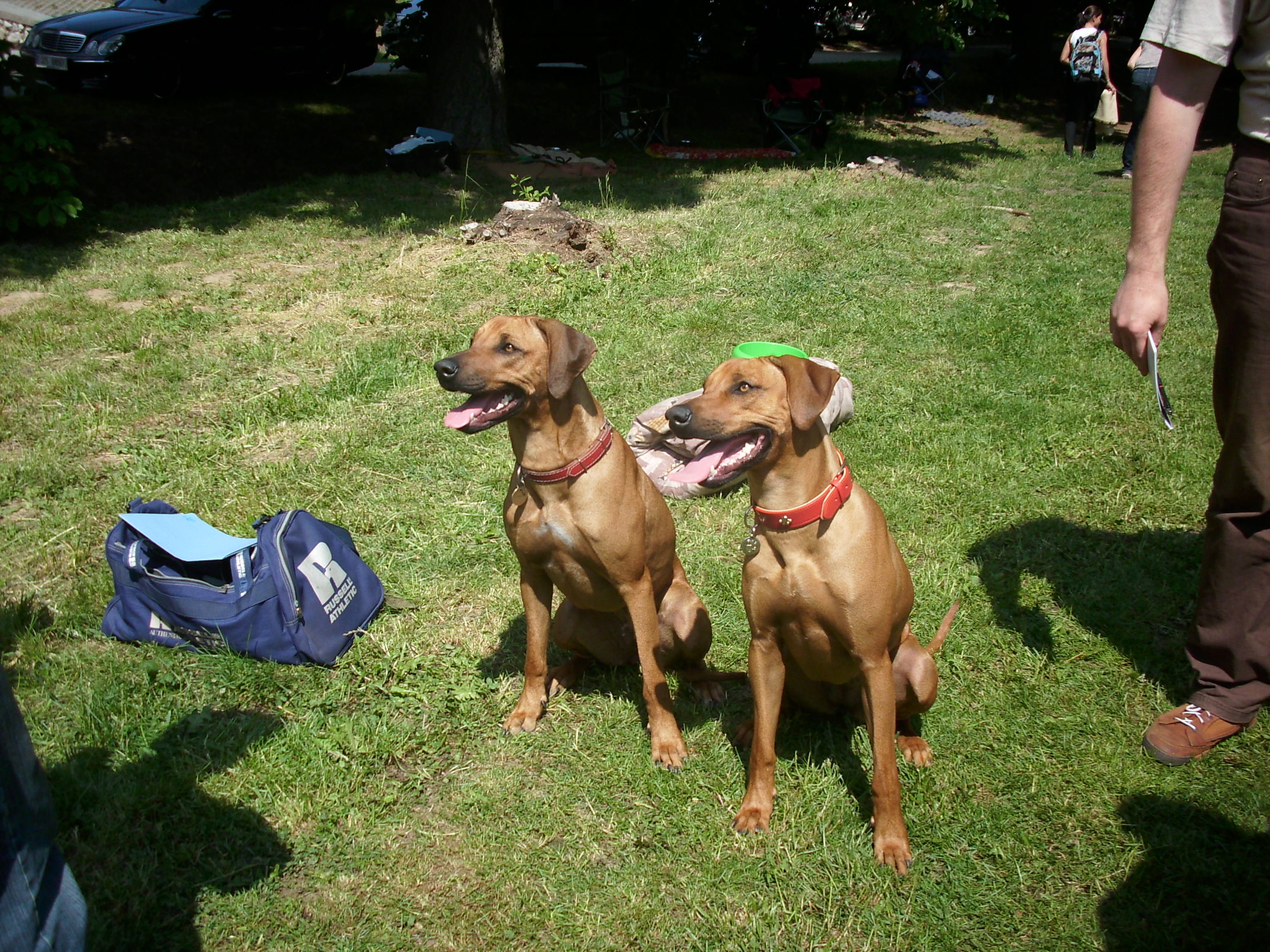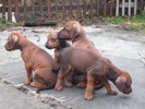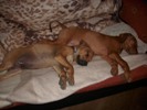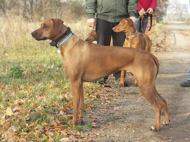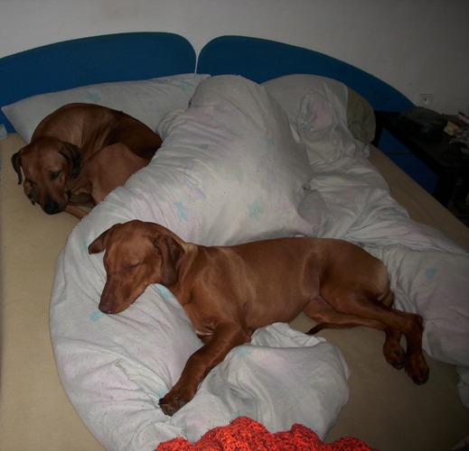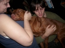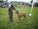 A pak nastala chvíle, které jsme se obávali. Damík a Aguša museli do kruhu ve stejný čas. Protože Agu je už profík, šel s ní do kruhu Lukáš s jedinou instrukcí - nesmíš jí to zkazit. Oba to zvládli se ctí a výsledkem bylo V3. Anetka s Honzou také zabojovali se známkou VD. Anetka teď hůř jedla a na postavě to bylo trochu znát. Myslím, že když se zadaří a přibere určitě se V budou jen sypat. A zatím Alenka předváděla Damíka, který s přehledem při účasti 12pejsků získal VN1. Výstava neměla chybu. Jen ty naše fotky z haly jako obvykle za moc nestojí, ale Vašek udělal spoustu fotek, na kterých najdete i nás a spoustu jiných krásných ridgebacků.