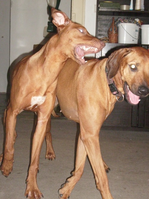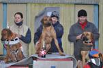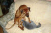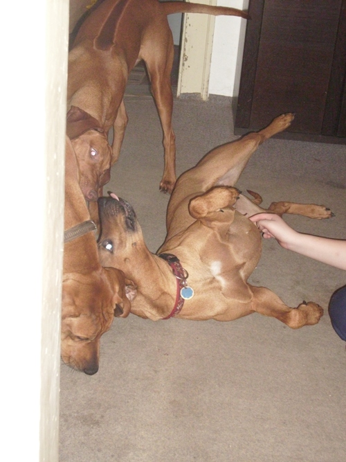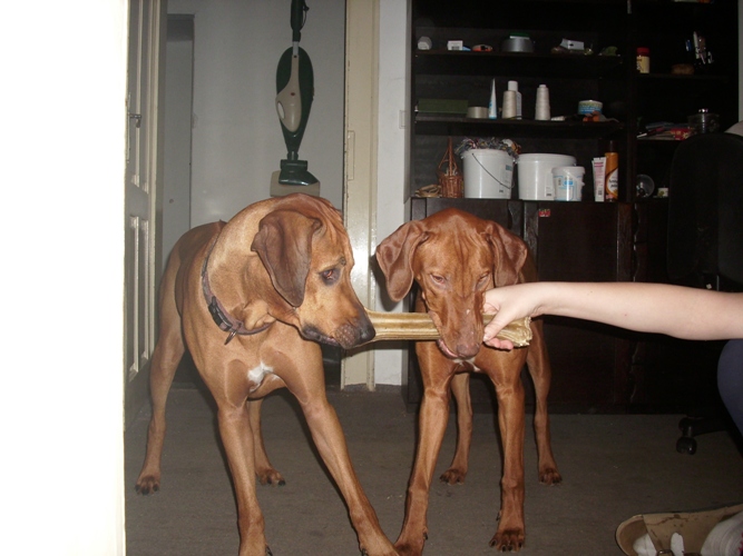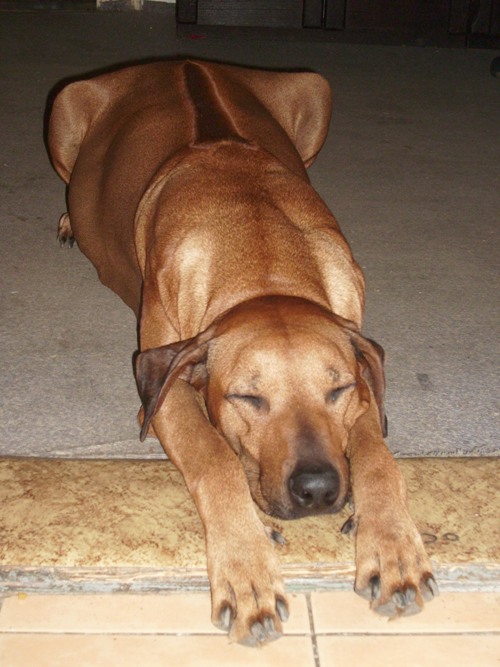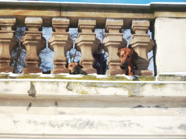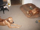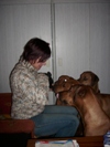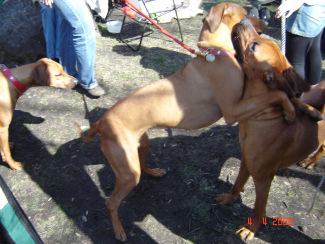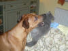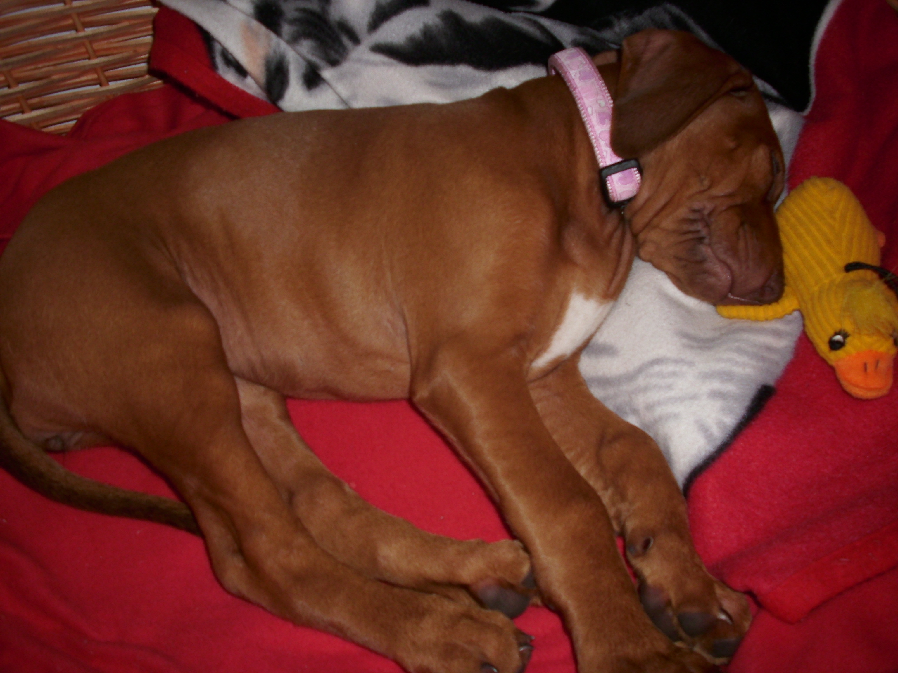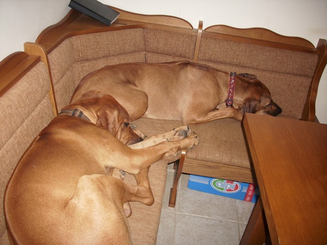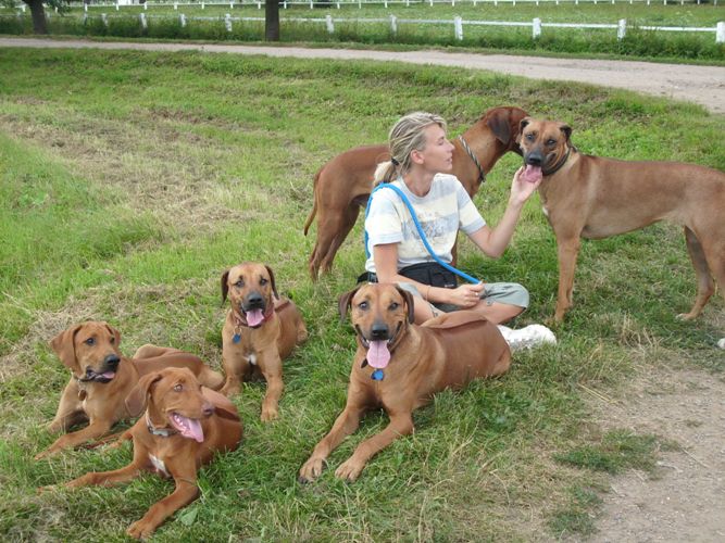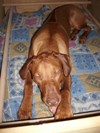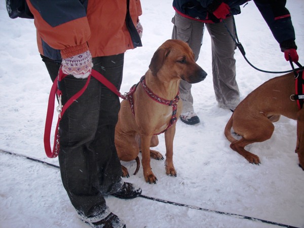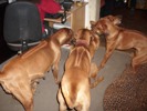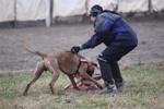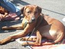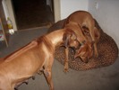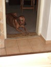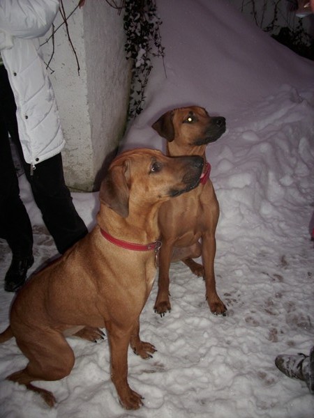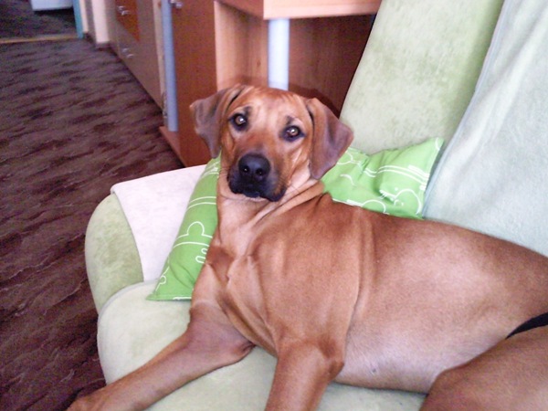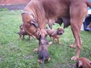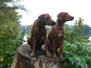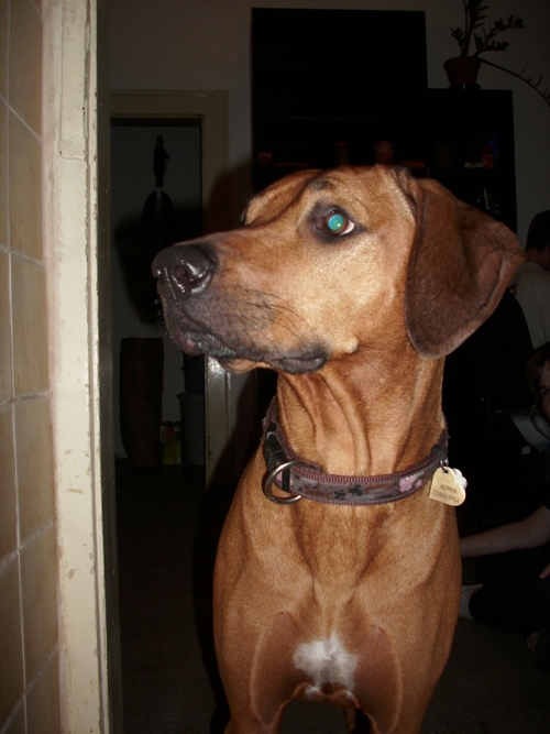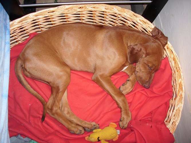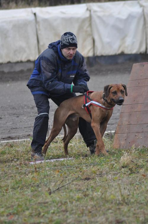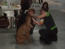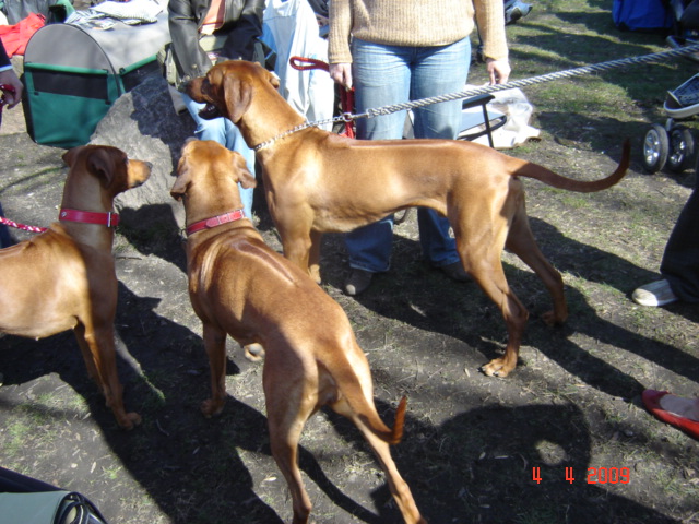 A pak nastala chvíle, které jsme se obávali. Damík a Aguša museli do kruhu ve stejný čas. Protože Agu je už profík, šel s ní do kruhu Lukáš s jedinou instrukcí - nesmíš jí to zkazit. Oba to zvládli se ctí a výsledkem bylo V3. Anetka s Honzou také zabojovali se známkou VD. Anetka teď hůř jedla a na postavě to bylo trochu znát. Myslím, že když se zadaří a přibere určitě se V budou jen sypat. A zatím Alenka předváděla Damíka, který s přehledem při účasti 12pejsků získal VN1. Výstava neměla chybu. Jen ty naše fotky z haly jako obvykle za moc nestojí, ale Vašek udělal spoustu fotek, na kterých najdete i nás a spoustu jiných krásných ridgebacků.