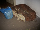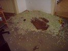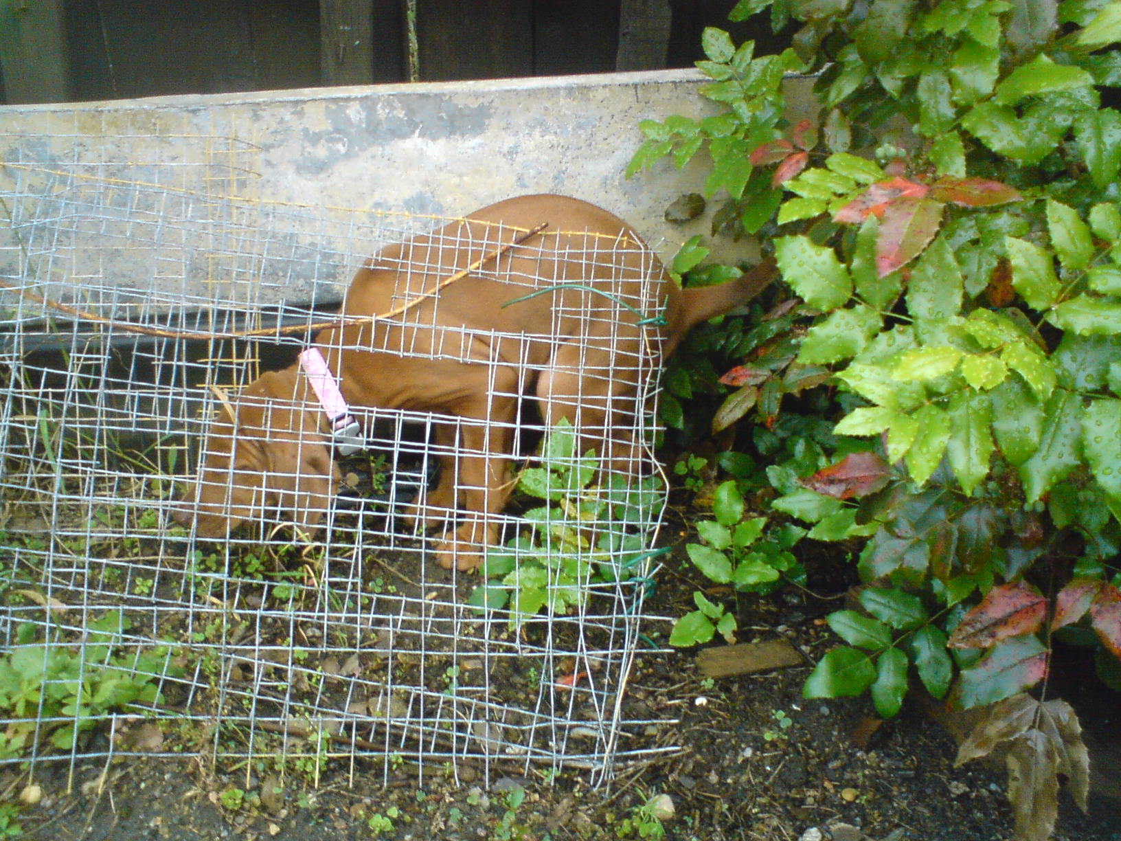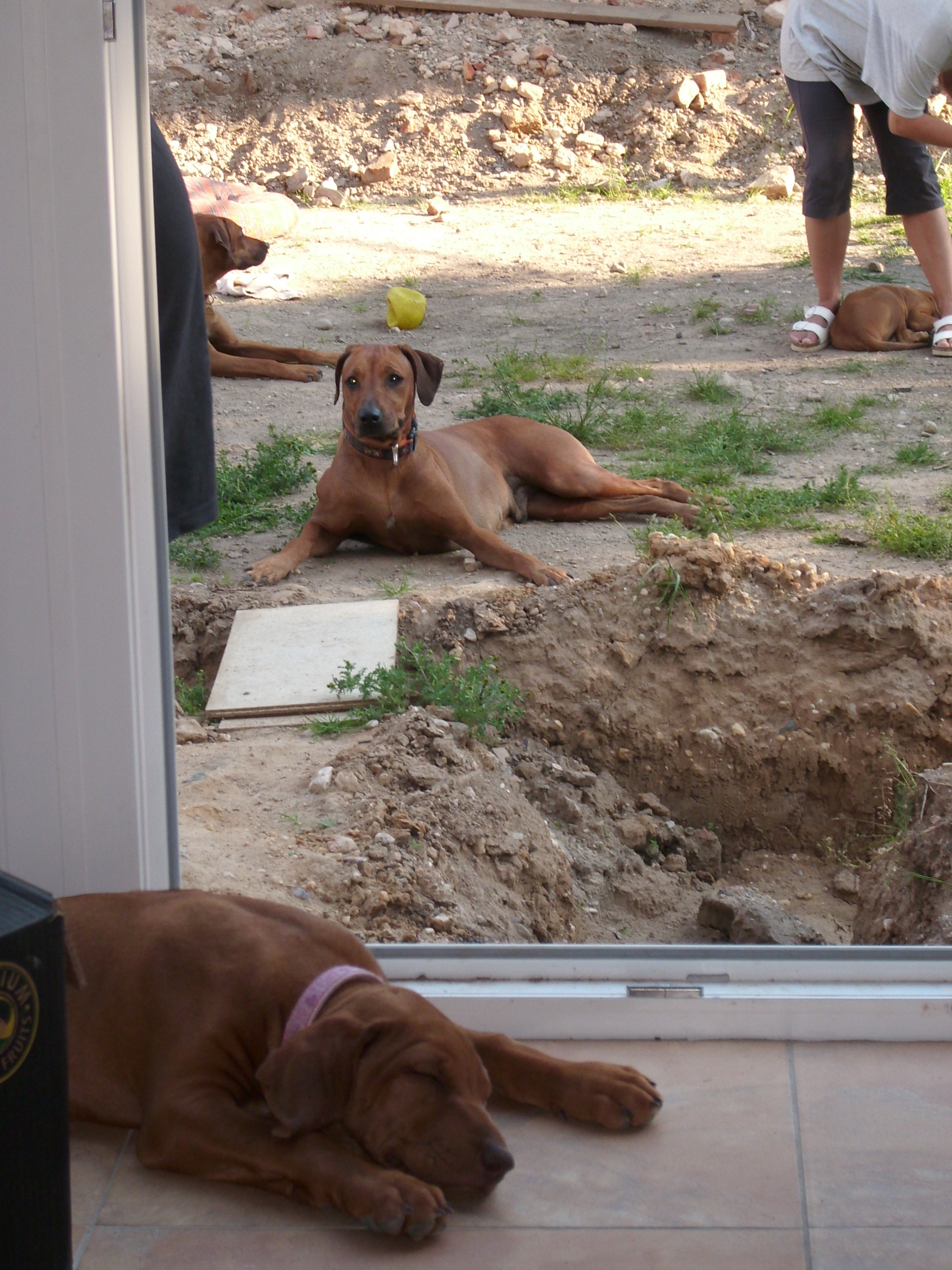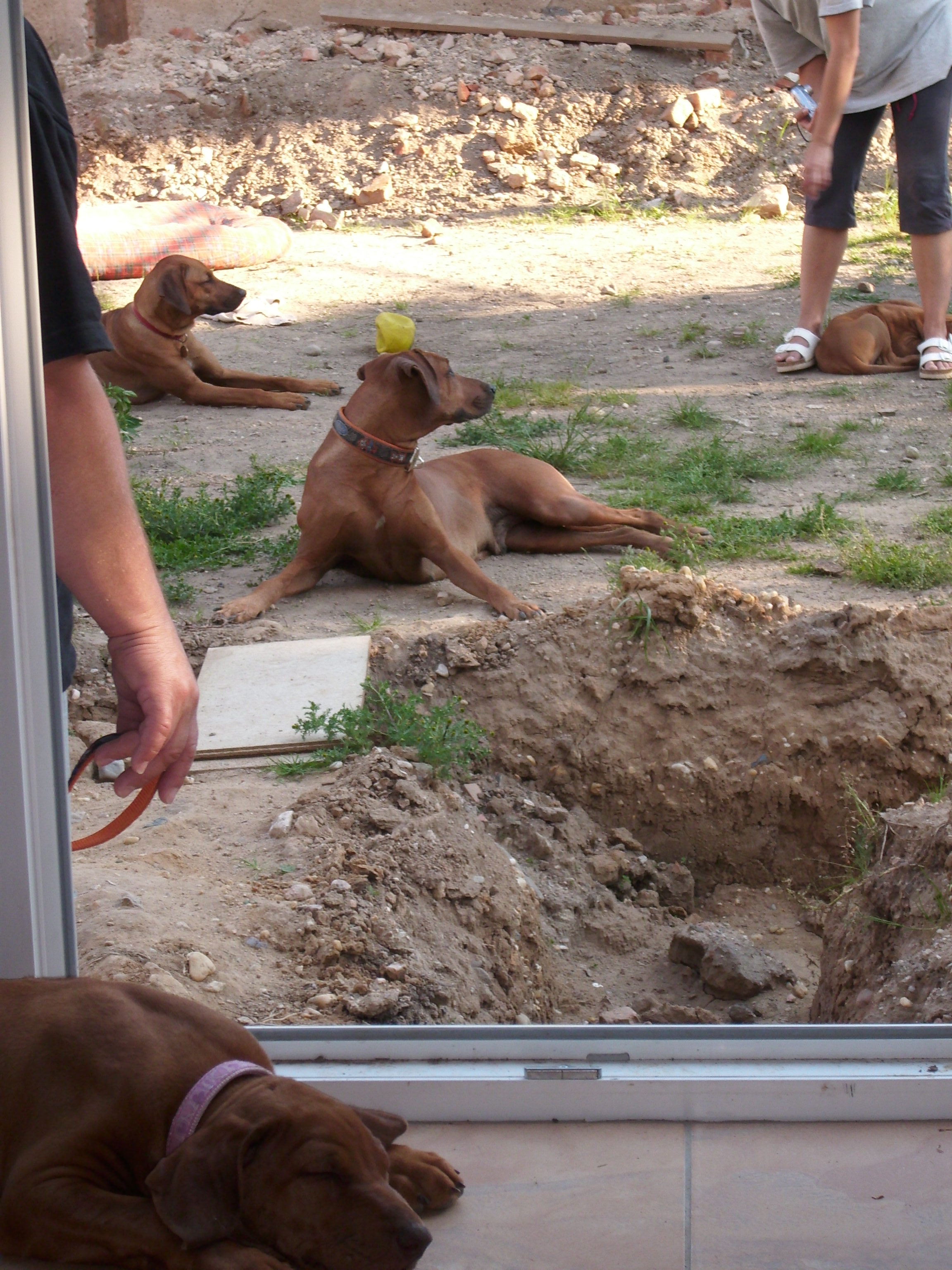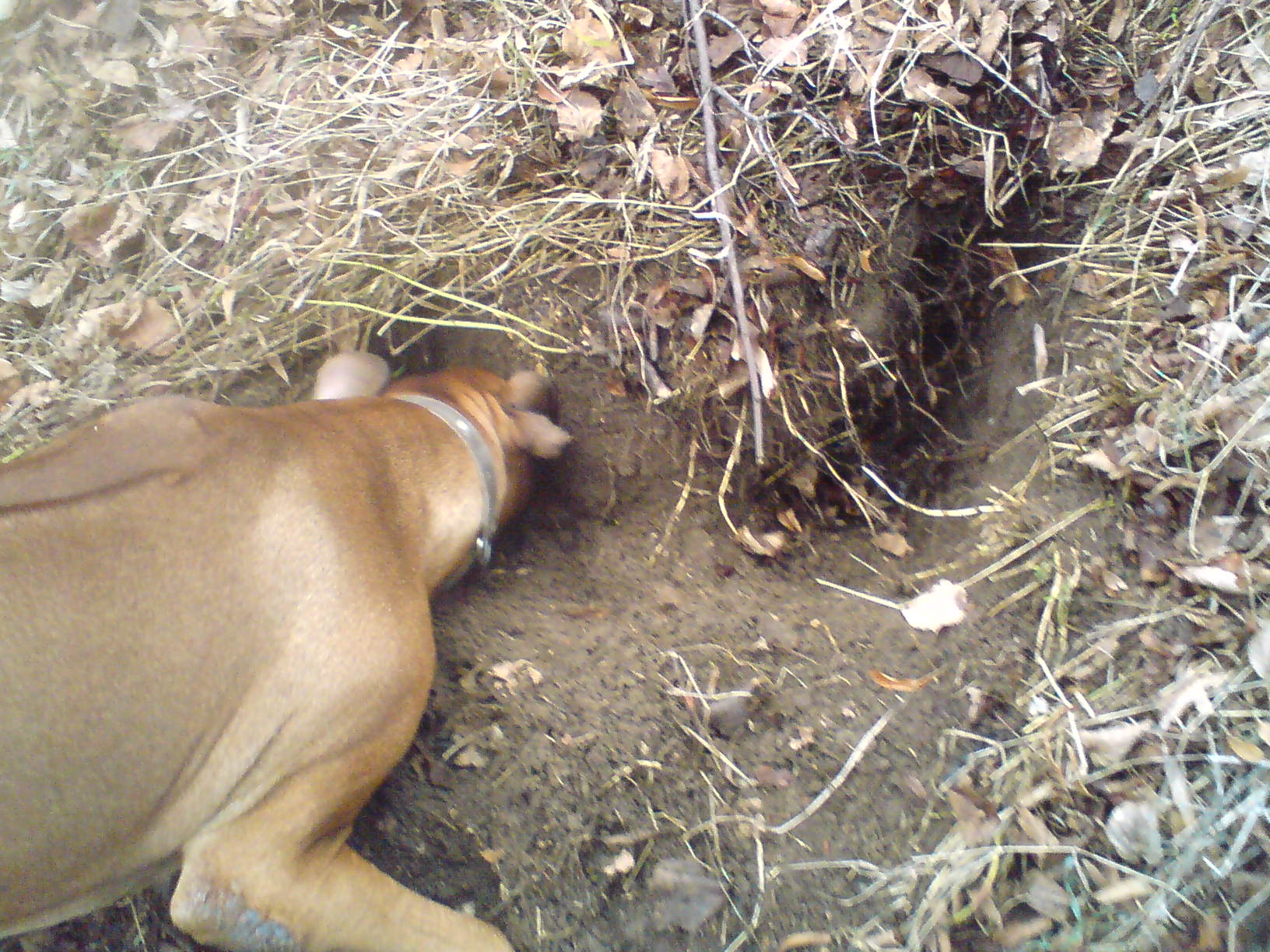 Jenže člověk míní a naši chlapci mění. Včera se vydali pomoct Lukášovi s betonovými sloupky. Na tom nic, proč jí s sebou nevzali jsem nepochopila (prý by překážela - no nevím, mají překážet dva nebo tři psi, vždyť už je to jedno). Stále pohoda. Ale protože prostřední synek je sklerotik a zapoměl vzít kalač a sekeru, kterou chtěl Lukáš půjčit jali se volat toho nejstaršího. Samozřejmě, že Angee nevzal s sebou, samozřejmě, že nenechal holky na zahradě, aby se vylítaly. Ta nenávist - to se Gee přece nemohlo líbit. Vždyť ona moc dobře ví, že odpoledne s ní vždycky někdo je a nebo když jde ven, tak jí bere s sebou. A každé provinění je po zásluze potrestáno. Výsledek 15minut o samotě vidíte níže. Myslím, že dobrá práce, ne? Takže náš nejmladší měl 3hodiny co dělat a náš mraveneček má pelíšek specielních tvarů. Nutno uznat, že magmaboňata jsou v designování svých pelíšků dobří.