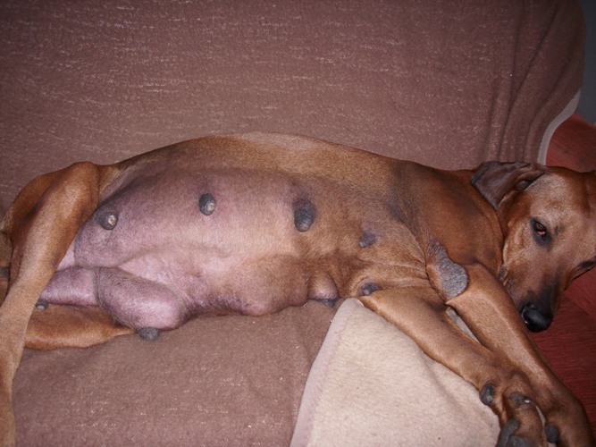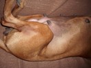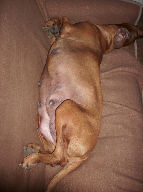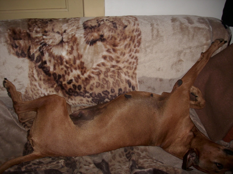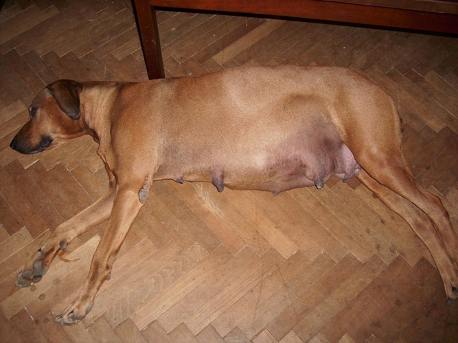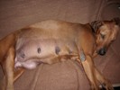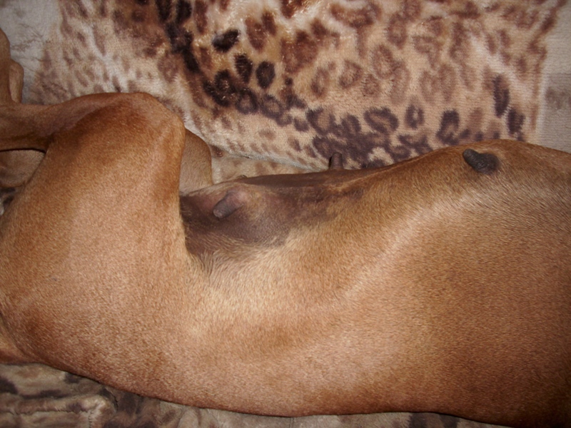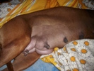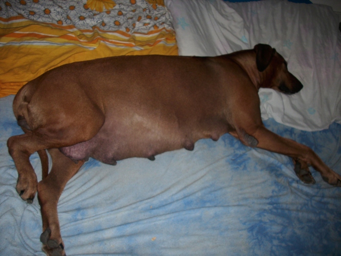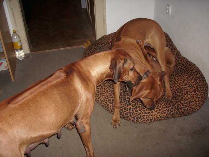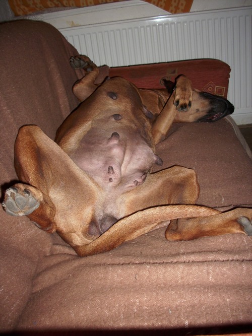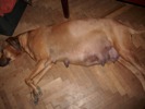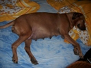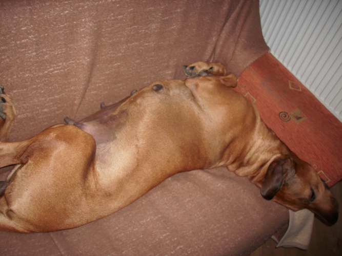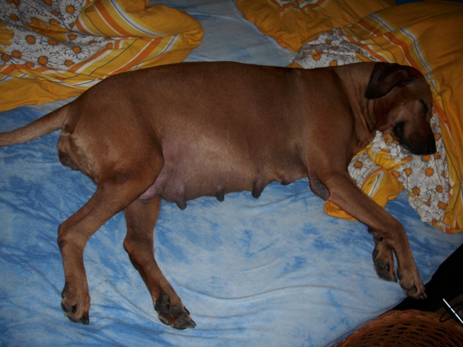Doma se naše mamina chová naprosto normálně. Je legrace pozorovat, jak si opatrně lehá, aby miminka nepotloukla. Její milovaná poloha je neměnná a zatím se jí podařilo z gauče nespadnout. Asi si to zapamatovala od poslední březosti. Dnes je březí 53dní. Už jsme pořídili mlíčko, pro jistotu a objednali kaši. Pokud to půjde jako při vrhu A bude Archynka plně kojit do 4týdne a teprve od 5týdne začneme s přikrmováním a pozvolným přechodem na granulky. Jak Archynka narostla je popsáno v sekci vrhB.