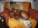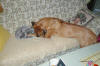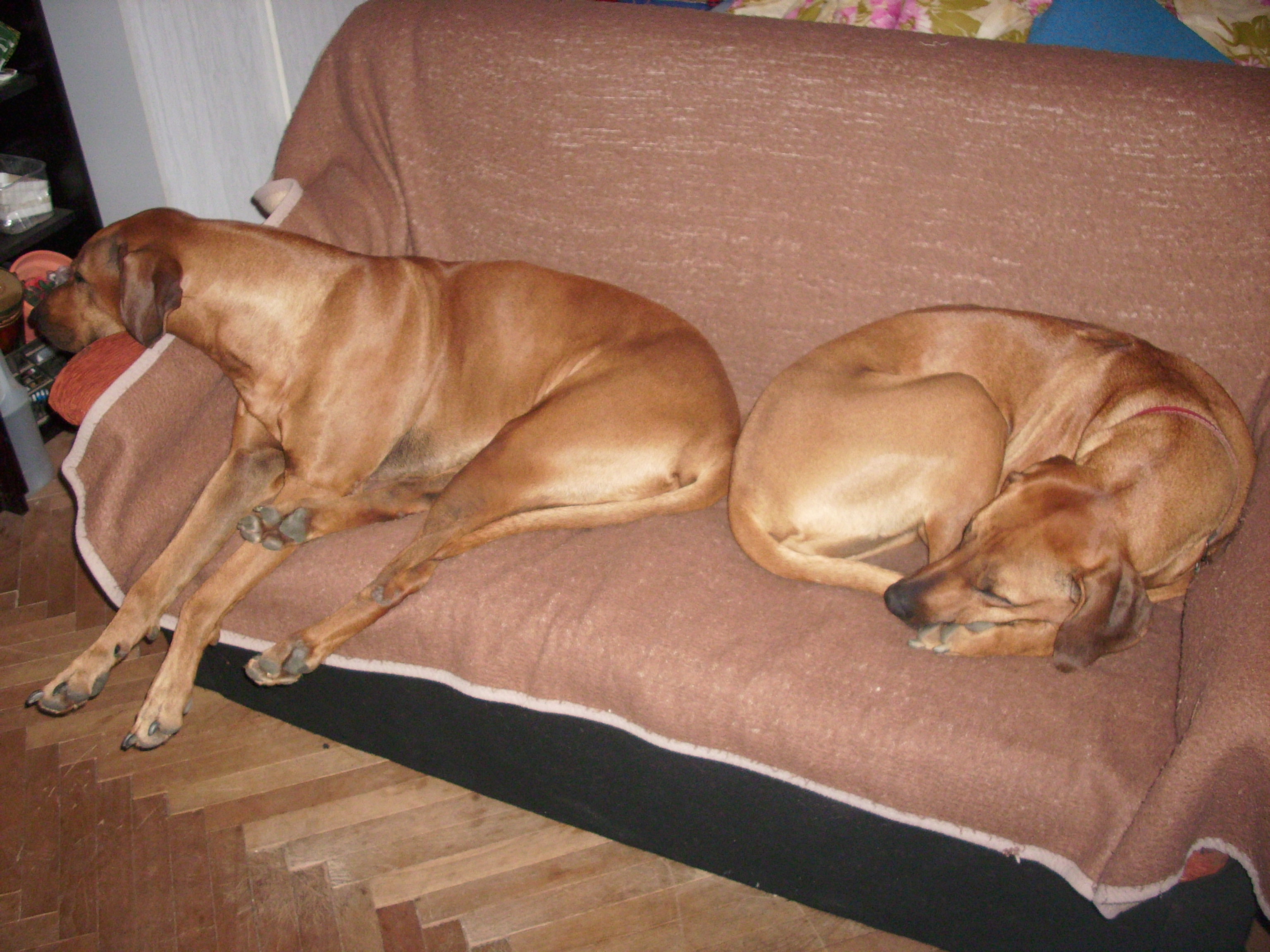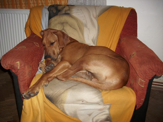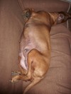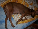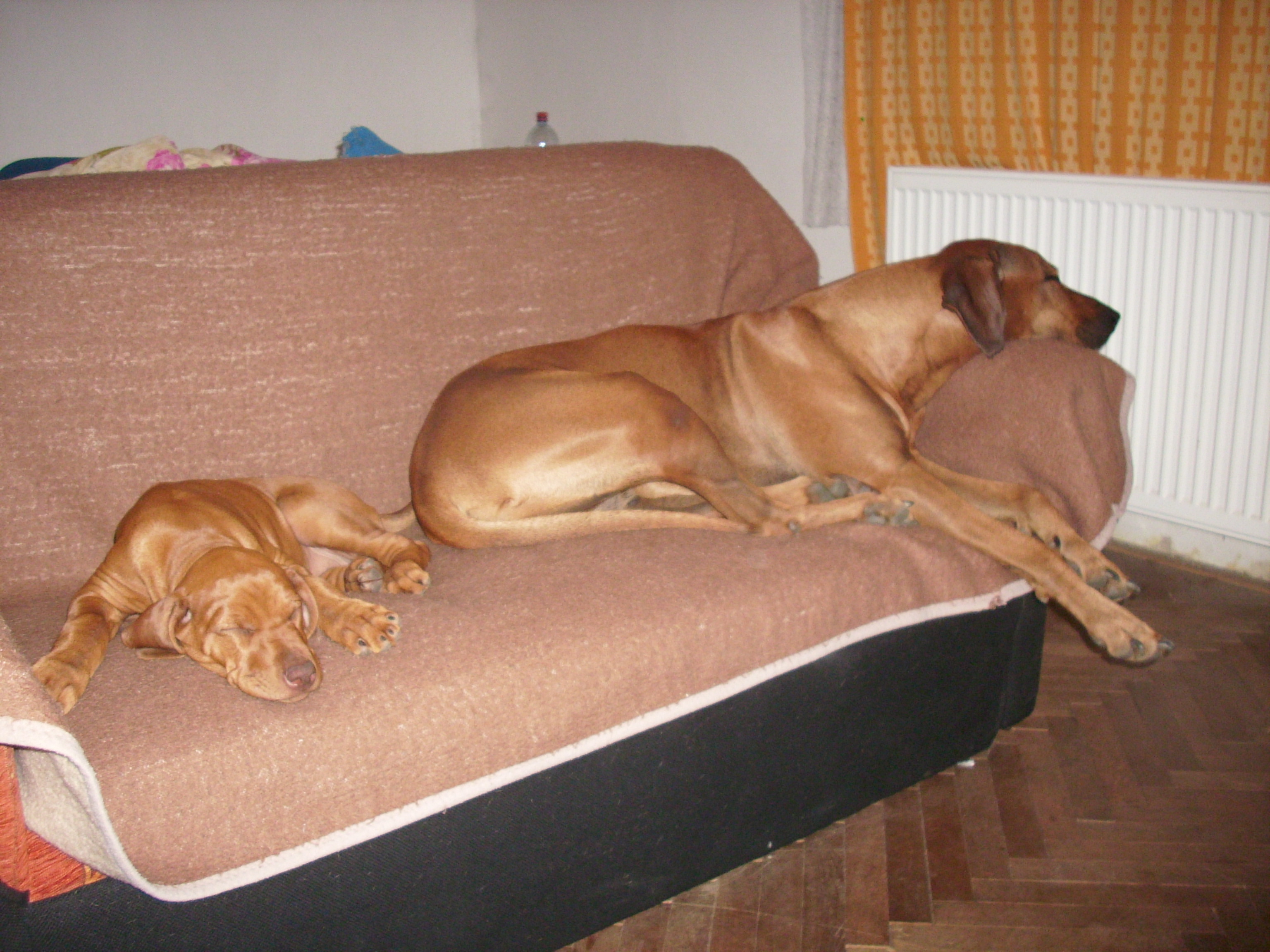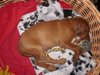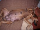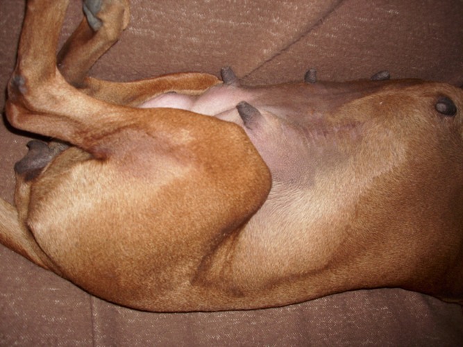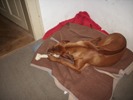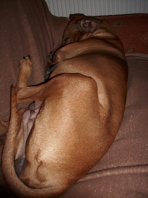 Doma se naše mamina chová naprosto normálně. Je legrace pozorovat, jak si opatrně lehá, aby miminka nepotloukla. Její milovaná poloha je neměnná a zatím se jí podařilo z gauče nespadnout. Asi si to zapamatovala od poslední březosti. Dnes je březí 53dní. Už jsme pořídili mlíčko, pro jistotu a objednali kaši. Pokud to půjde jako při vrhu A bude Archynka plně kojit do 4týdne a teprve od 5týdne začneme s přikrmováním a pozvolným přechodem na granulky. Jak Archynka narostla je popsáno v sekci vrhB.