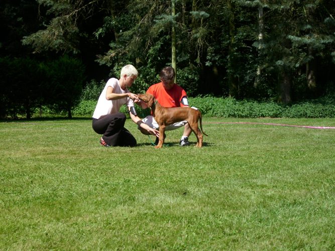 V neděli přijela paní Janická. Všichni už se snažili použít poznatky z předešlého dne. Mluvilo se o tom, co všechno sledují rozhodčí v kruhu. Kterých věcí by se měl vystavovatel vyvarovat, aby svým chováním při posuzování psovi spíš neublížil. Naše Angee paní Janickou rozesmála, když při prohlídce zoubků zjistila, že jich víc nemá než má (už nám jich chybí 6).
