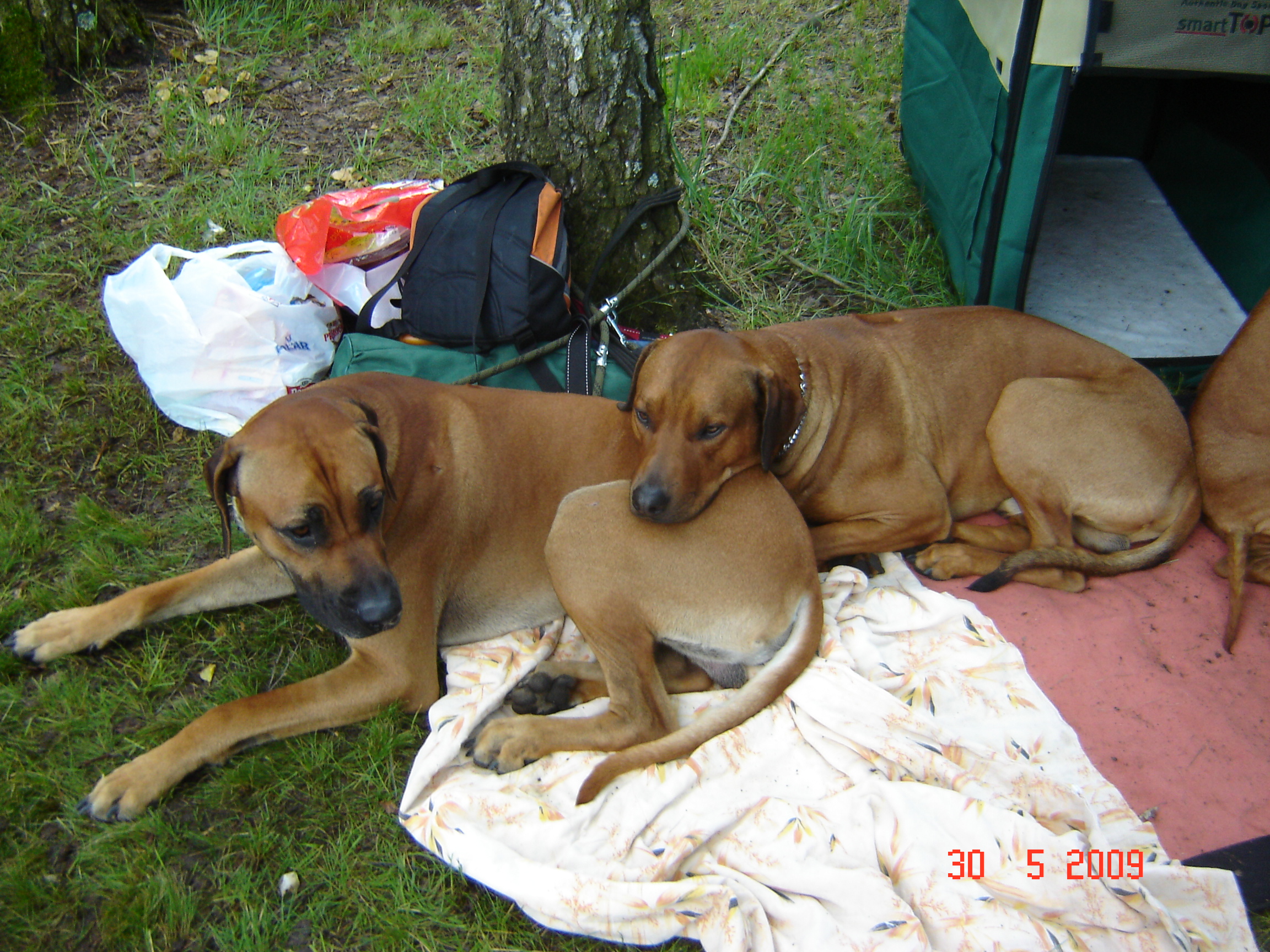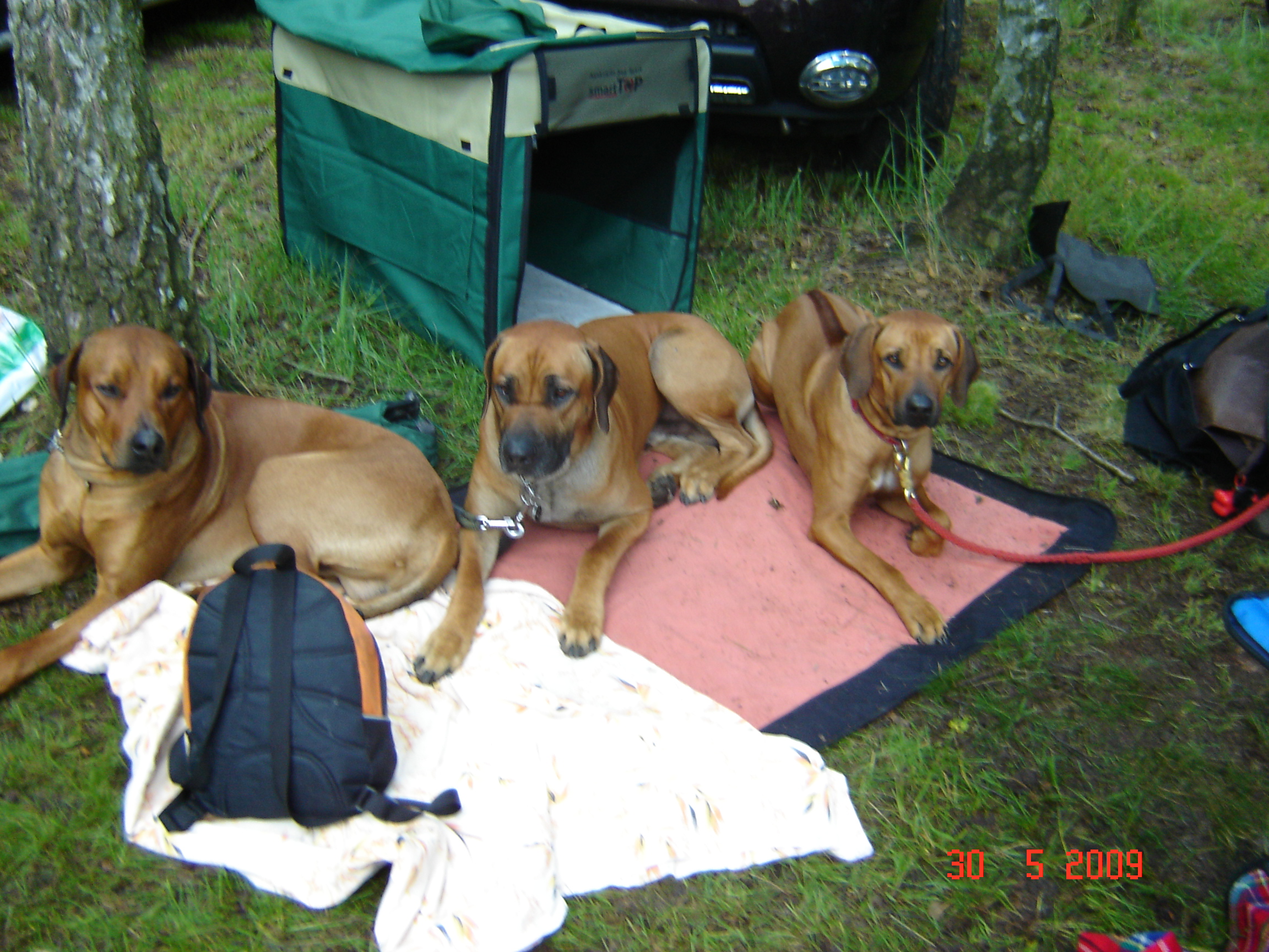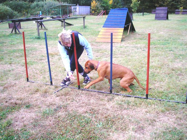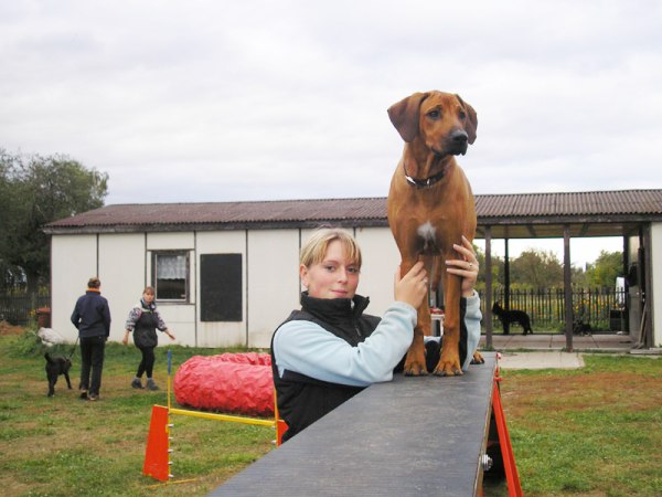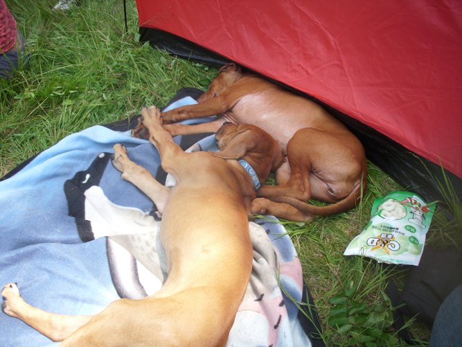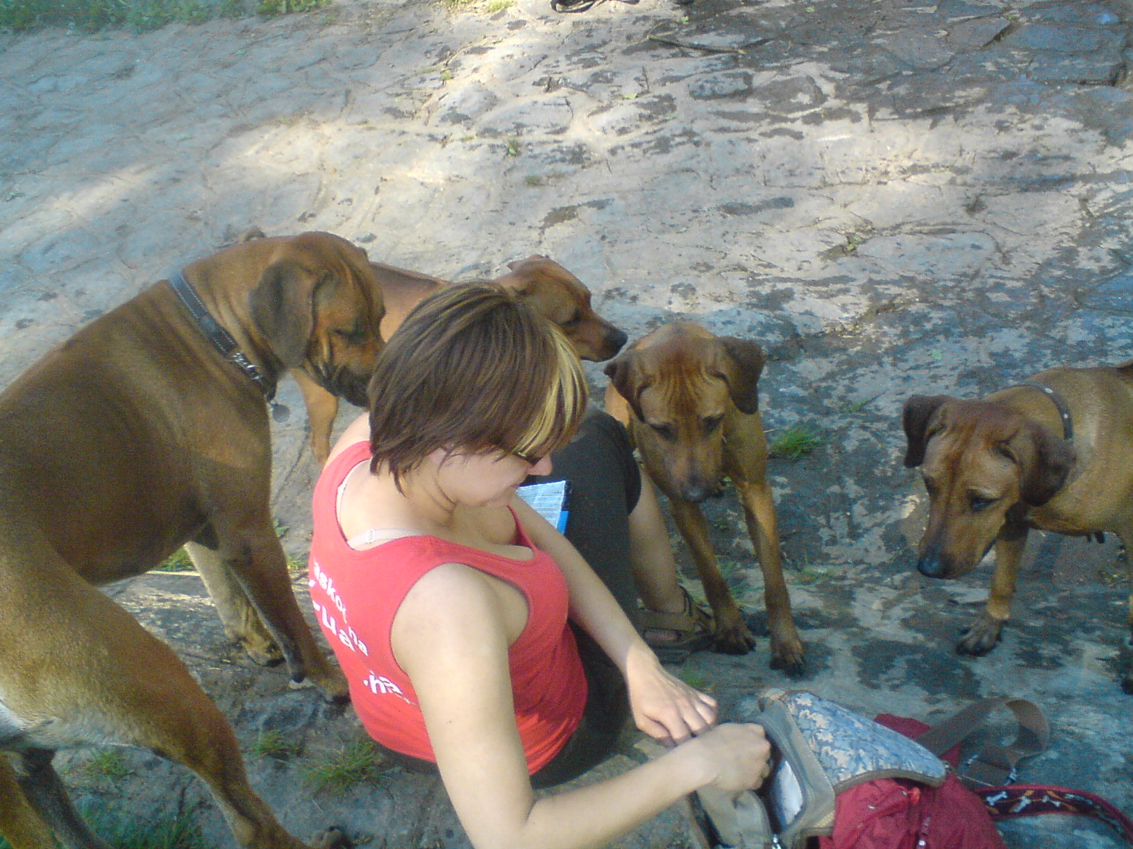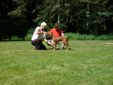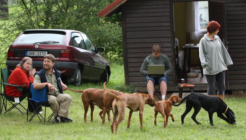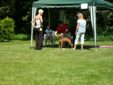 Tak jsme s našimi děvčaty a pupíky vyrazili na týdenní, jak jsme zjistili, opravdu adrenalinovou akci. Šlo o tábor se psy, se spoustou doprovodných akcí, pořádaný RR Sportem. Musím říct, že než nám došlo, že celý program je opravdu, ale opravdu jen orientační, byli jsme poněkud ve stresu. Potom už nás překvapovali jen naše holky. Naprosto jsme nepoznávali naši, jinak klidnou až flegmatickou, Archy. Když se mnou málem prošla plotem při pohledu na střapeček, začala jsem si dávat pozor. O tom jaké zvukové efekty dokázala vyluzovat Agathka se ani šířit nebudu. Snad stačí, když naznačím, že jsme dělali, že tohoto psa vůbec neznáme... Obě holky vystřihly dvě tréninková kola coursingu jak profíci. A to viděla Archy něco podobného poprvé v životě a Agi podruhé. Nemůžu zapomenout na způsob, jakým se uvedla Angee. Šli jsme se podívat k rybníku, který byl součástí areálu, než jsem stačila doříct větu „To není brod, opatrně“, byla naše frajerka ve vodě. A od té chvíle víme, že umí plavat. Jen si nejsem jistá, že jsem to chtěla zjistit zrovna takhle, ale budiž.