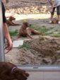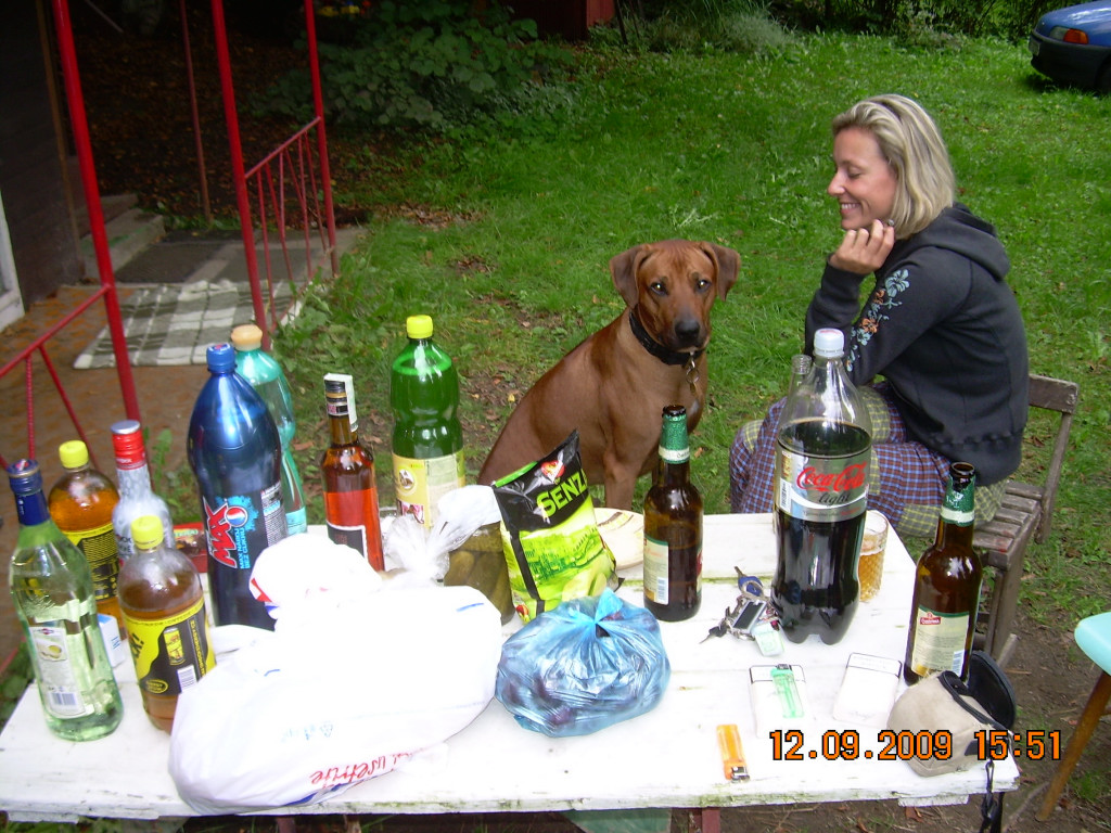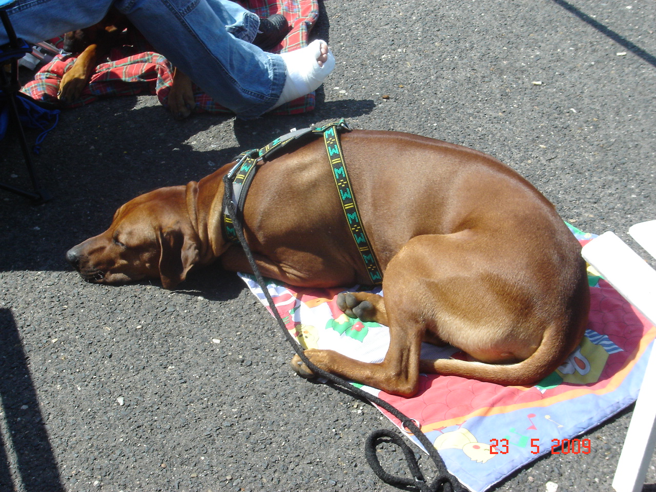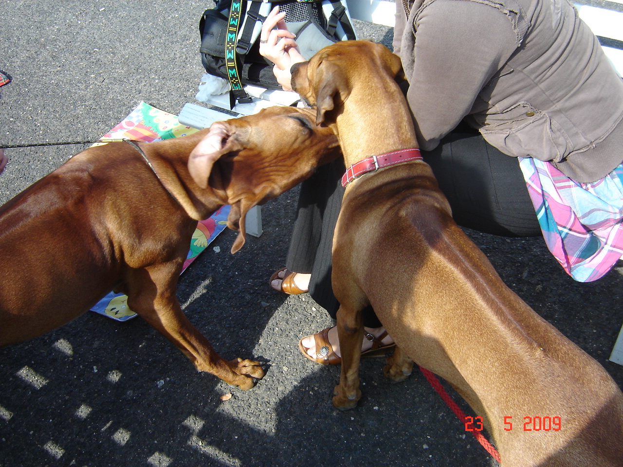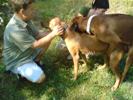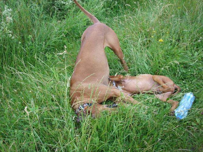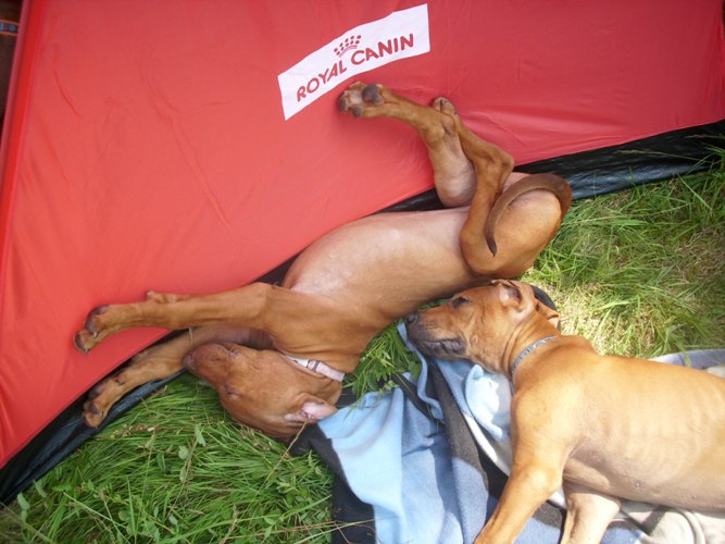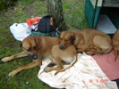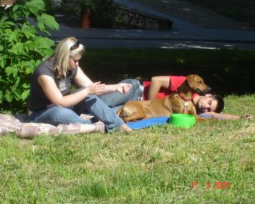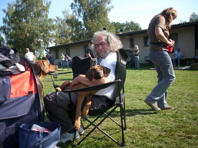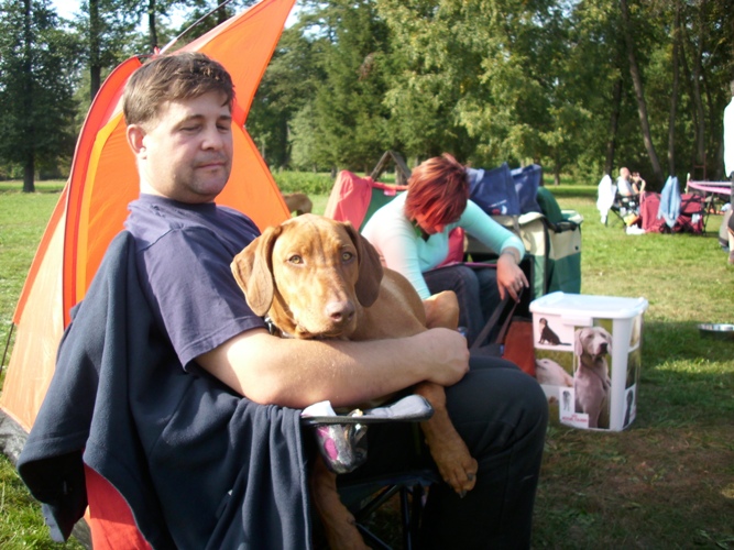 Počasí bylo nádherné, sešli jsme se s Anetkou. Hoši vodiči a řidiči odpočívali a nabírali síly (jak je vidět na fotodokumentaci našeho šerpy), a my okukovali kluky ve vedlejším kruhu. V konkurenci 18 fenek získala Anetka hodnocení VD a Agathka V. Protože nám bylo 200 km málo, vyrazili jsme za štěňátky do Velké Dobré. Byl to nádherný závěr dne. Měli jsme v "nohách" přes 600 km a byli neskutečně spokojeni.