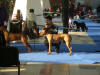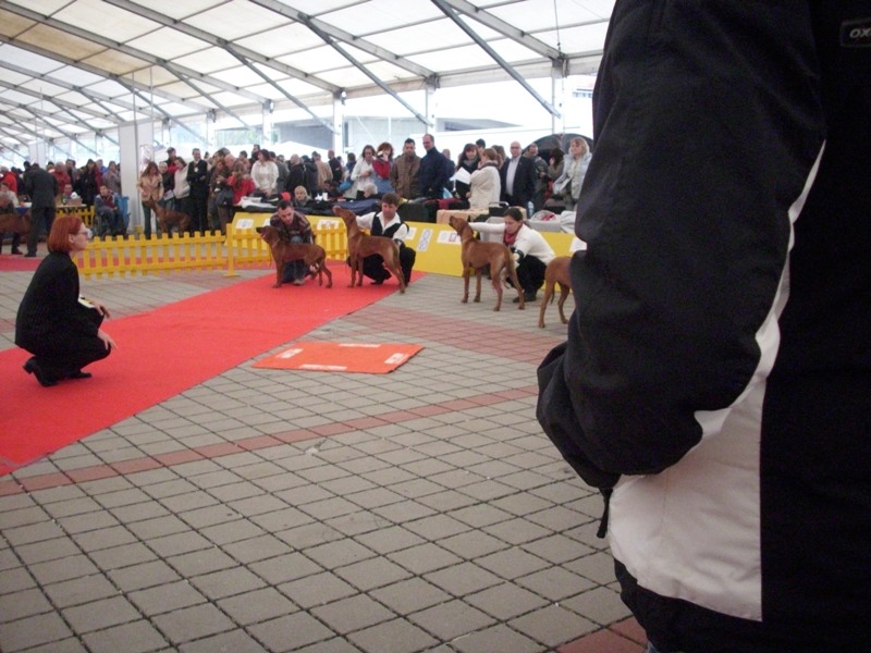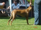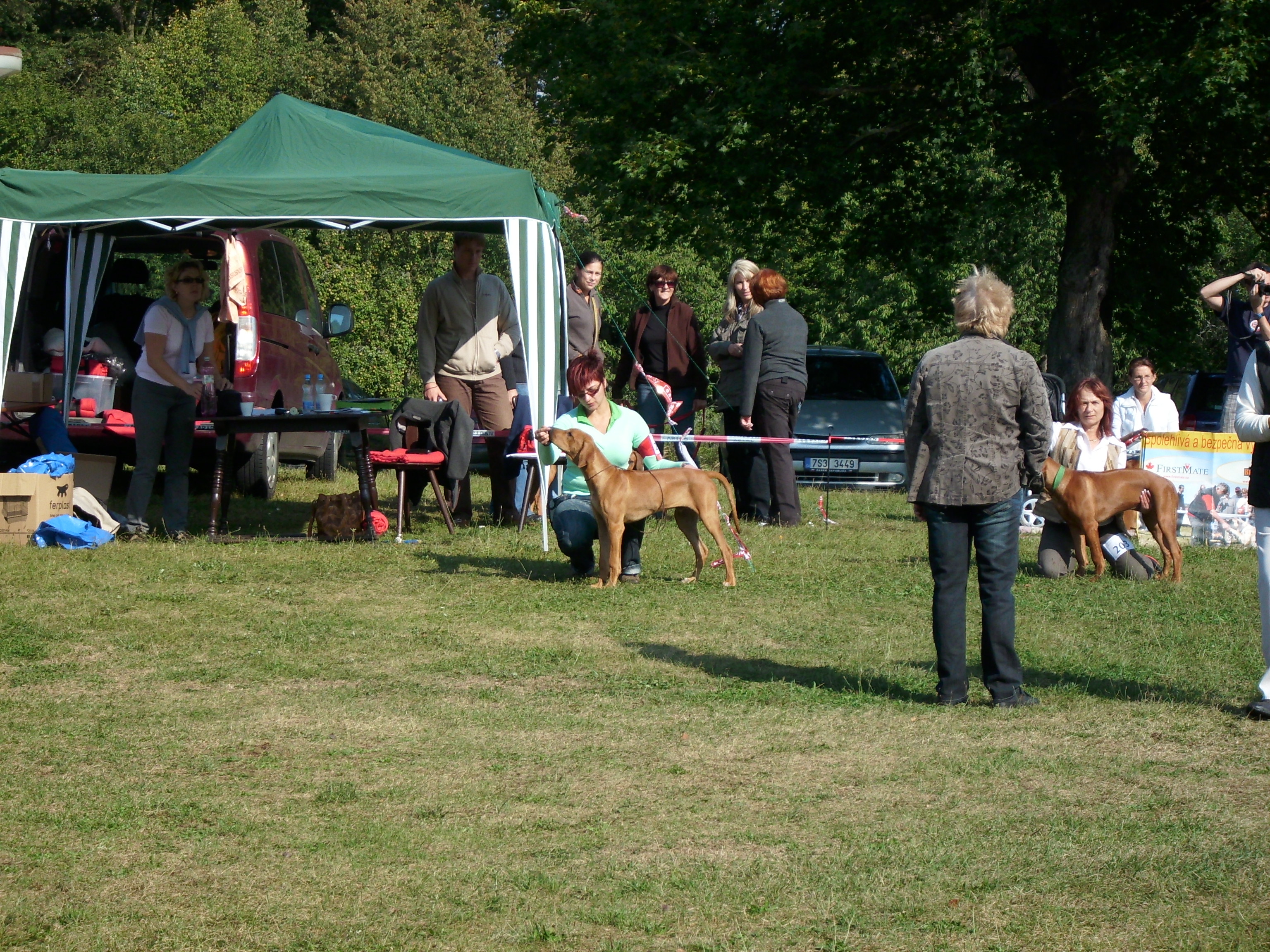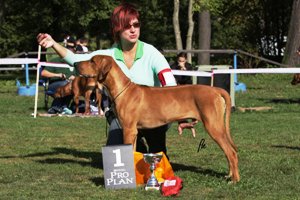 V sobotu jsme nastoupili do šíleně obsazených tříd. Byla tu mamka Brassi, ségry Mellory a Eiby. Mrknout přijel i brácha Rif (raděj si zlomil prst než by se tu s námi předváděl). Vědět, jak to bude všechno dlouhé, taky bych to zkusila. Pro nás pupíky to byla, až na Mellču, premiéra. Zvládli jsme jí na výbornou. Všichni jsme dostali VN a nádherné posudky. Aguška byla VD (což při známkách, které pan rozhodčí rozdával, velký úspěch) a mamča Brassi samozřejmě V. To není nic proti naší kámošce Assimě. Poprvé ve třídě mladých a hned V1 CAjC, nej mladý pes a BOB