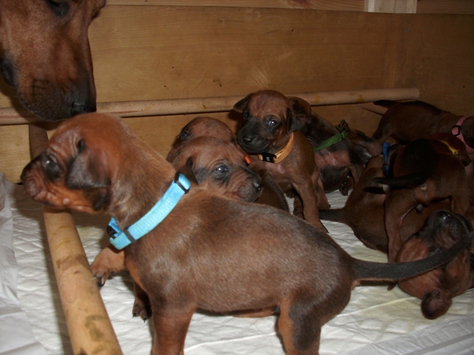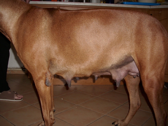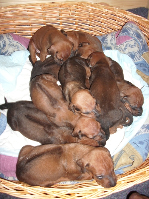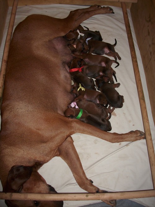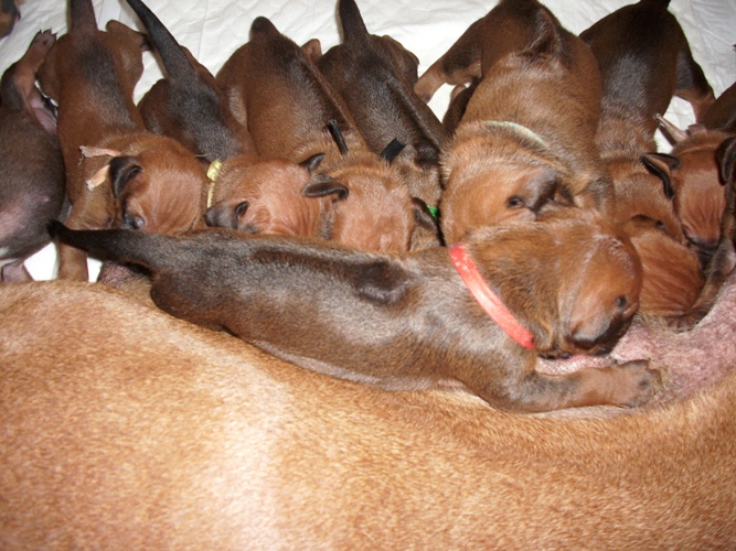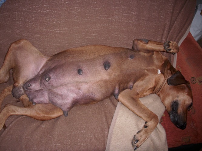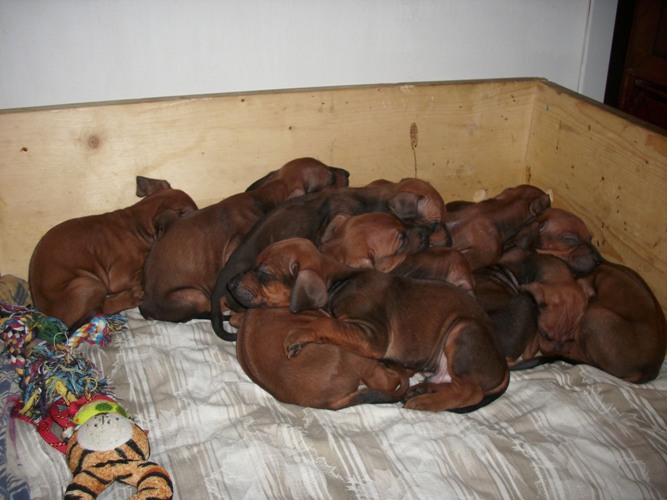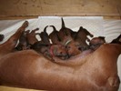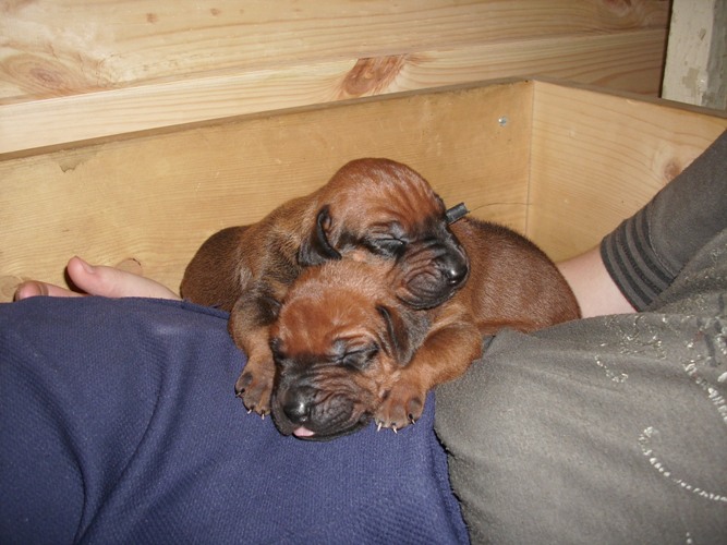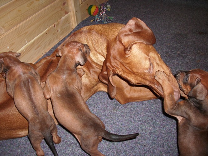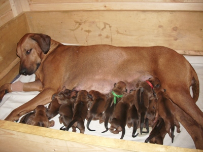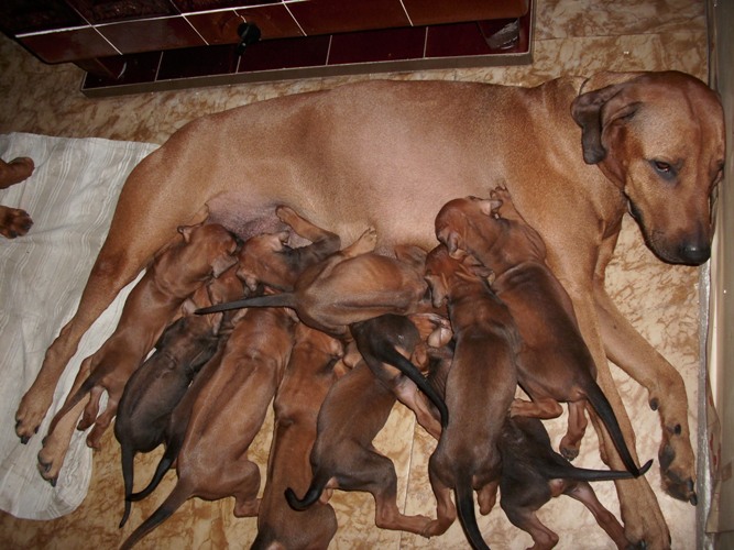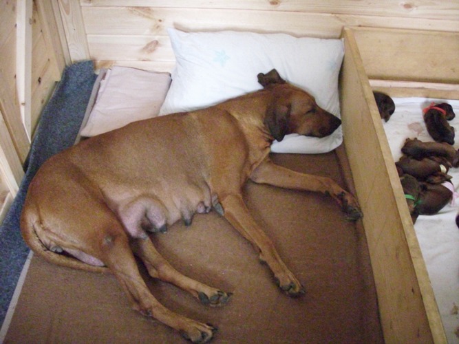 Tak jsme trochu nabrali sil. Máme za sebou první noc. Doplnila jsem podrobnosti o porodu do Vrhu B. Portrétky jednotlivých štěňátek doplníme po zítřejší první kontrole poradkyně chovu paní Janouškovcové. Doufáme, že jsme si vše zlé vybrali v chybějících ridgech a žádný zálomek ani DS nás nepotká. Archynka se chová jako výborná mamina ovšem poněkud hysterická. Mimisové se nesmí rozdělit do více partají neb matka má dojem, že když jim každou druhou minutu nenamasíruje pupu, tak to nepřežije. Jsem moc ráda, že hned po pár hodinách po porodu začala jíst. Minule to byl velký problém. Tentokrát si své chutě vybrala v březosti a vůbec nechápu, z čeho vlastně ti mimisové vlastně tolik vyrostli. Je vidět, že základ má Archynka dobrý. Po porodu je na svých 38kg a protože i posledně 4týdny plně kojila svým smetanovým mlíčkem nebude to snad tentokrát jiné. Papká každé 2hodiny. Zatím jen vařené a samozřejmě sýry a tvarůžek. Až se jí uleví po císaři přibudou samozřejmě dobré granulky.