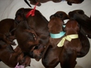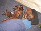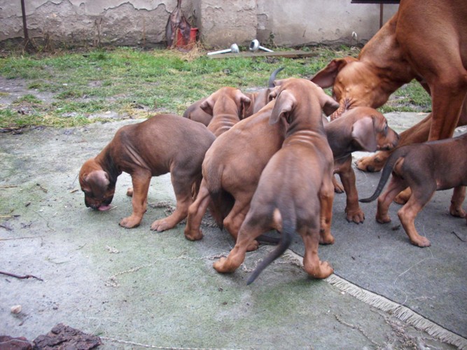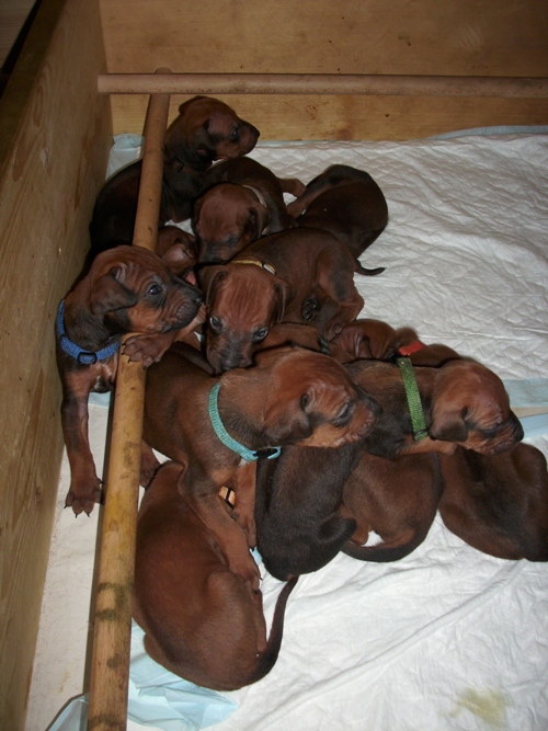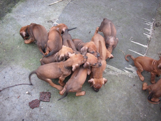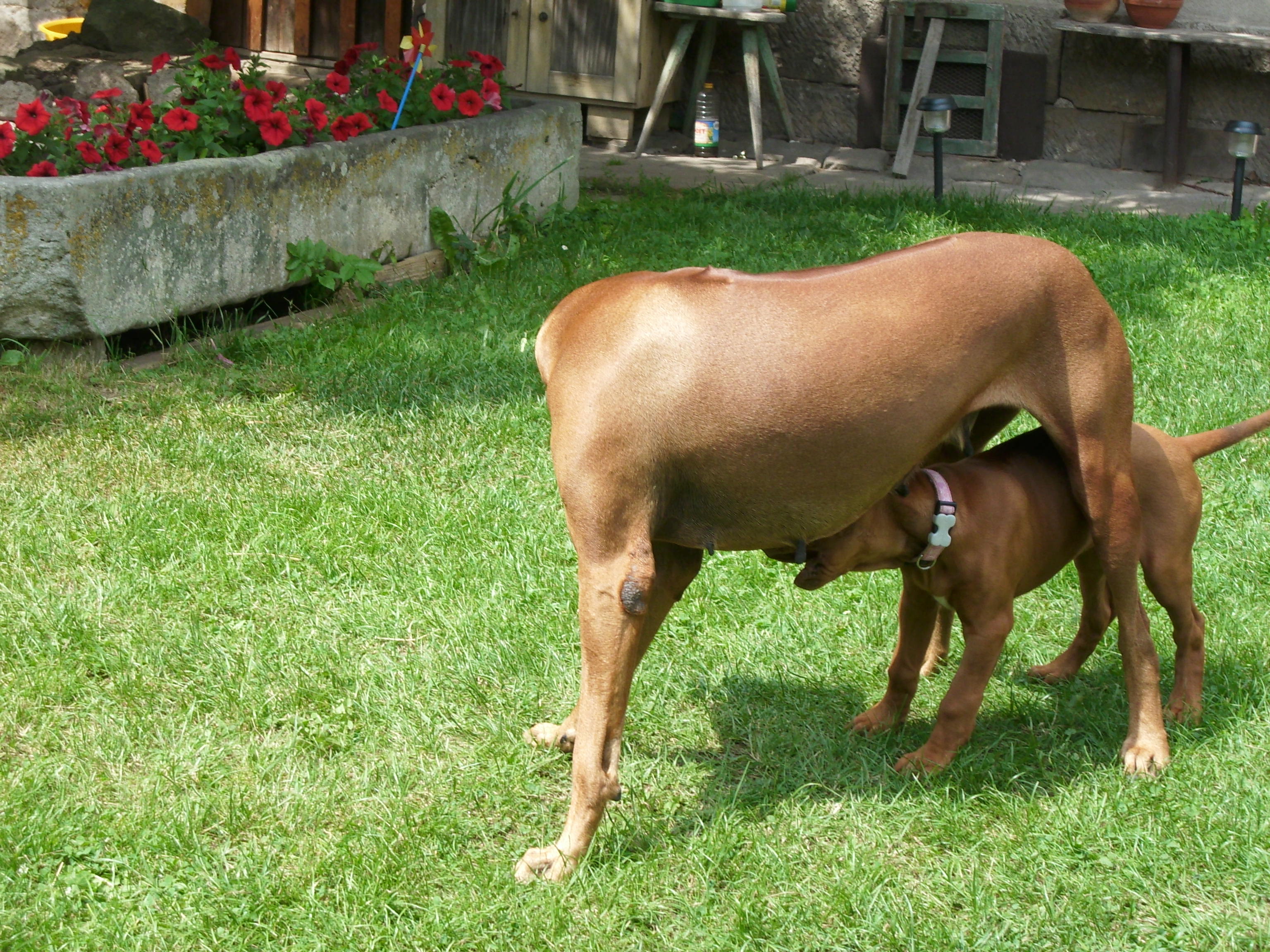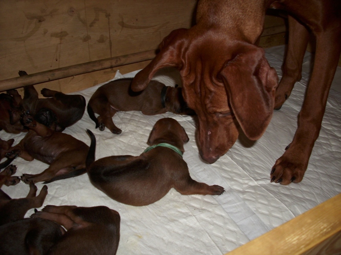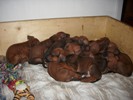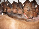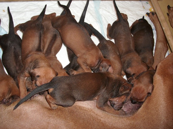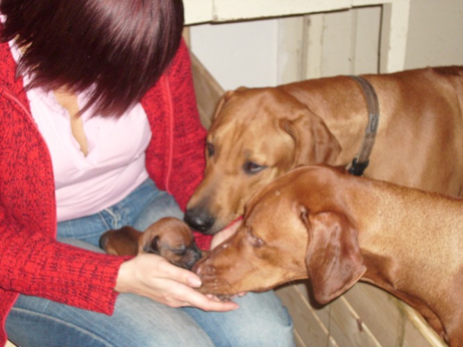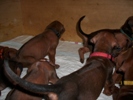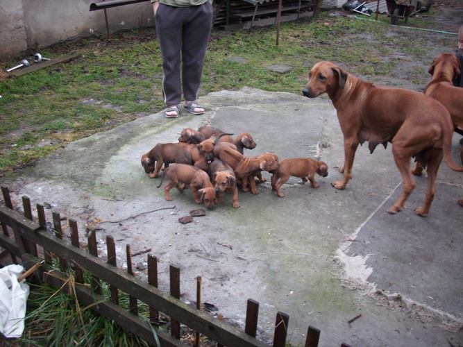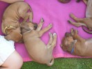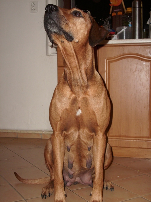 Tak jsme trochu nabrali sil. Máme za sebou první noc. Doplnila jsem podrobnosti o porodu do Vrhu B. Portrétky jednotlivých štěňátek doplníme po zítřejší první kontrole poradkyně chovu paní Janouškovcové. Doufáme, že jsme si vše zlé vybrali v chybějících ridgech a žádný zálomek ani DS nás nepotká. Archynka se chová jako výborná mamina ovšem poněkud hysterická. Mimisové se nesmí rozdělit do více partají neb matka má dojem, že když jim každou druhou minutu nenamasíruje pupu, tak to nepřežije. Jsem moc ráda, že hned po pár hodinách po porodu začala jíst. Minule to byl velký problém. Tentokrát si své chutě vybrala v březosti a vůbec nechápu, z čeho vlastně ti mimisové vlastně tolik vyrostli. Je vidět, že základ má Archynka dobrý. Po porodu je na svých 38kg a protože i posledně 4týdny plně kojila svým smetanovým mlíčkem nebude to snad tentokrát jiné. Papká každé 2hodiny. Zatím jen vařené a samozřejmě sýry a tvarůžek. Až se jí uleví po císaři přibudou samozřejmě dobré granulky.