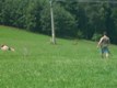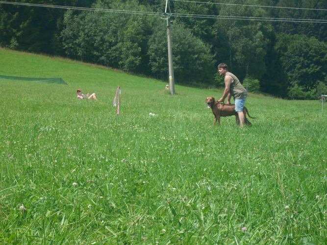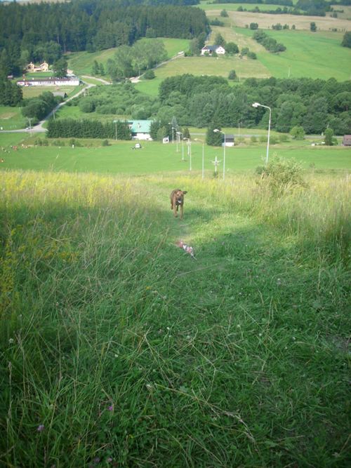 Odpoledne byl další coursingový trénink. Aby nebyla nuda, běhalo se do vrchu na sjezdovce. Naši pánové to „vymysleli velmi dobře“. Oni budou vypouštět holky dole a my děvčata je budeme nahoře odchytávat. Vážně paráda, jen kdybycom ten kopec nemuseli zdolávat "po svých". Málem jsem tam nechala plíce. Ještěže mě naše Gee statečně táhla. Chudák Alenka musela Damíka ukecávat. Ale stálo to zato. Holky byly úžasné a musím dodat, že v druhém pokusu měla Archy už předpisový zákus. Energie Agathky i Archynky nás nepřestávala udivovat. A to jsme s Archy chodili pravidelně plavat. Přeplavat 2x za sebou rybník tam a zpět nebyl problém – jen páníček plaval moc pomalu a pak si nedovoleně pomáhal, když se chytil Archy a nechal se táhnout. No uznejte, to je ale podvodník.