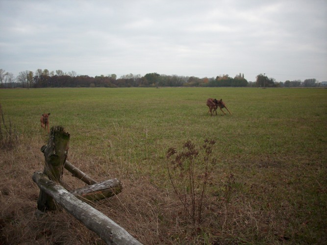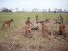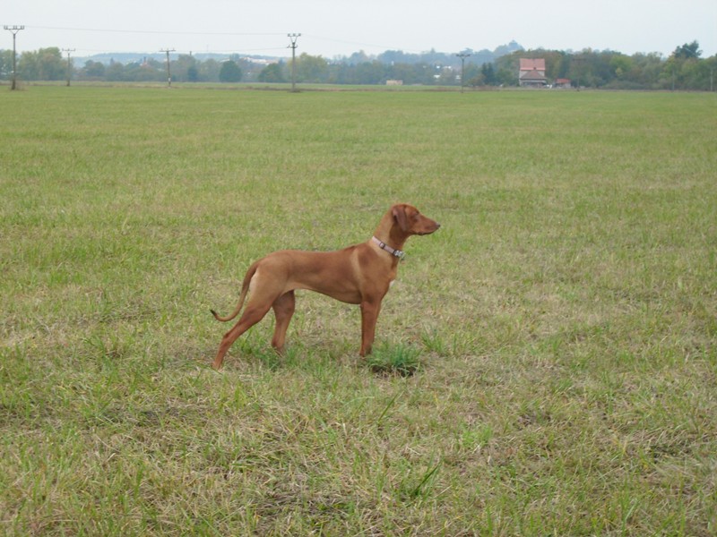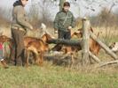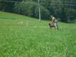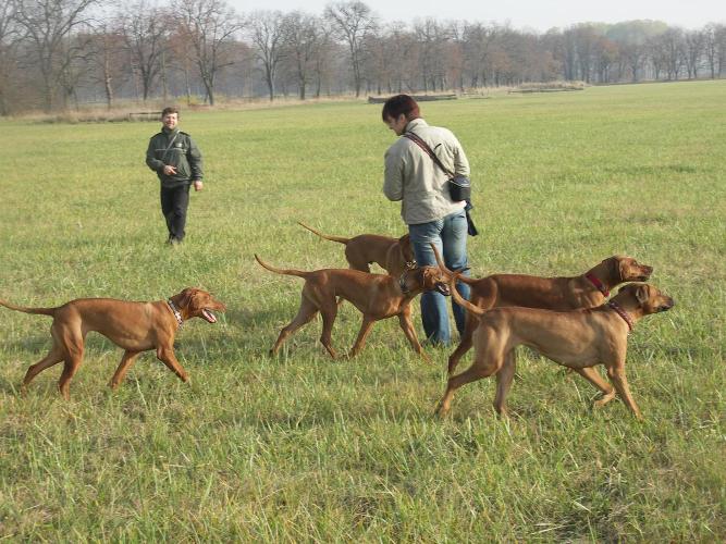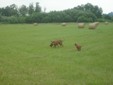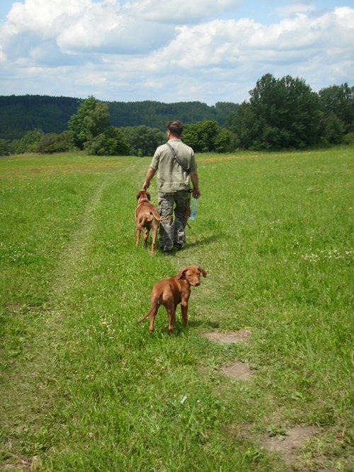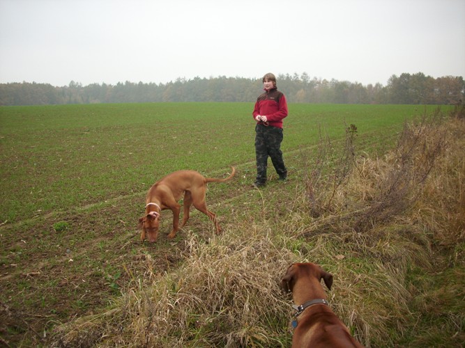 Ale přešli všichni. Naše louka s překážkami byla volná a zdálo se, že nikdo naši vycházku nezpestří. Šli jsme okouknout koníky na Ostrova a tam poprvé narušil náš klid zajíček. Viděla jsem ho dřív než zrzci, takže bylo dost času je zaujmout něčím jiným. Ale Fanny to bylo vážně líto. Alespoň ho urizovala svým ostřížím zrakem. Při pohledu směrem, kterým se vydal jsme zjistili, že nejen zajíčci, ale i srnečky courají po této louce. No snad bychom je omluvili, že nám narušují program, ale po asfaltce za nimi rozvážel traktor myslivce do rojnice. Nezbývalo nám než se vrátit na naši milou loučku. Angee ukázala jaký je norník profesionál a Dam s Melčou nacvičovali řecko - římský. Myslím, že jsme si to všichni opravdu užili.