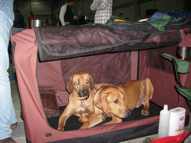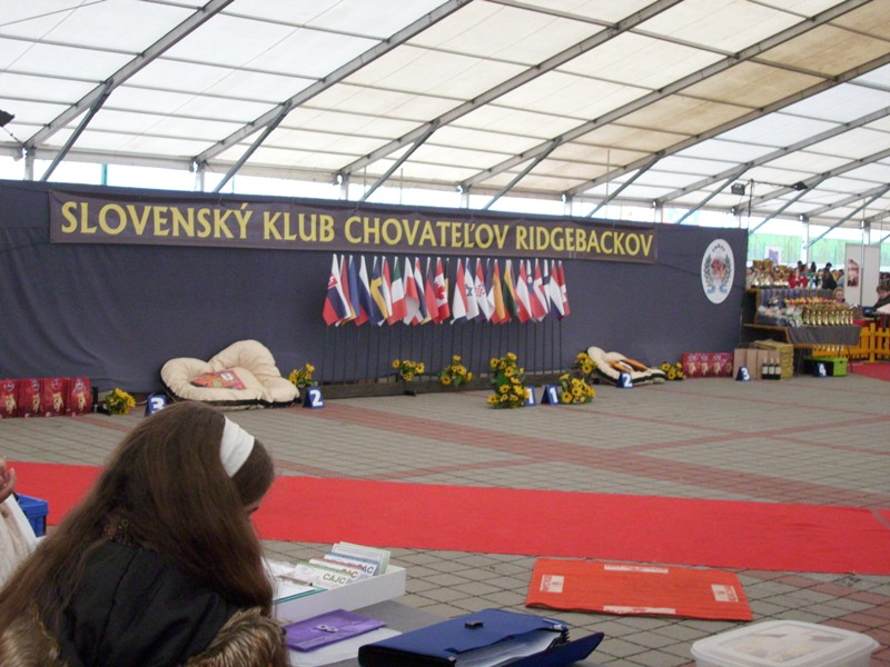 Tak jsem v létě v pominutí smyslů zkoušela, jestli můj účet umí platit v eurech a přihlásila nás na SV SKRR při Světové výstavě psů v Bratislavě. Byl to nápad okamžitý a tím pádem naprosto nesmyslný. Ale když už se to podařilo a já zjistila, že peníze jsou schopny putovat kterýmkoli směrem, vyrazili jsme. Milan spal sice jen 3hodiny po návratu z divadla, ale byl statečný. Bratislavu jsme objevili po 3hodinách zběsilé jízdy a musím říct, že její příprava na SVP byla úžasná. Směrovky k Inchebě jsem nějak nepostřehla, jen jsme na jednom semaforu viděli ceduličku velikosti 10 x 30cm s pidi plakátkem výstavy. Úžasné. Ale trefili jsme a po jízdě kolkolem Incheby zaparkovali auto za cedulí "každé auto odtáhneme". Protože před i za námi zaparkovali naši ruští bratři říkala jsem si, že těm auto nikdo neodtáhne a my jsme mezi nimi pěkně schovaní. Další super věc byla, že avizované stánky klubu, kde měly být k vyzvednutí lístky nešlo najít. Na rozdíl od Denisy s Glorčou jsme my padli na rozumné lidi a po zakoupení vstupenky pro Milana nás pustili dovnitř. Následovala snaha najít pavilon E. Po menších peripetiích jsme objevili i ten. K naší radosti jsme našli rodinu v podobě Evy a Mirky s Brassi a Melčou.