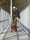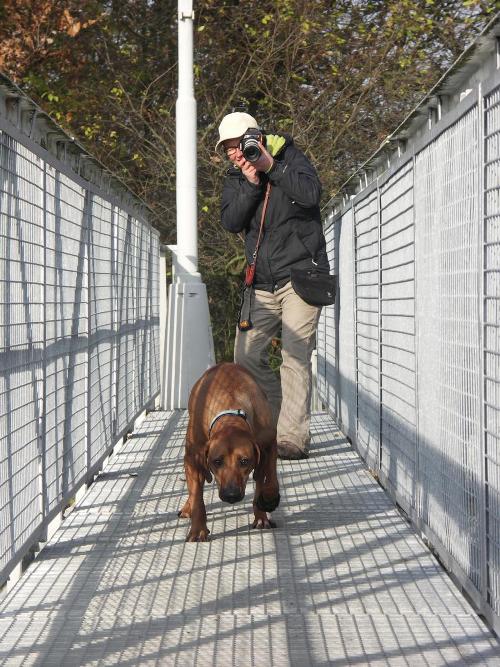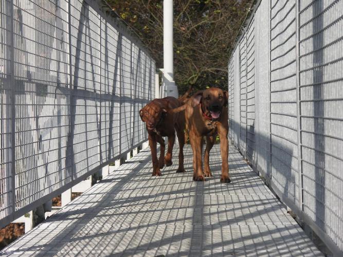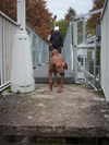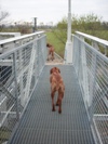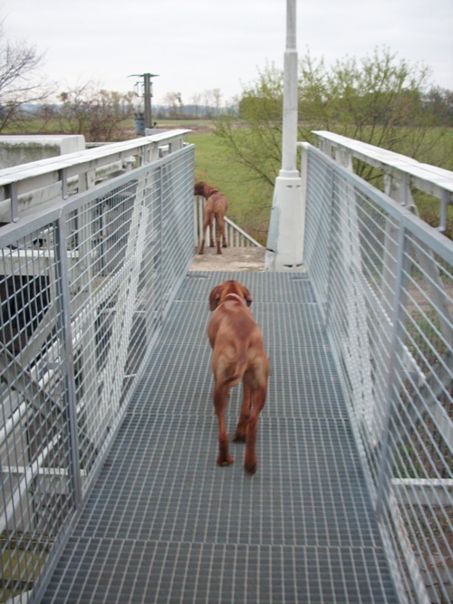 Angee chvátala za sourozenci Azinkem a Melčou a maminu Brassi a tetu Conny oňuchňávala ze slušné vzdálenosti. Vyrazili jsme na naši klasickou trasu. Jako každý kdo za námi přijede, byla i tato smečka podrobena zkoušce nepříjemných povrchů. Všichni prošli bez ztráty kytičky, jen Brasska měla jakýsi dojem, že se u toho musí vykoupat. Ale proč ne, náhon je teď čerstvě napuštěný a voda v něm je přiměřeně čistá. Přechod přes jez byl po této zkoušce celkem v poho. Musím říct, že nejvíc se mi líbila Fanča, která naprosto změnila tvar svého těla a vypadala jak mystický pes z Krotitelů duchů.