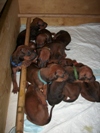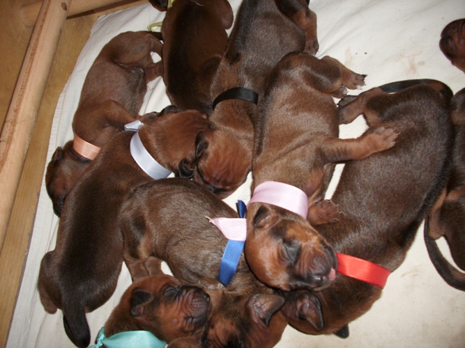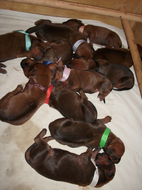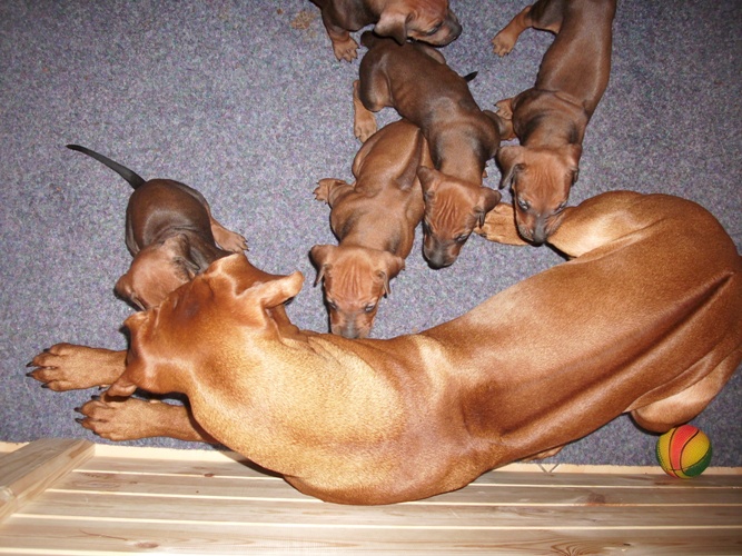 Jak už někteří vědí od naší Agušky máme už naše pupíčky. Naše mamina nám to opět zase zpestřila. Našich očekávaných 8 - 9 se zvrhlo v Archynčino vyrovnávání se s vlastním Ačkovým vrhem. Ano, pochopili jste správně. Naše zlatíčko si opět nechalo v bříšku vyrůst 14 zrzounků. Porod byl velmi dlouhý. Bohužel poslední 14 standardní chlapeček to nezvládl a přes rychlý císařský řez se ho nepodařilo zachránit. Ale jsem moc ráda za ostatní, protože jsou neskutečně nádherní a velice vyrovnaní. Je pravdou, že se nám podařil ze dvou třetin pet vrh, ale pro zájemce o tyto úžasné psy to určitě zádrhel nebude. A my jim budeme hledat ty nejúžasnější páníčky na světě. Slibuji, že jen co naberu trochu sil, doplním veškeré podrobnosti do vrhu B. Jinak máme 7 kloučků a 6 holčiček. Aspoň jednu fotečku pro představu ( Archynka není v podroušeném stavu, ale právě se vrátila z císaře). Ještě jednou všem obrovské díky za podporu a milá slova. Hodně nám to pomáhá. Kdo by se chtěl přijet podívat, tak se klidně ozvěte. Archynka nechávala pupíky socializovat už v bříšku a my v tom hodláme pokračovat. Tak zítra tu bude vše. Nějaké fotečky už jsou u Dama. Nedalo mi to a aspoň pár foteček z porodního dne.