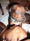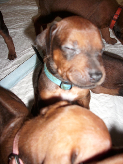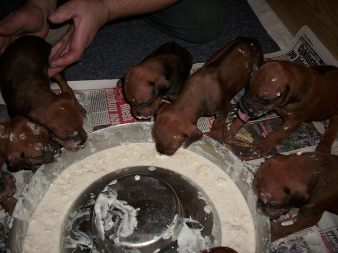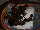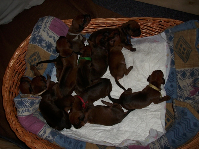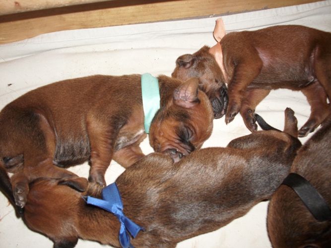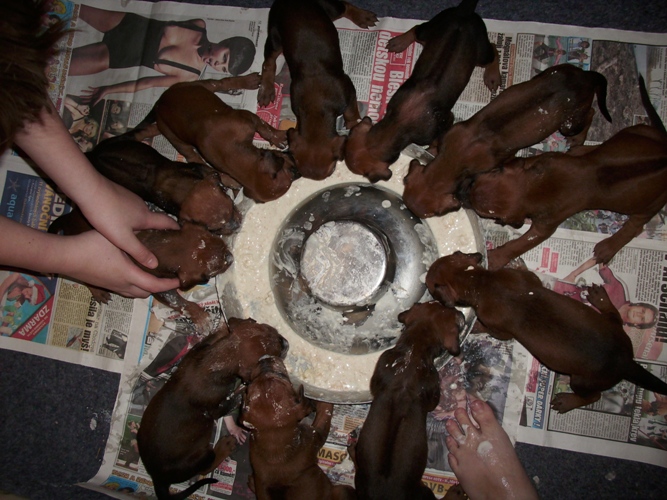 Dnes jsou nám 3 týdny. Jsme prostě velcí mimísci, kteří už koukají a začínají slyšet. Honíme se mezi sebou a taky začínáme ožďabovat tetičku Angee, kdykoli k nám strčí hlavu. A že ona jí sem strká často. Na oslavu nám panička poprvé udělala tvarůžek se štěněcím mlíčkem a piškotky. To vám bylo žůžo. Tedy páníček si to moc nemyslel, když jsme mu celý upatlaní utíkali z vyhraženého prostoru. Panička s Jendou se ohromně bavili, když se nás snažili odlíčit. Jinak vážíme od 1,2 - 1,6kg. Panička je spokojená, protože po odčervení jsme dostali trochu průjem a tak jsme byli spíš jak malé průtokáčky. Ale už je to v pořádku a budeme větší a větší.