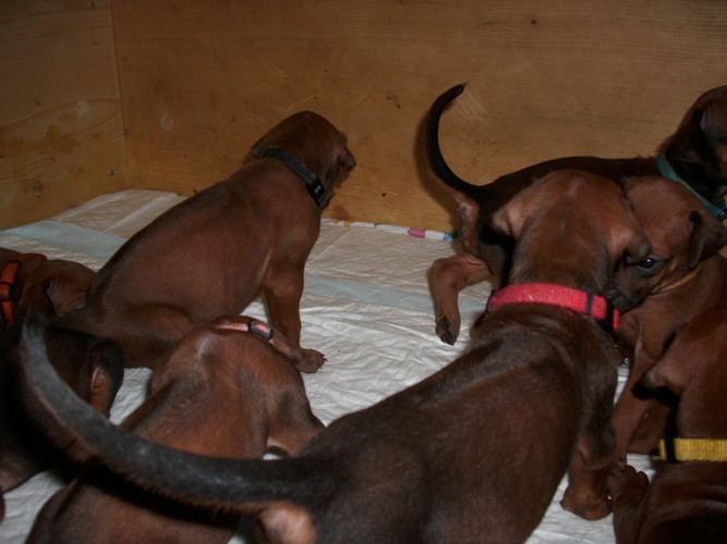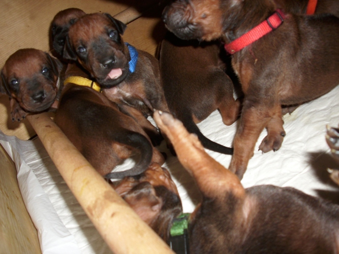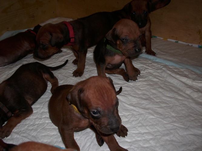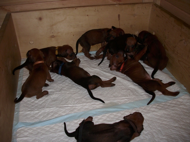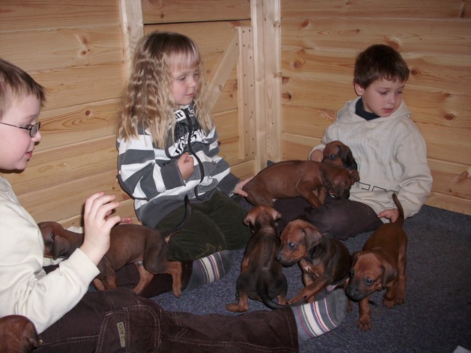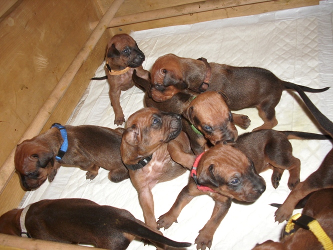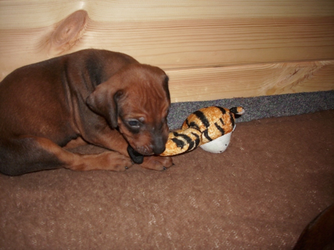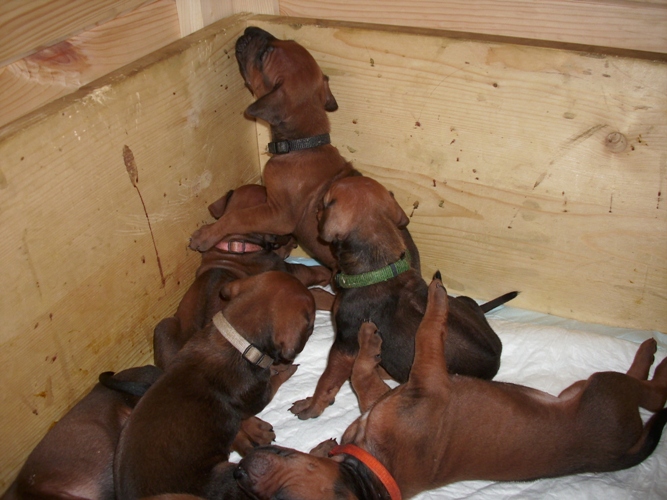 Je nám 5týdnů. Tetička Gee si s námi moc ráda hraje. Úplně nejradši si vleze do svého bývalého pelíšku a provokuje. Mám pocit, že v něm nikdy netrávila tolik času jako teď. Jsme opět zvážení a máme přistřižené drápky. Panička posílala naše jména na ČMKU kvůli tetovacím číslům. Jen co nám dorazí, tak je doplníme k jednotlivým štěňátkům. Do té doby snad budou hotovy i galerie, na kterých pracuje náš dvorní fotograf a velký pomocník se stránkami Honza.