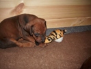 Co jsme dělali čtvrtý týden našeho života? Hráli si s tetičkou Angee. Taky jsme měli milou návštěvu. Přijel se podívat páníček našeho Tonouška s dětmi. To vám byla paráda. Mimise to tak unavilo, že chrupkali 3hod v tahu. Mimochodem, Tonoušek nejen, že vyhrál svou kategorii na Mikulášském coursingu, on se stal i absolutním vítězem. Což znamená, že měl nejrychlejší čas ze všech zúčastněných pejsků. Gratulujeme!