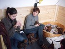 Využili jsme mírného oteplení a toho, že na chaloupce je lepší travička a poprvé vypustili mimise ven. No, nemůžu říct, že by z toho byli urvaní, ale aspoň se skoro všichni vyvenčili a unavili tak, že celé zbylé odpoledne se na chaloupce chovali slušně. Pokud nespinkali, tak je měl stále kdo chovat. Granulky jsme s sebou nevezli, protože naše velká živá konzerva to zvládla sama.