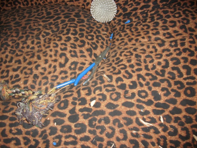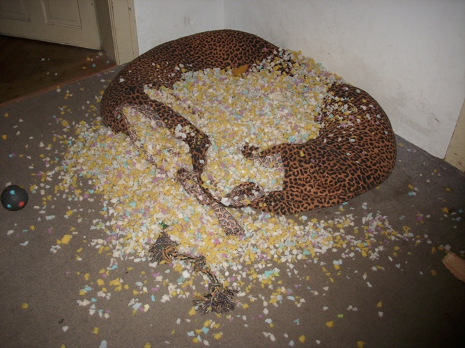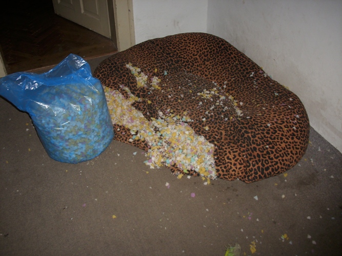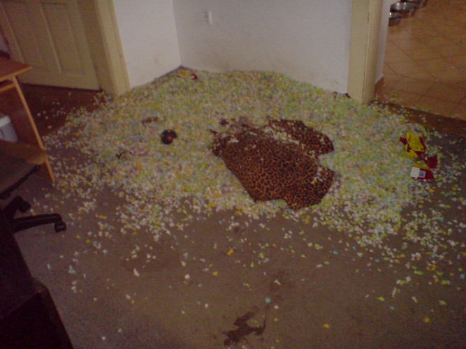 Říkala jsem si, že další aktualizaci nechám na víkend, ale nedá mi to se nepodělit. Od pondělka jsme všichni minimálně do půl druhé pryč a tak nastalo zanechávání holčiček doma. Což o to Archy v tom má jasno - když nejsou páníčci doma, tak se spí. Angee to ještě takhle nevidí. Chápu, že si bere k hračkám své milované polínko. Už méně chápu její zaujetí pro nářadí všeho druhu. Zřejmě má technické nadání (možná jí přihlásíme na průmku - rozborky jí jdou slušně), které nám chovatelka zatajila. Faktem je, že televizi si po jejím zásahu do šňůry už asi nepustíme. Ovšem stále mě těšilo to, že pelíšek byl nedotknutelná věc.