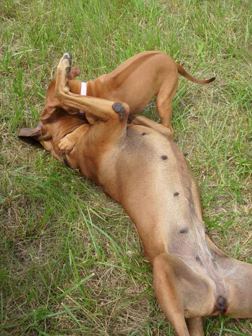 Alenka byla nucena odstoupit, Agáthka si roztrhla bříško na zadní tlapce. Pan rozhodčí to viděl jako velký problém. Kdybych nezažila stejného rozhodčího při posouzení psa po operaci, nesla bych to lépe. Bylo mi líto Alenky a Agu, jejich zbytečně dlouhé cesty a promarněného dne. :-(