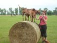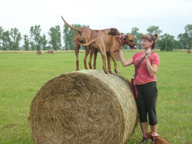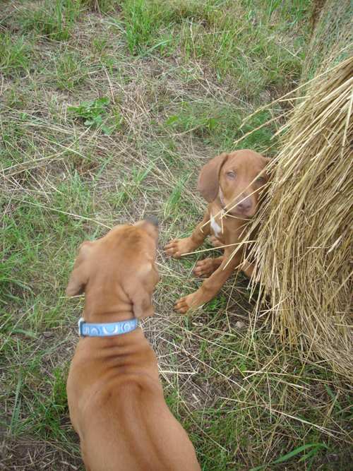 Většinu víkendů trávíme vycházkami. Vyrážíme buď samy holky, občas jde s námi Jenda. Cestu k brodu si moc užíváme. Na louce nám nechali balíky sena a tak kolem nich můžeme lumpačit. Archynka mohutně obíhá a dělá, že neumí vyskočit nahoru. Jojo, musí mít sebou Agáthku a pak to jde samo. Brod je taky prima a voda je správná. Pobíhání střídají bitky a honičky.