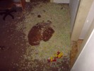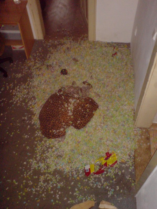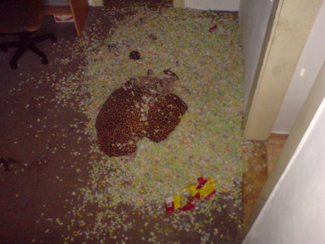 V sobotu jsem šla do práce a holky tím pádem zůstaly doma samy, protože část rodiny emigrovala na objížďku příbuzenstva v rámci dušiček. Vítek pro změnu zůstal v HK, protože byli s Janou v pátek v kině. No, vyfotila jsem si původní stav pokoje. Geena si k hračkám při posledním venčení před odchodem přinesla ještě polínko. Asi se jí zdálo, že toho má málo. Odcházela jsem s pocitem, že snad najdu dům v pořádku. Musím říct, že mě holky či spíše Angee příjemně překvapila. Bylo tu vytažených jen pár ponožek (zřejmě s nimi hrála golf), spadlé hodinky a zdá se, že hodlala něco spojovat či co, protože si vzala kleštičky. Ale nějak jí nevyhovovala povrchová úprava.