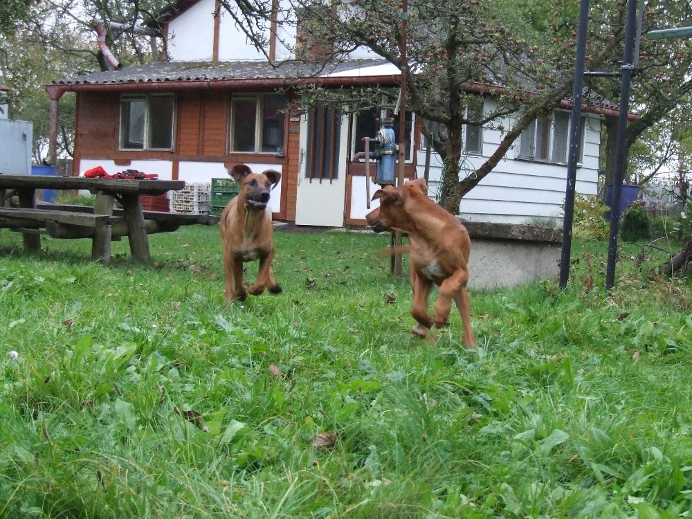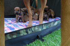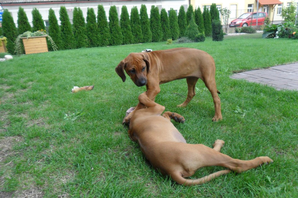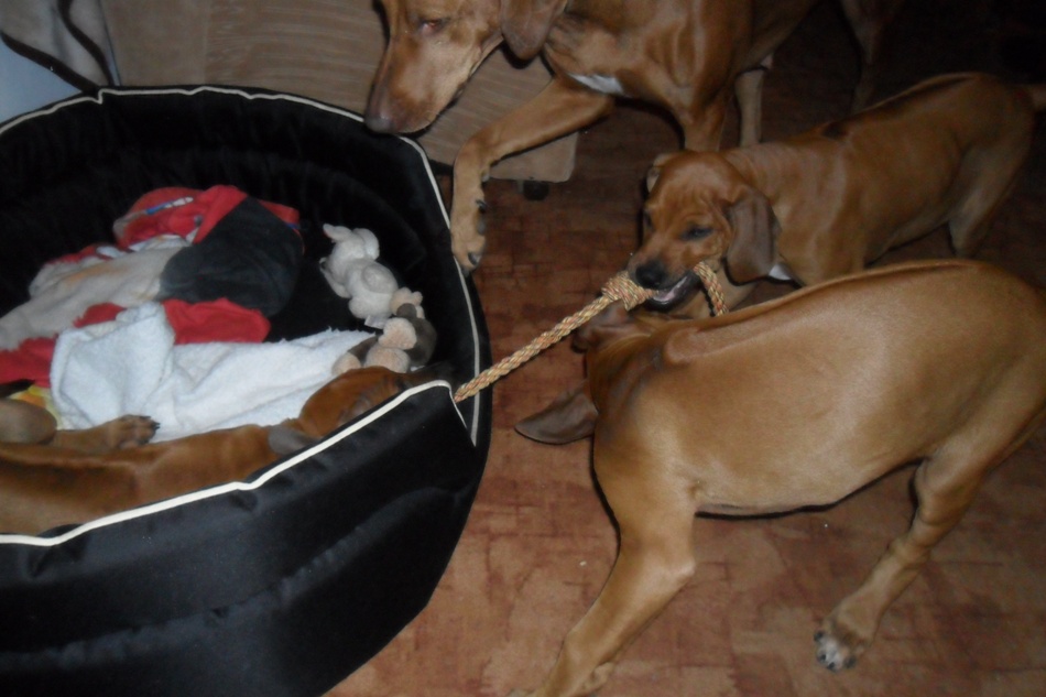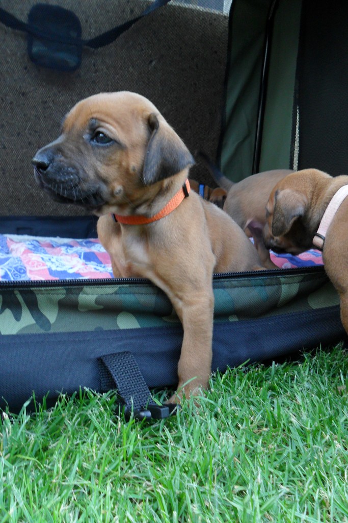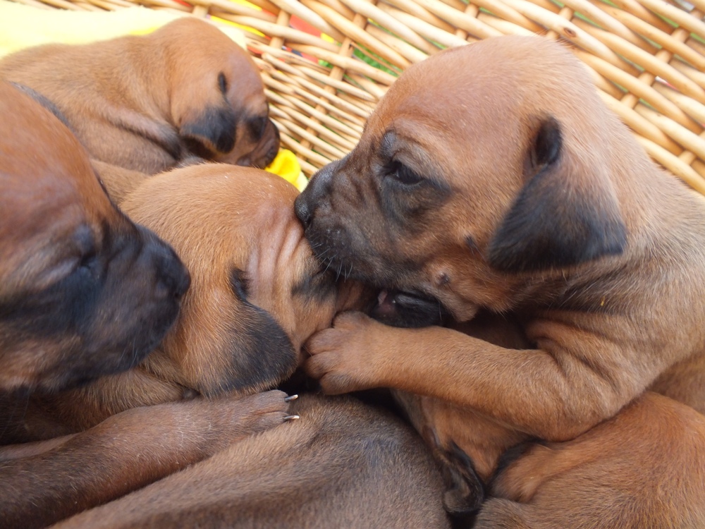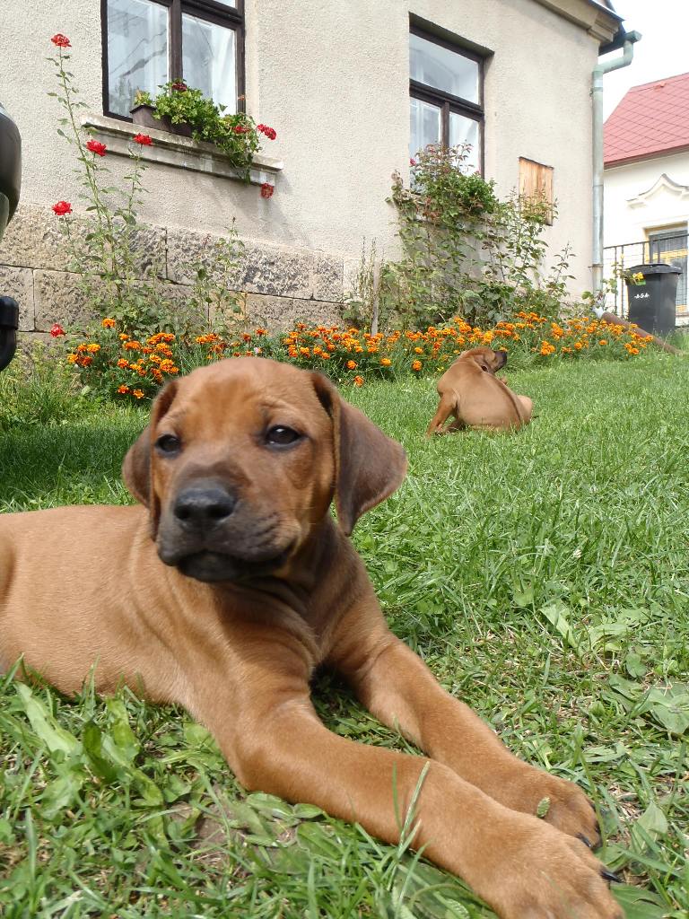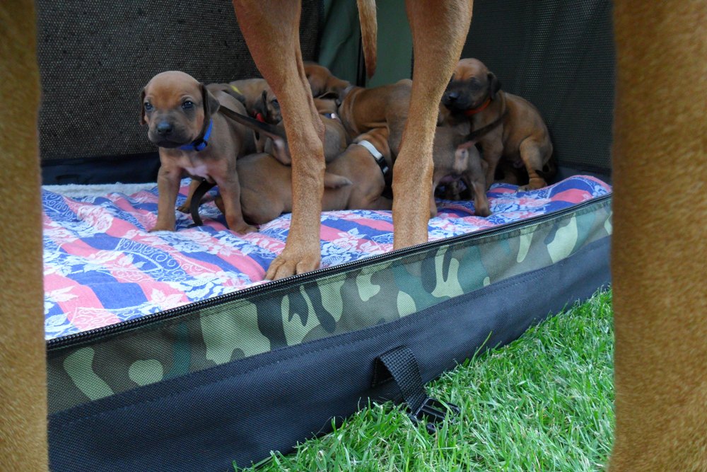 Tedy dění v porodní bedně je akčnější a akčnější. Nejen, že chodíme důstojným krokem - někteří místo chodítka využívají šprusle, ale zaznanenali jsme pokus o běh! Krakenek už dokonce v sedě laškoval se sestrou typicky ridgebackovským způsobem - žďuchal do ní pacinkou s výrazem pojď si hrát