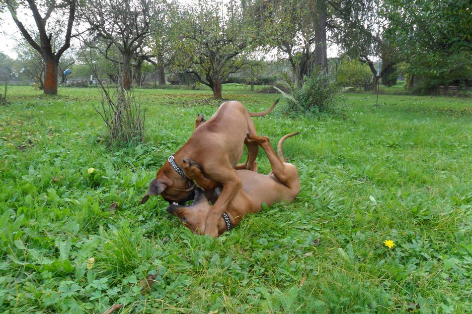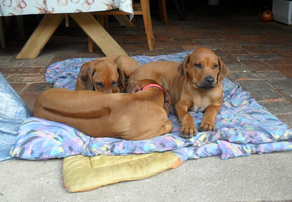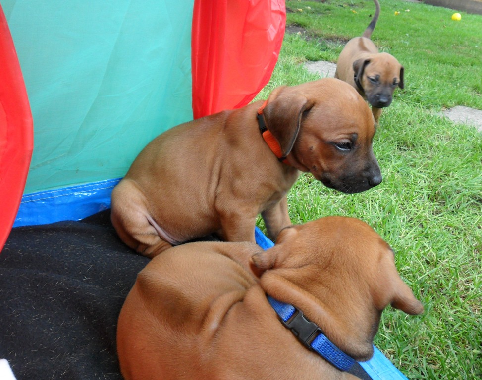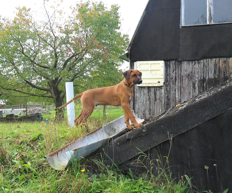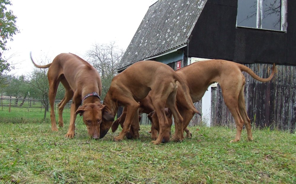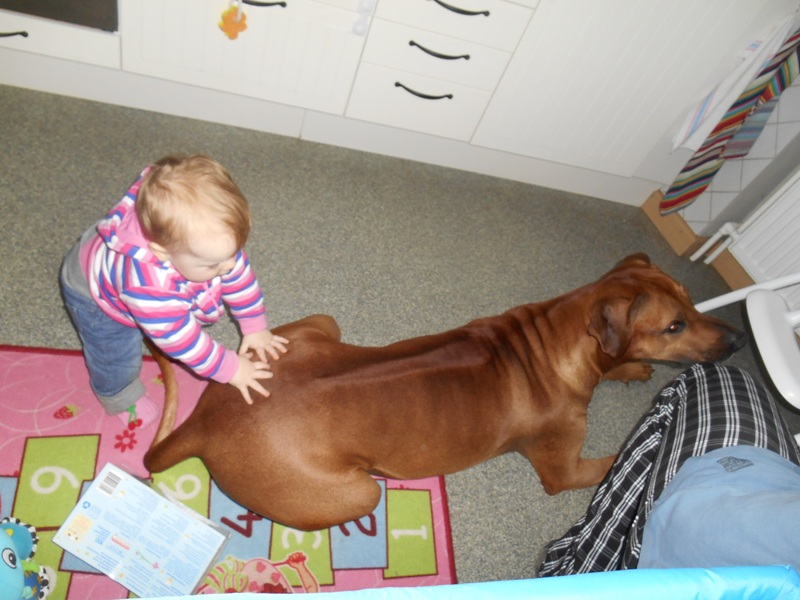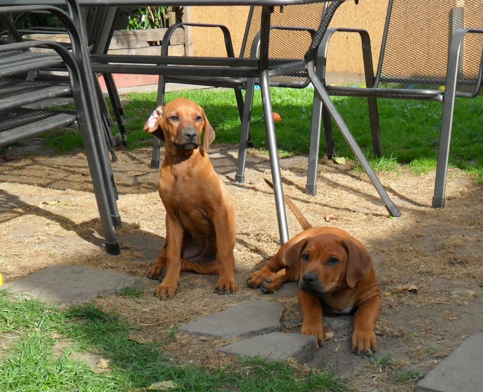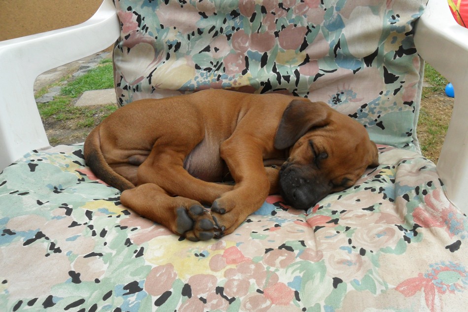 Tedy dění v porodní bedně je akčnější a akčnější. Nejen, že chodíme důstojným krokem - někteří místo chodítka využívají šprusle, ale zaznanenali jsme pokus o běh! Krakenek už dokonce v sedě laškoval se sestrou typicky ridgebackovským způsobem - žďuchal do ní pacinkou s výrazem pojď si hrát