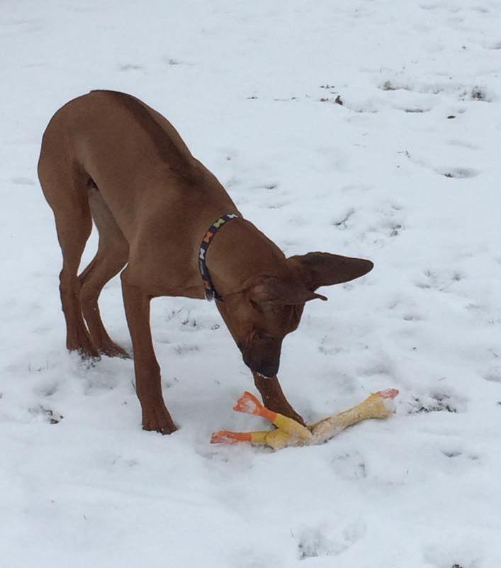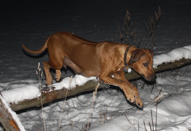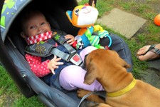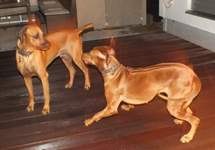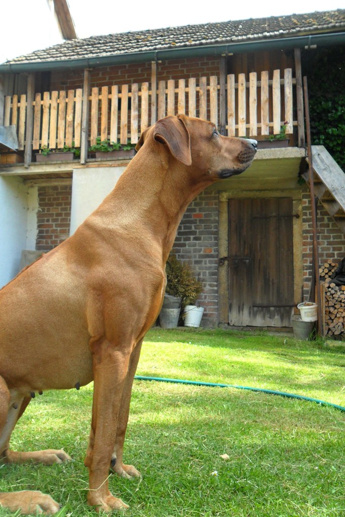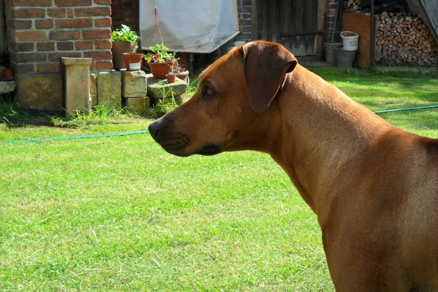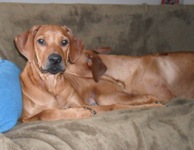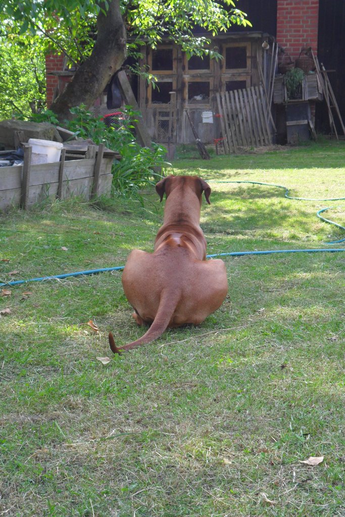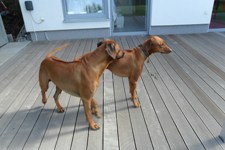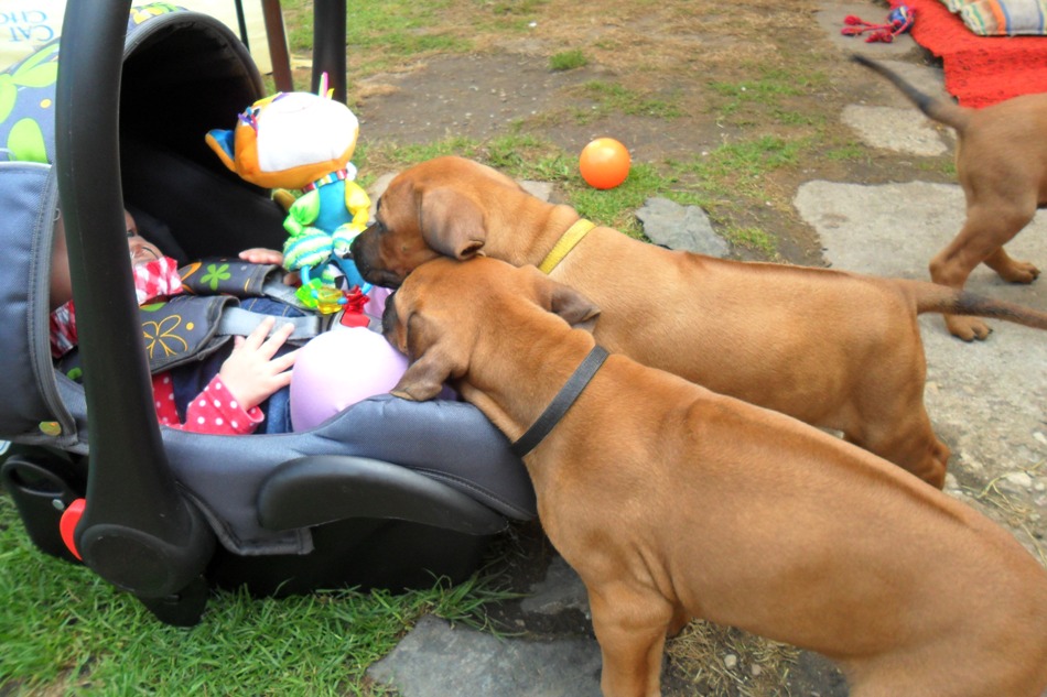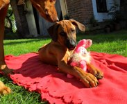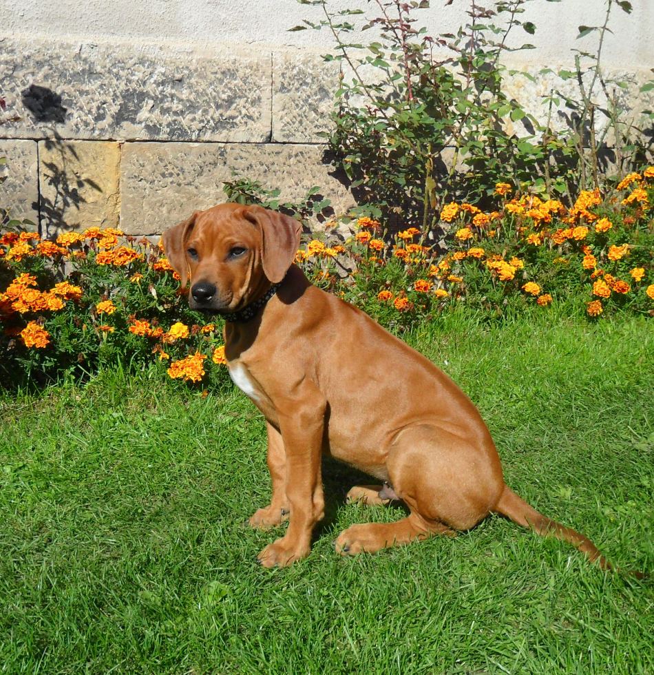Tedy dění v porodní bedně je akčnější a akčnější. Nejen, že chodíme důstojným krokem - někteří místo chodítka využívají šprusle, ale zaznanenali jsme pokus o běh! Krakenek už dokonce v sedě laškoval se sestrou typicky ridgebackovským způsobem - žďuchal do ní pacinkou s výrazem pojď si hrát
