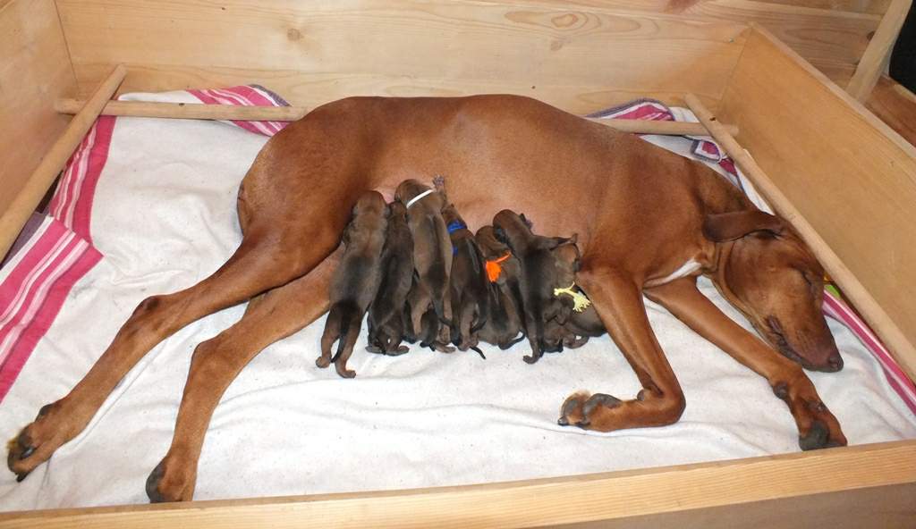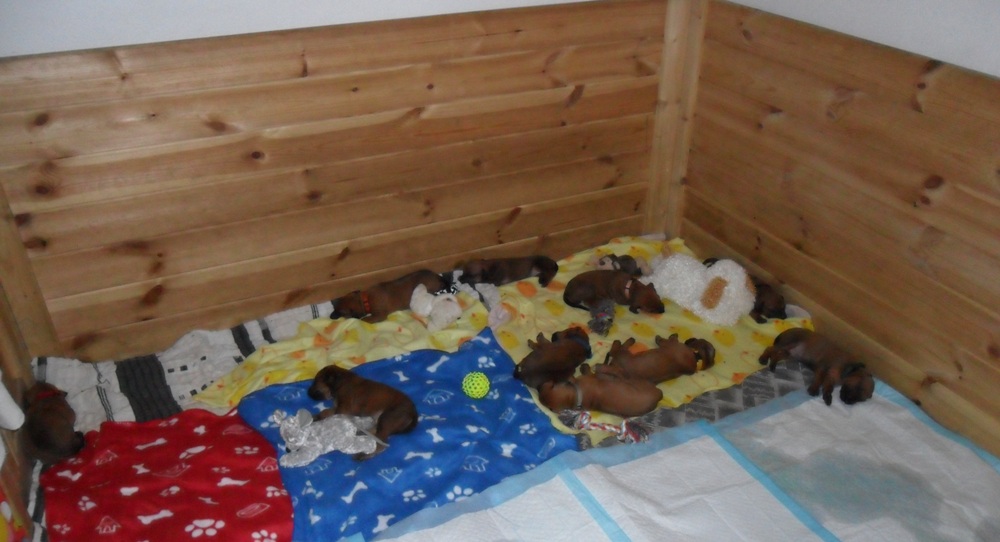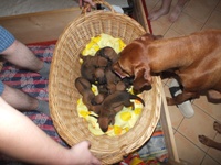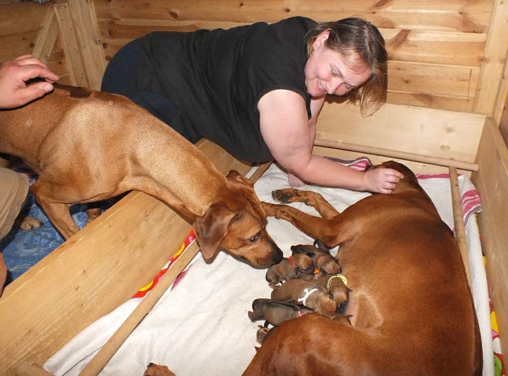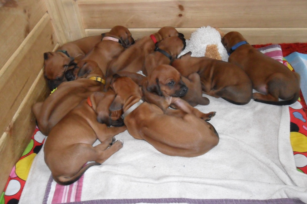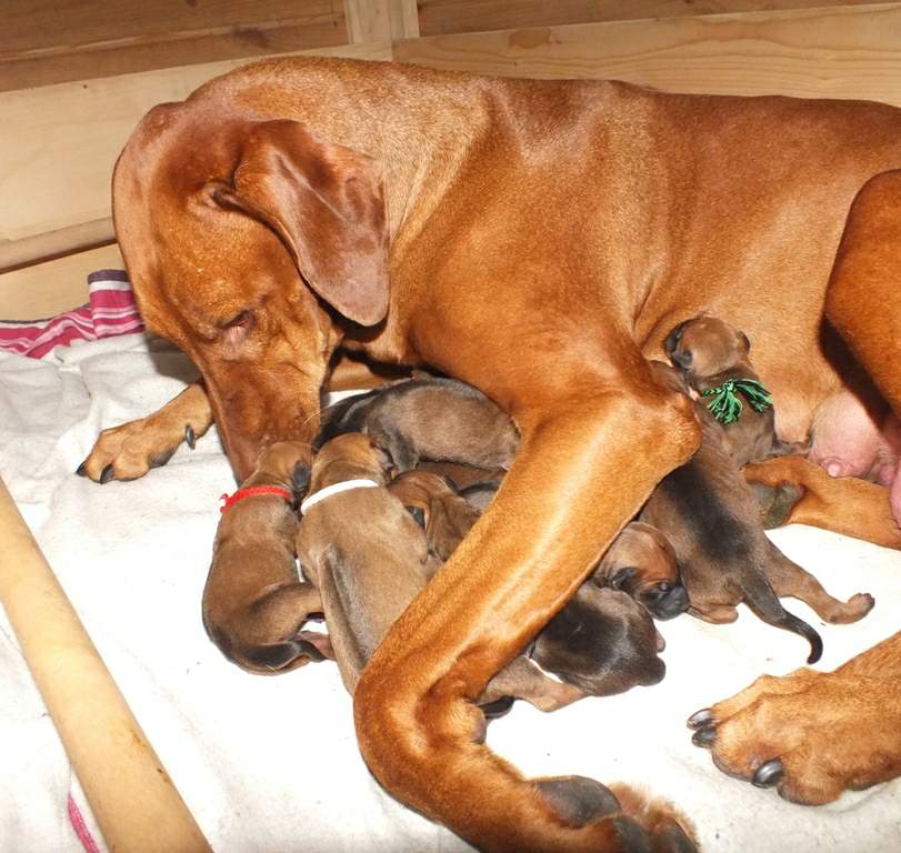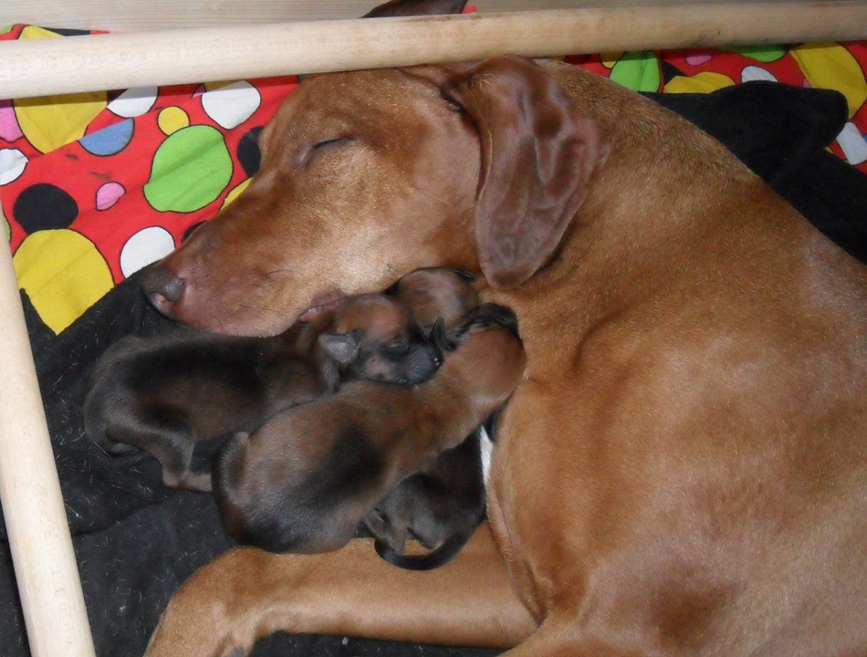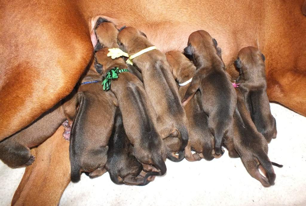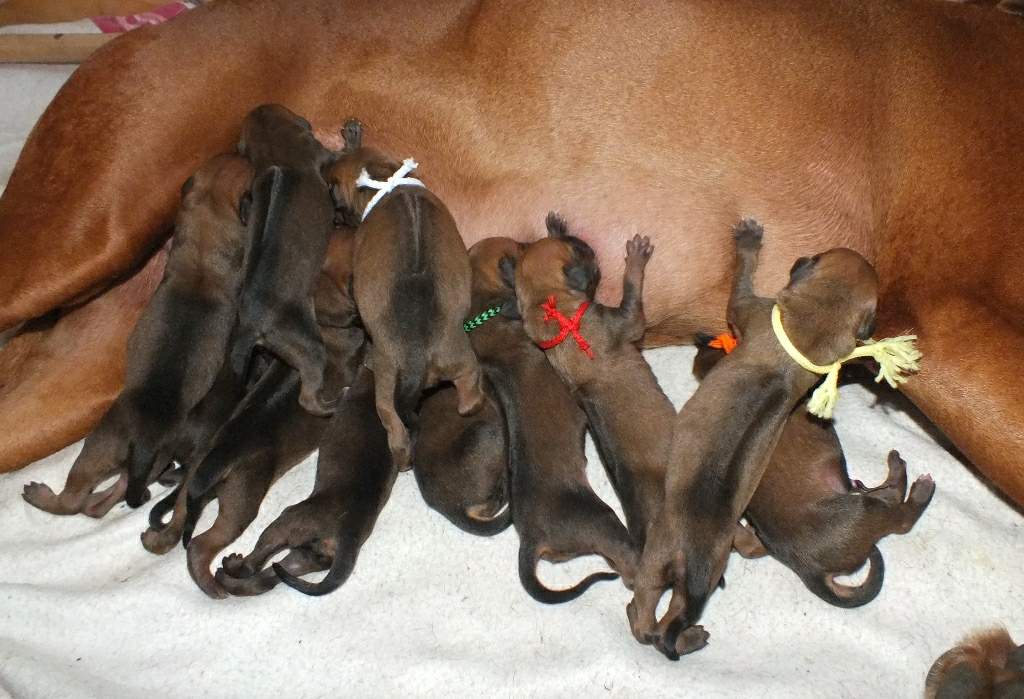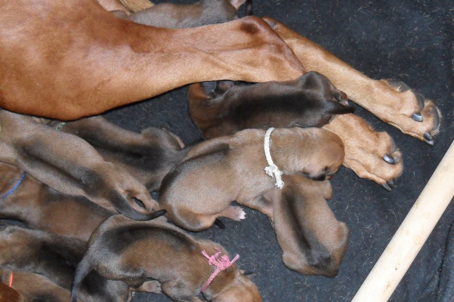 Večerní kontrola vrhu paní Renatou Janouškovcovou a Zdeňkou Masnerovou proběhla v příjemném duchu. Tato druhá prohlídka potvrdila tu první. Máme vyrovnaný vrh bez zálomků, DS, s krásnými ridgi správné délky. Kluci jsou opravdu kluci. Za dobré zprávy jsme obě dámy odměnili domácími buchtami a sebe skleničkou vína. Na zdraví miminečka naše