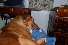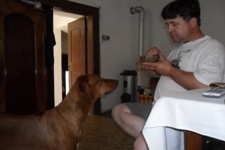 Dny po krytí ubíhají rychle, ale ne tolik, abychom už věděli...ovšem chování naší zrzulky nás dovádí pomalu k šílenství od prvních hodin po... To, že Gee ráda jí a mlsá je normální. Ale aby byla u každého, kdo si přehodí v puse slinu ze strany na stranu, tak to tu ještě nebylo.Stačí se k jídlu přiblížit a můžete si být jistí, že na vás upře svůj zrak s výrazem: jsem gravidní, potřebuji pestrou a pravidelnou stravu - dáš mi něco? Upozorňuji, že její pohled by mohl hypnotizovat. Došlo to tak daleko, že bohapustě krade i chleba. Naposled jsem se ptala Loly (přítelkyně nejmladšího syna), kam že dala starý chleba, z misky, když jí umyla. A ona mi s nechápavým výrazem sdělila, že tam ale žádný nebyl. Poté, co jsem misku ukázala Gee, ta místo obvyklého, provinilého pohledu nasadila naprosto jiný - nooo, miska, ale proč mi jí ukazuješ, když jsi mi do ní nic nedala?