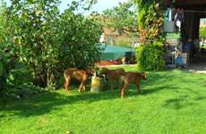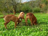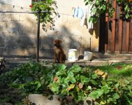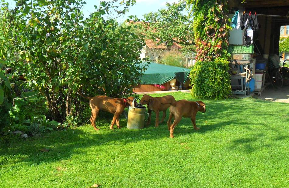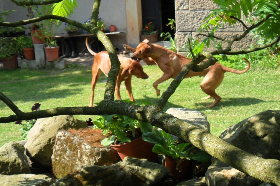 Počasí je letos krásné a tak toho využíváme k různým výletům. Chaloupka je občas vyměněna za velkou zahradu naší kamarádky Alenky. Holky to tam milují a kluci jakbysmet. Dá se tam totiž hodiny lítat, norovat myšičky, hledat bráchu nebo mámu, lovit tetu Aiminku. Také je co pozorovat, protože na jedné straně bývají ovečky a na druhé zase bývá pes. Takže si přes plot pokecáme. Semtam vynadáme těm, co jezdí okolo. Alenka nám vždycky dává vodu do kastrůlku - ona totiž nepochopila, že my jí máme nejraděj z konve. Doma je z nás potom jen hromádka odpadlíků. Kluci pořád čekají na nové páníčky a tak si Geenka užívá honiček s Cowleykem a Aimuška se věčně muchlá s Cornyskem. Všichni ostatní sourozenci se mají moc prima. Jen co bude mít panička čas dodá do galerií fotečky z nových domovů. Curlyčka aka Sheila má často fotky na FB své paničky. Všechny fotečky z víkendu jsou na našem rajčeti. A tady malá ochutnávka...