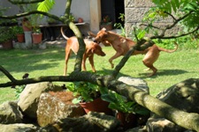 V neděli klidné brzké ráno, klubající se sluníčko a úžasná cesta. Tentokrát s paničkou a páníčkem. Přijeli jsme akorát, když se šel Carinek venčit. Když zbliknul Gee moc se mu nechtělo, ale řád je řád. Gee zatím zkontrolovala zahradu a terasu - stylem tady to bylo, tak to dáme na stejném místě. Pak už jsme Carinka slyšeli capkat po schodech. A měla jsem pocit, že takhle nějak pracují profesionálové. Carínek - chceš pusu? Gee - netřeba:-). Než sešla schody Martina bylo hotovo. Prostě přijeli jsme naskok na skok. Děvčata se pozdravili už za svázaného stavu. Jak je našim dobrým zvykem ve foťáku došly baterky, ale podstatné bylo zachyceno. Pak už jen káva, trochu pomlouvání našich zlatíček a klidná cesta domů.