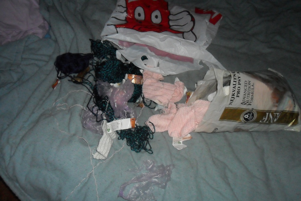 V pátek byly děvčata po dlouhé době doma samy. Šumování věcí už jsme neřešili opravdu dlouho. Jediné, co nemůžeme Gee odnaučit je praní páníčkových kapesníků. Mumášek zase devastuje knoflíky. Prostě je úplně rozžďabe. Ovšem tento den, to byla jiná. Naše madam vytahala dvě igelitky s pletením. Myslela jsem, že mě vážně trefí. A ještě se tvářila, že neví, proč nejásám. Vysvětlila jsem jí, že jestli mi tím chtěla naznačit, že chce mimisům uplést svetříky, tak se zbláznila. Přeci proto jsme je naplánovali na léto, abychom nemuseli řešit oblečky. No, nejsem si jistá, že to pochopila nebo vzala na vědomí. Dvě hodiny koukala na to, jak se snažím rozmotat svetr a klubíčka k němu náležející od čtverečků, uháčkovaných na plánovaný přehoz. S výrazem - vidíš jak ti to jde pak odešla spát.