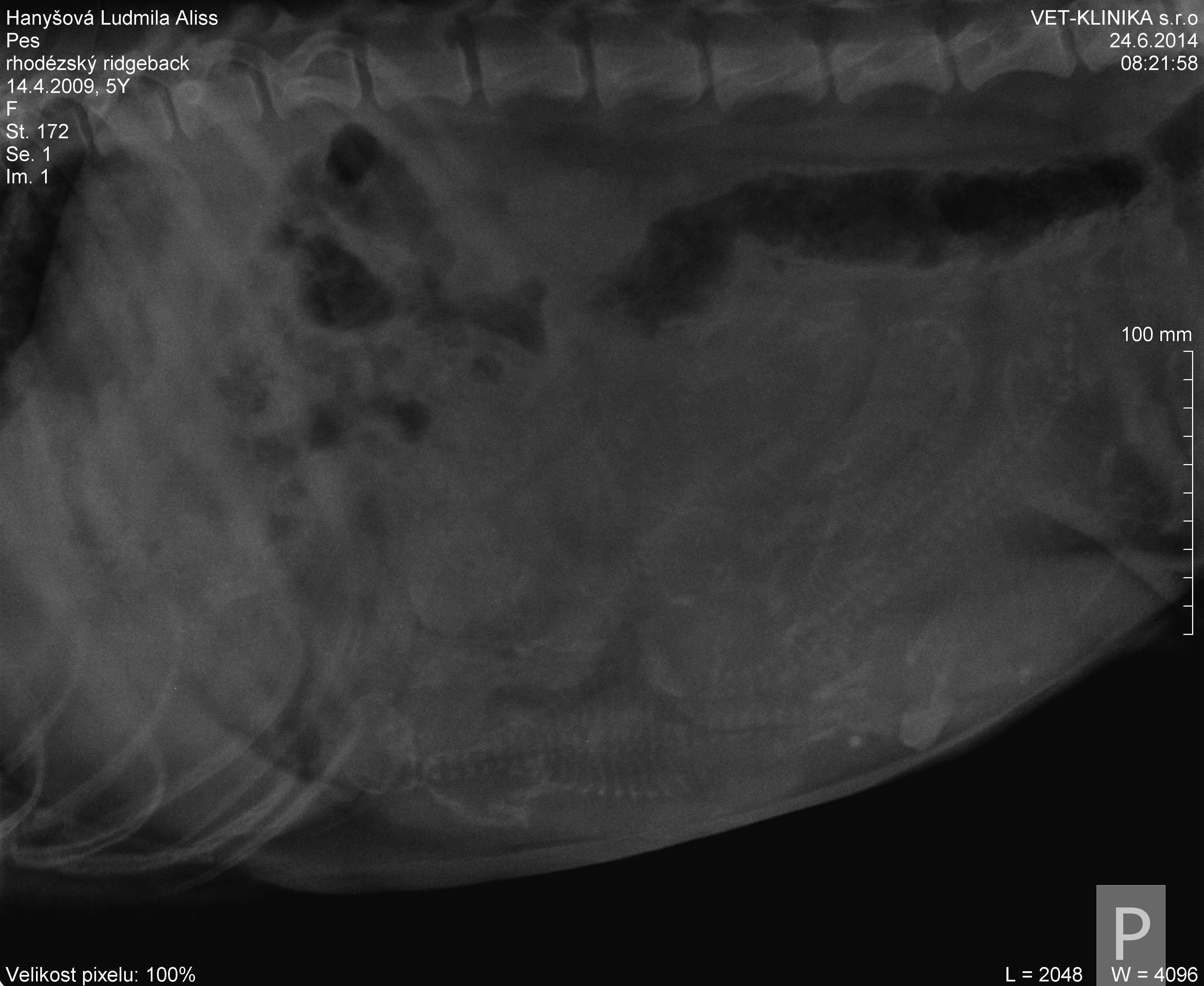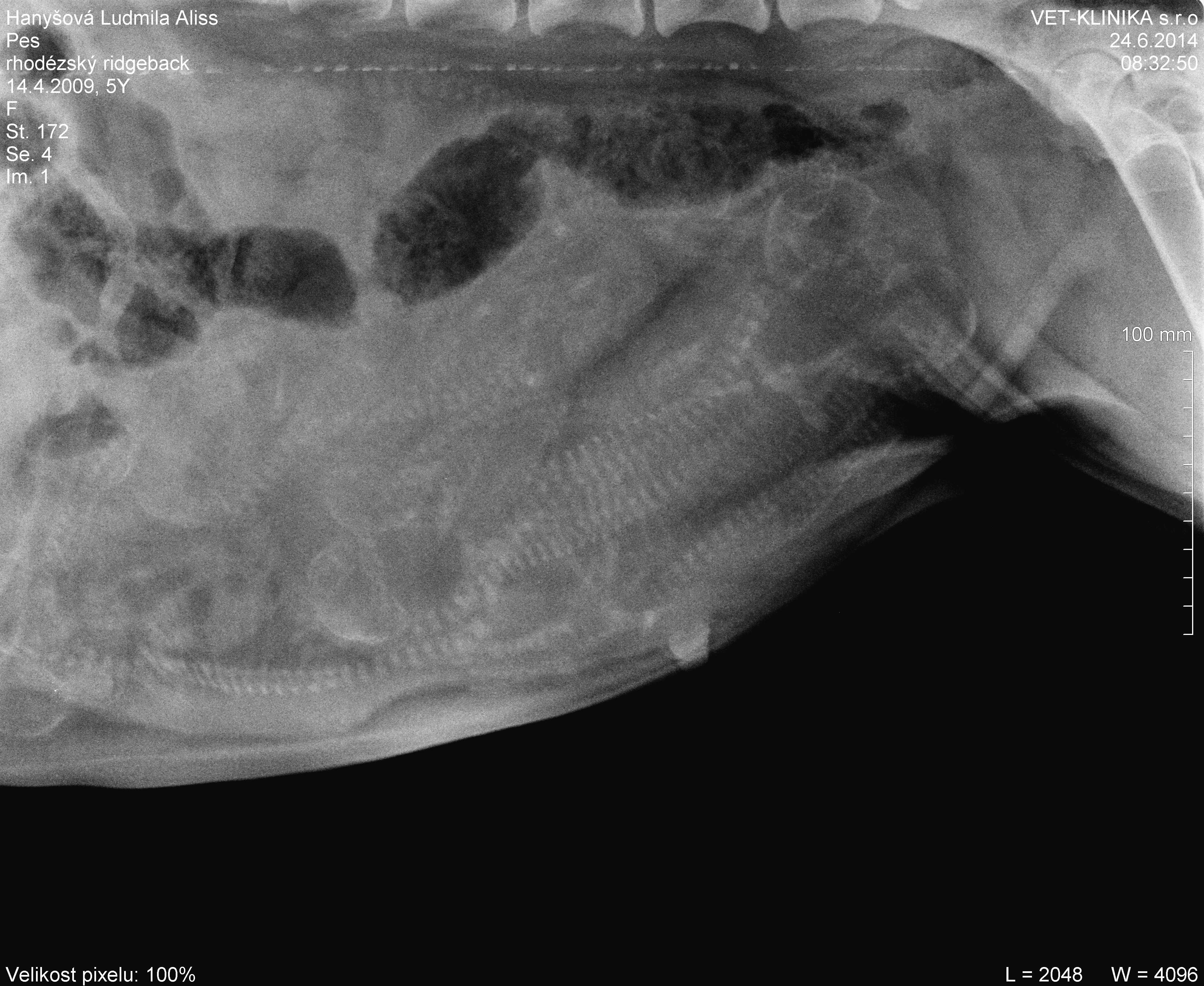 Tak jsme měli tentokrát pocit, že potřebujeme mít jistotu. Už dvakrát nám doktoři říkali, že těch miminek nebude moc...dvakrát jsme skončili s počtem 14. Tentokrát už po sonu říkala paní doktorka, že tohle vážně nebude početný vrh. Faktem je, že jsem měla z Geenky pocity, že si březost užívá, ale že by bylo bříško jóó plné mi rozhodně nepřišlo. A tak jsme se poprvé v životě vypravili nechat si udělat rtg fotečku. No, pan doktor Ekr pravil, že 14 jich rozhodně není a že nám přeje šťastný porod i počet