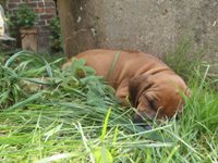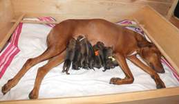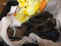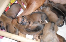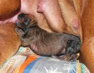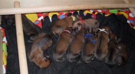 Veškerý čas trávíme jídlem, spánkem a starostí o to, aby panička měla co prát. Naše přesuny po bedně jsou rychlejší a rychlejší. Růžovka začala jako první s epidemií rozlepování oček. V sobotu pan hnědý značně vrávoravým, ale krokem vyrazil za sourozenci. Sice svůj trysk proložil pár kotrmelci leč vytrval. Zbytek tlupy ho zdatně následuje. Dnes jsme tu měli paní vet - jednak byla překvapená, jak dobře vypadá Geenka (pamatuje Archynku, která první týden se štěndy nejedla) a moc se jí líbili štěnísci. Ani nechtěla věřit jak byli při porodu drobní a jak to hezky dohnali. Mládež prošla prvním stříháním drápků a prvním odčervením. Jejich komentáře zde raději nebudeme zveřejňovat - myslím, že bychom je museli vypípat. Ale po zapití máminým mlíčkem nás vzali na milost. Už se těším jak se mi zase v noci pomstí a my budeme několikrát převlékat celou bednu. Fotečky z tohoto týdne tady