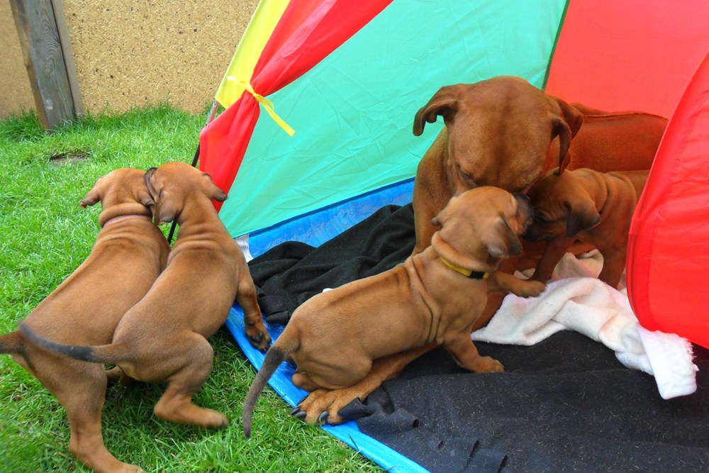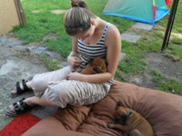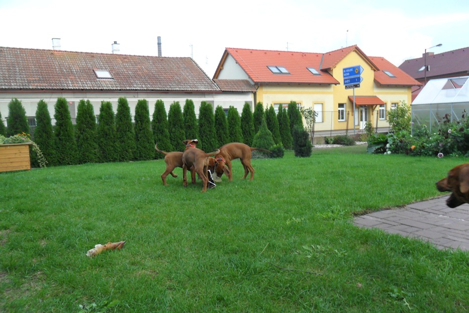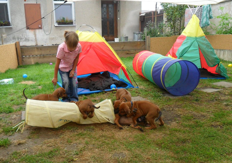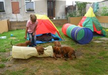 Pátý týden byl ve znamení procvičování rozborky a zborky našeho hřišťátka pro děti. Vždycky jsme ho hezky postavili, dětičky začaly řádit a za hodinu dvě začalo bouřit a zase se sklízelo. Začali jsme také vítat návštěvy velké i malé. Byla tu Alenka se sestrou a všemi čtyřmi dětmi. I když nám skoro 2 hodiny pršelo, tak jsme si to v altánu moc užili a ani jsme nic neuklízeli. Plachta se ukázala jako dobré řešení - pokud moc nefouká. Alenka udělala spoustu fotek a jen až bude mít chvilku, tak je dáme na web či Fb. Mimísci milují lítání tunelem - bitky v něm mají zřejmě velké kouzlo. Stany neustále prubuje i matka s tetou Aime. Papkáme už kaši, granulky, milujeme tvarůžek s pribináčky, ale zapíjíme rádi máminým mlíčkem. Panička říkala, že už nám přidělí jména, abychom si na ně mohli pomalu zvykat. Fotky z našeho řádění tady.