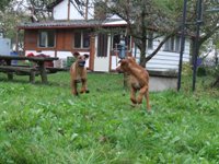 Ježdění autem nás baví a doma je to pořád stejné a tak jsme zase jednou vyrazili na chaloupku. Měli jsme to slíbeno. Na chaloupce je tpo vždycky prima, ale tentokrát to nemělo chybu. Zažili jsme coursing za živou návnadou. Dědečkovi utekl králík a my ho statečně lovili. To vám byla legrace - tedy králík se moc nesmál, ale nám se to vážně líbilo. Škoda, že panička nemá lepší foťák a není rychlejší. To by byly fotky! Taky byl za námi Corey aka Rustin. Je to pěkně ryhlá žížala a je s ním pořád legrace.