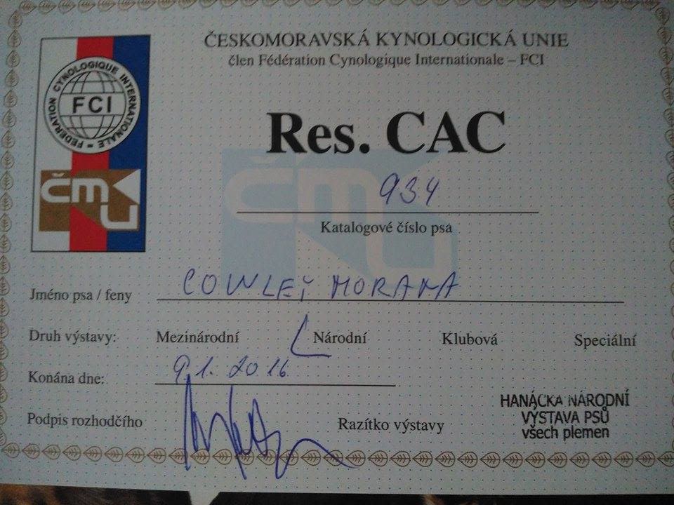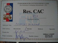 Cowleyk využil druhou letošní sobotu k výletu na Hanáckou výstavu do Brna. Dopadl opravdu skvostně a s posudkem :18 měsiců pes, dobře vyvážených proporcí s korektní hlavou, ucho by mohlo být lépe neseno, dobře nasazeny krk, milá povaha, dobře předvedený!!! V2 res.CAC. Jsme moc pyšní a šťastní! Škoda, že Connynka musela vynechat, protože se rozhodla odbýt si hárání právě teď, ale určitě bude spousta příležitostí se vidět.