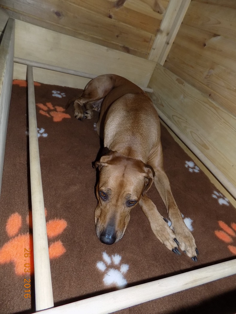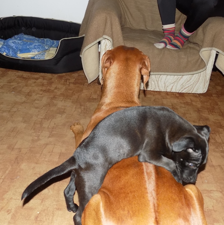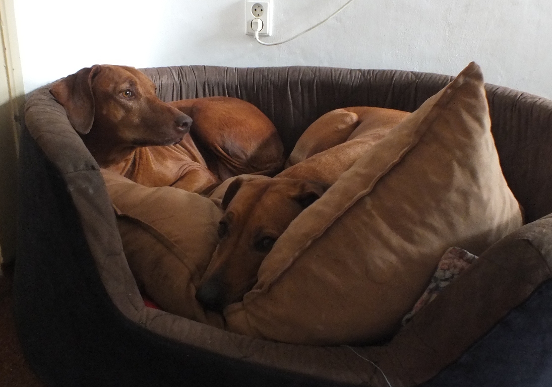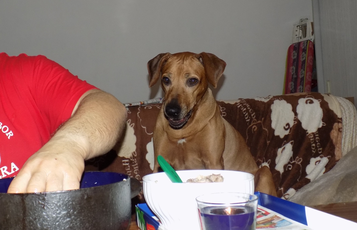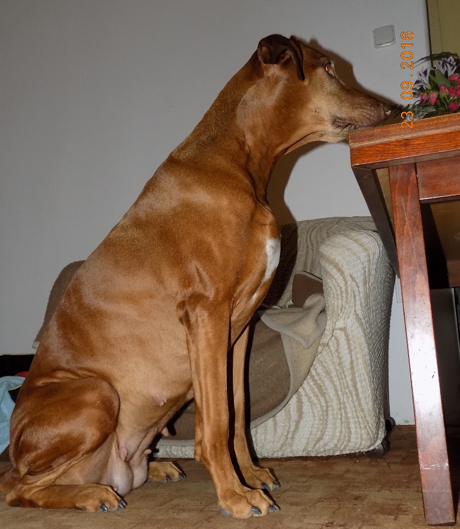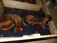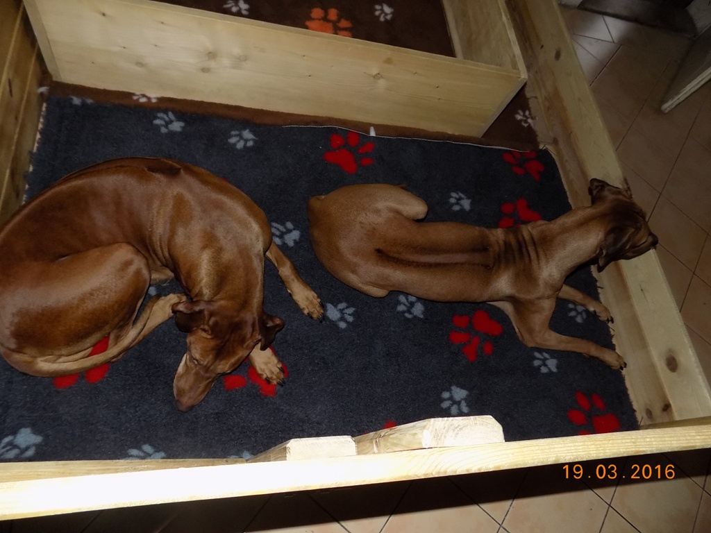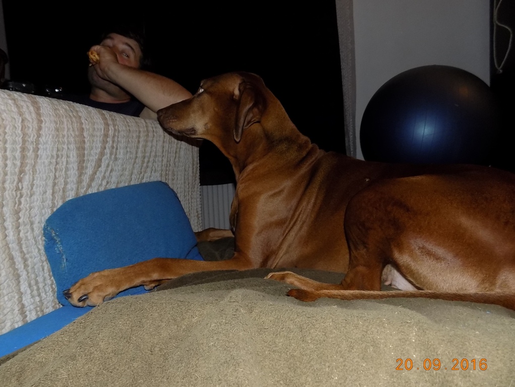 Geenuščino nechutenství odešlo tak rychle jak přišlo...dokáže hned po své baště za člověkem přijít a tvářit se, že jídlo neviděla dny, co dny týdny, co týdny roky! Ráda si skousne buvolí kostičku s dršťkama (kousek nechá Aimince) a pak konečně unavená odpadne do pelíšku, který se začíná nějak zcvrkávat...když se jí nepodaří něco z páníčků vydolovat - trucuje.