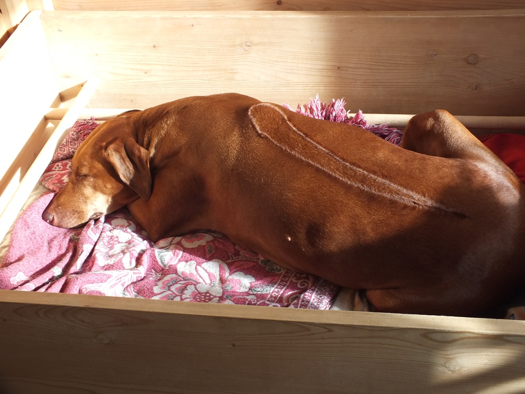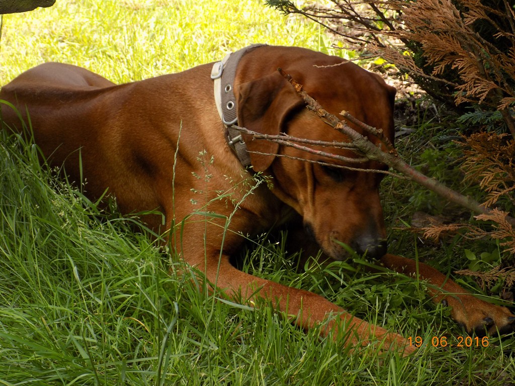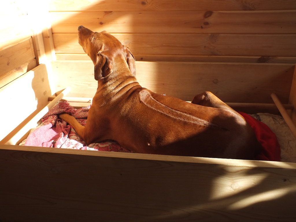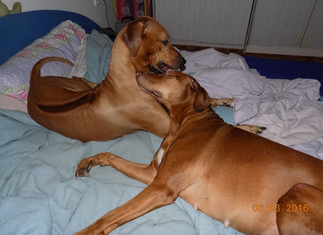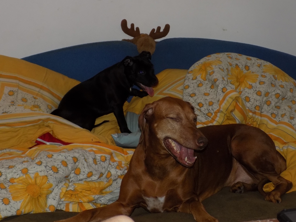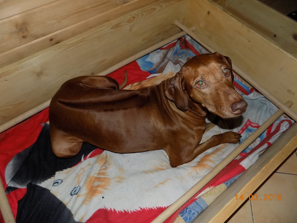 Geenuščino nechutenství odešlo tak rychle jak přišlo...dokáže hned po své baště za člověkem přijít a tvářit se, že jídlo neviděla dny, co dny týdny, co týdny roky! Ráda si skousne buvolí kostičku s dršťkama (kousek nechá Aimince) a pak konečně unavená odpadne do pelíšku, který se začíná nějak zcvrkávat...když se jí nepodaří něco z páníčků vydolovat - trucuje.