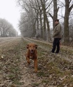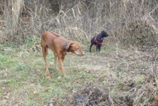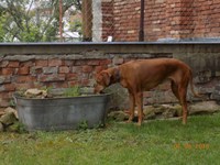Ve čtvrtek v plánu stejný scénář...první zádrhel nastal na našem největším republikovém parkovišti - tedy dálnici. Díky uzavírkám (s kterými začali v úterý hned po našem průjezdu)jsme nachytali víc než hodinu zpoždění. Když jsme konečně dojeli, tak Geenuška opět prostudovala zahradu. Díky počasí nebylo po sněhu ani památky a tak aspoň zkoušela jakou má Taariq vodu ve svých kalužích. Trávu dobrou má - to ví už z minula. Když vyžahla všechna vodstva včetně přinesených, přišel na scénu náš pan důležitý. Vypadalo, že zas nebude ani romantika a ani to půlkolečko co posledně...a ejhle, najednou Gee došlo, že si vlastně neprohlédla zahradu, nezkontrolovala sousedovic parcely a že se s Taariqem neproběhli...tak jsme naše zrzavé štěstí loupli do auta a šli si dát kafíčko a výborné moravské koláčky. Po pauze nás zajímalo jestli byl výlet po naší úžasné dálnici zbytečný či nikoli. Myslím, že tentokrát si to Taariq užil víc než v úterý, protože se měl čas i předvést, zasvádět si a pak odvést přesně to, co se od něj čeká. Byli oba s Gee moc šikovní a nám už teď nezbývá než čekat. Díky Taariqu