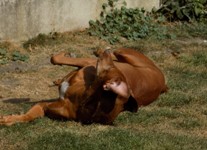 Stále trvá, že Geenka nejvíce tráví čas urizováním kohokoli kdo jí :-) jde jí to dobře a je v tom vytrvalá...její hrudník už má rozměry takřka Samanthy Fox - 87cm a pas se již také nedá nazývat útlým - 76cm. Zítra zajedeme za paní doktorkou a trochu se zvážíme. Užíváme sluníčko, které nás po týdnu navštívilo...jo a taky jsme tento týden zjistili, že rodit tentokráte (stejně jako drahná léta předtím) nebudeme pod zlatým deštěm, ale v jahodách. Co na tom, že panička byla ráda, jak se ty jahůdky samoobnovují a že bude mít zase příští rok do lambrusca místo ledu - tydlitý tydlidá - děvčata to vidí jinak. Jo a postavili jsme ohrádku a porodní bednu - nejdřív to vypadalo, že všichni budeme v paniččině dozorové půlce, ale pak jsme si každá vyzkoušela tu správnou půlku.