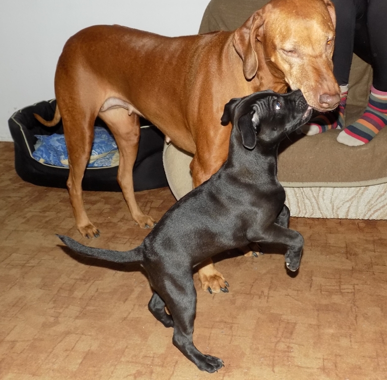 Advent začal pošmourně, ale nám ho rozsvítila prima návštěva...naši rodinnou smečku posílila malá černá čertice Izren. Zatím Geenka byla po seznámení spokojená, že je tu někdo trhlejší a bláznivější než ona, Aiminka se držela v dostatečné vzdálenosti. Bylo super sledovat, jak dokáže malá Izren tetičku Gee vrátit do štěněcích let a být tu déle asi bychom to tu brzy nepoznali :-). Aiminka se seznamovala z bezpečné vzdálenosti a kdyby bylo víc času určitě by také zjistila, že s touhle holkou bude legrace. Takhle se jen u páníčků ujišťovala, že si tu malou střelu jistě odvezou :-).