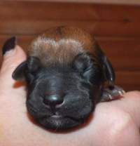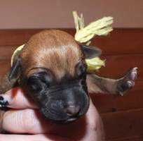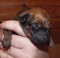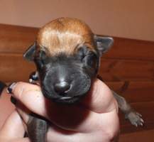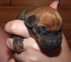 18. 8. druhá kontrola vrhu - potvrzen výsledek té první :-) žádné DS, zálomek a mnoho bílé barvy. Ridge správné délky, varlátka sestouplá. Cuffynka má nepatrnou kýlu. Vrh je vyrovnaný s pěkným pigmentem.