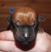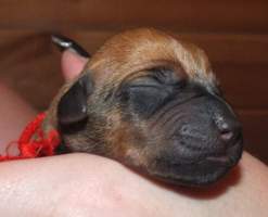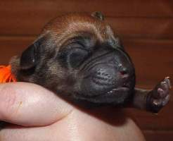 30. 6. začala Geenka rodit svá první štěňátka. Jako první v 15.19hod přišla na svět bezridgová holčička. Angee na ní koukala dost nedůvěřivě. Po první puse s výrazem prý jsi moje, ji umyla a nechala napít. To bylo první a poslední štěndo, které porodila v porodní bedně. Opravdu nechápu, proč se pokaždé vášníme s boxem a ohrádkou. I když ohrádku Gee ctila jen si do ní nechala přinést svůj pelíšek z obýváku. Zřemě měla pocit, že ten je k rození jako dělaný. V 15.45hod vykoukla růžovka a malou chvíli po ní v 15.55hod už tu byla oranžová. Ty už Angeenka vzorově očistila a o pupečníkové šňůry jsme se s ní vyloženě prali. Po malé pauze v 16.35hod je tu první klučík - modrý a hned za ním tryskem v 16.44hod červená. Další pár zahájila žlutá v 17.37hod následovaná hnědým bráškou bez ridge. V 18.18hod se nám narodil klučík s jednou korunkou (bohužel byl málo vitální a 4. 7. zemřel) následovaný černým bráškou v 18.33hod. Posledním narozeným párem byla šedá v 19.05hod se zeleným bráškou v 19.20hod. Celý porod zvládla naše princezna za 4hod. Po zkušenostech s Archynkou nádherný zážitek. Jsi prostě úžasná mravenečku náš zrzavý. A jestli se ptáte proč jsme kradli pupečníkové šňůry Geence od no...od huby, tak pro laboratoř, která se z nich snaží získat kmenové buňky, které můžou pomoci jiným nemocným pejskům.
